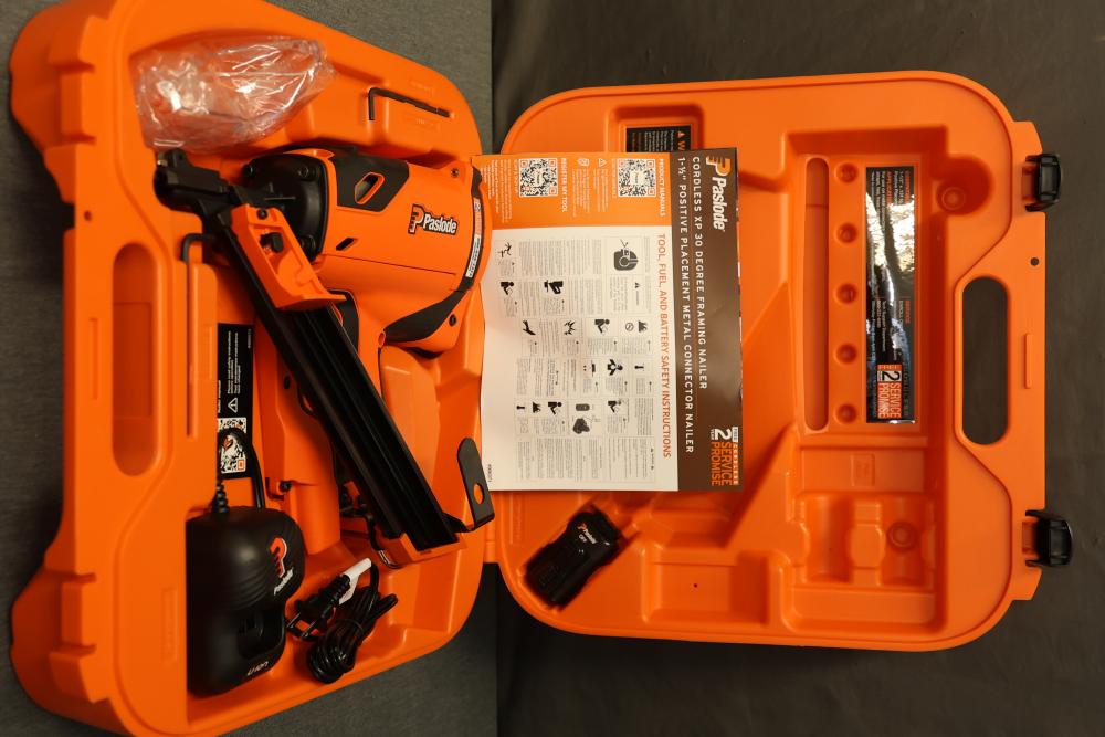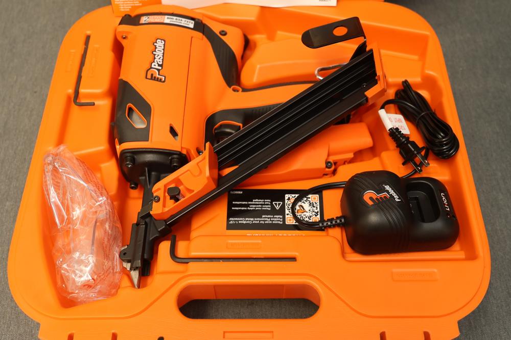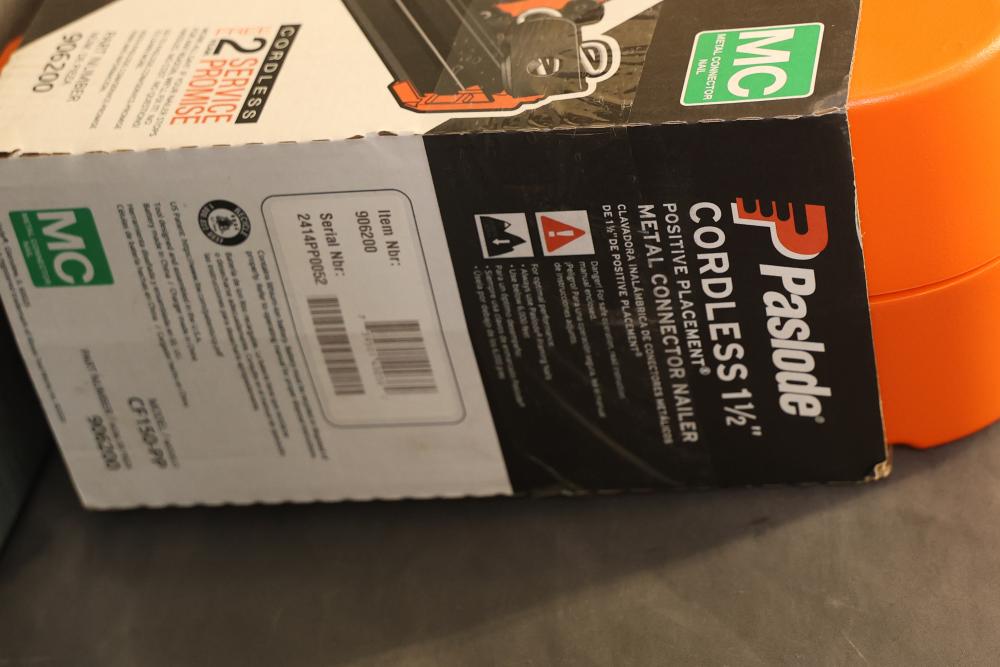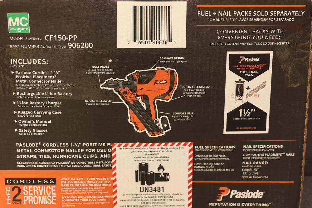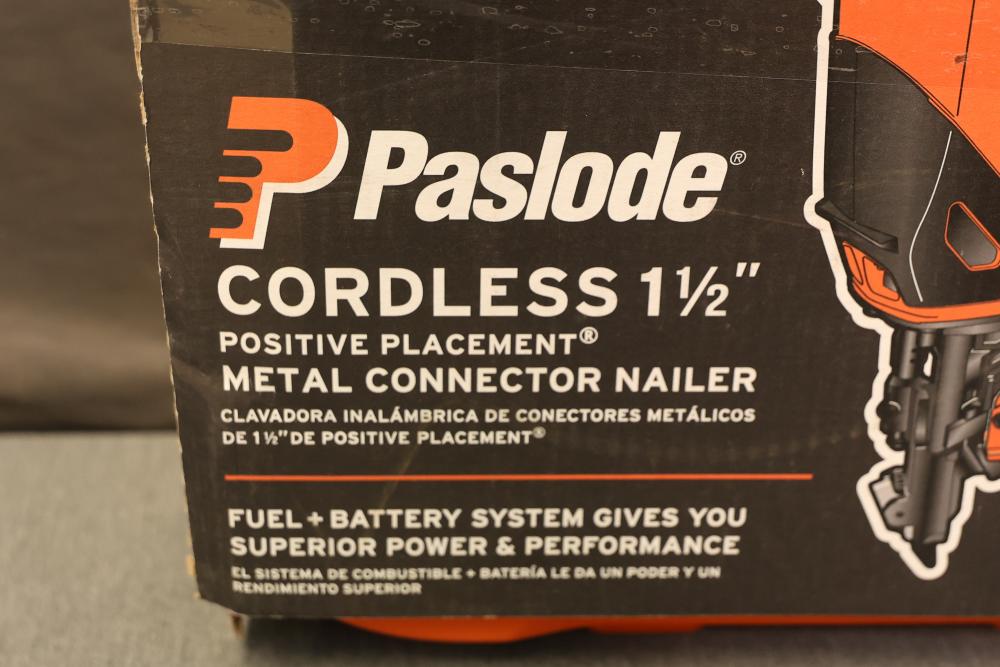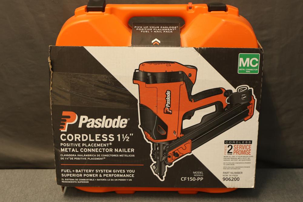 Paslode CF150-PP 1.5 Inch Cordless Metal Connector Nailer. Features a cordless design for Positive Placement of metal connectors. Includes original carrying case, rechargeable lithium-ion battery, and charger. Missing fuel cell and drive nails. Pickup only.