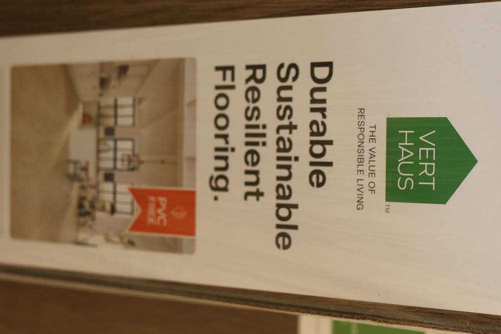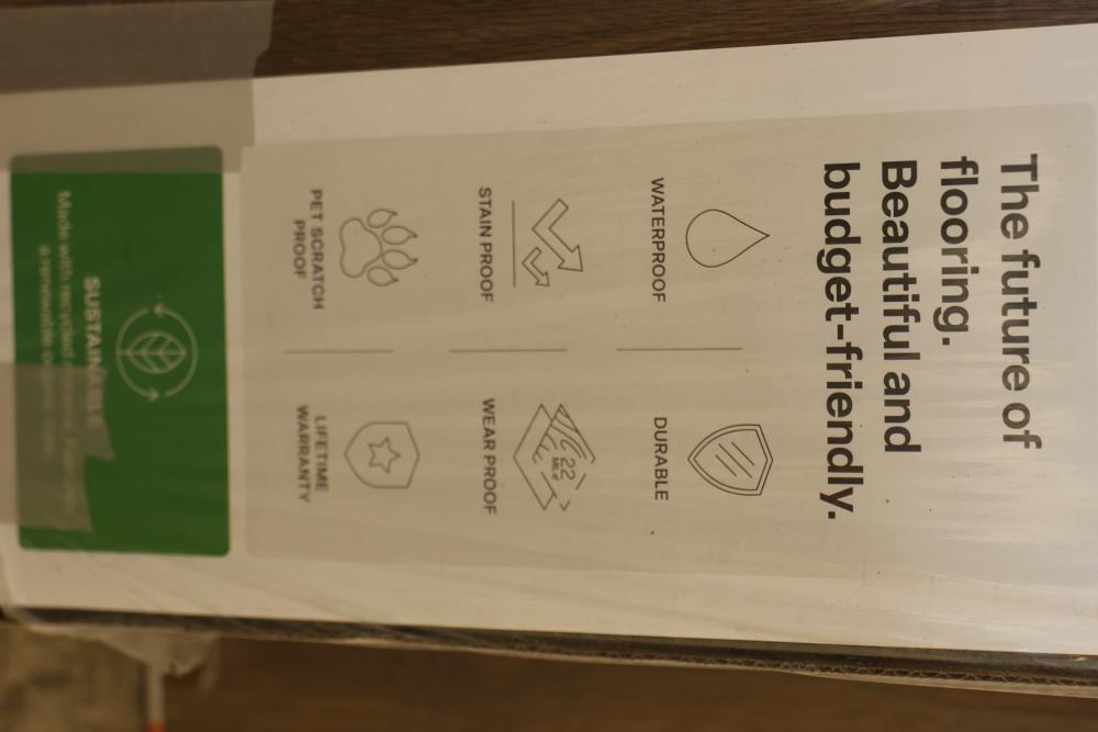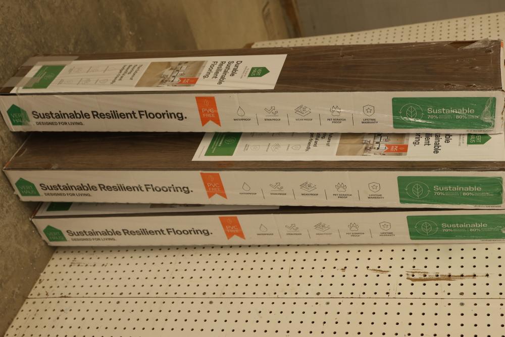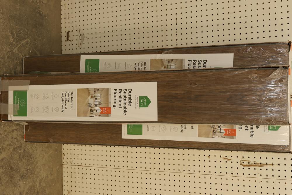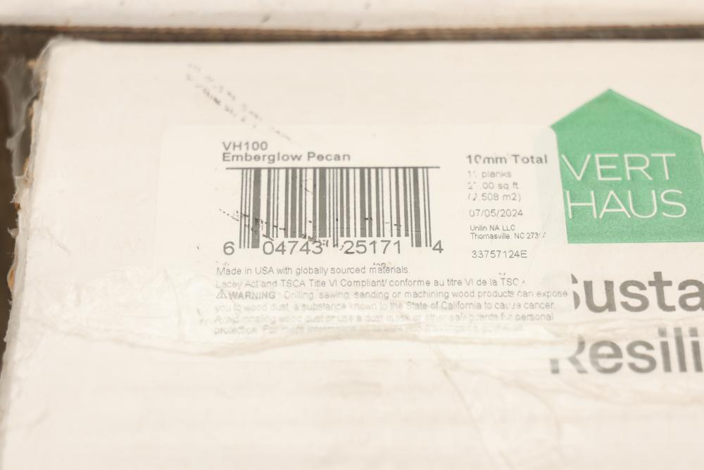 Vert Haus VH100 Emberglow Pecan Resilient Flooring, 10 mm total thickness, with plank dimensions of 7.4 inches x 47.2 inches. Each case contains 27 square feet of flooring, totaling 5 cases in this set. Designed to be waterproof, stain proof, pet scratch proof, and durable, with a lifetime warranty. Pickup only.