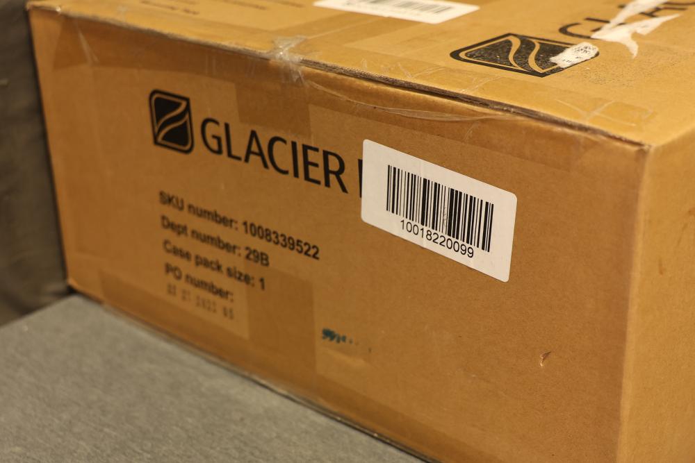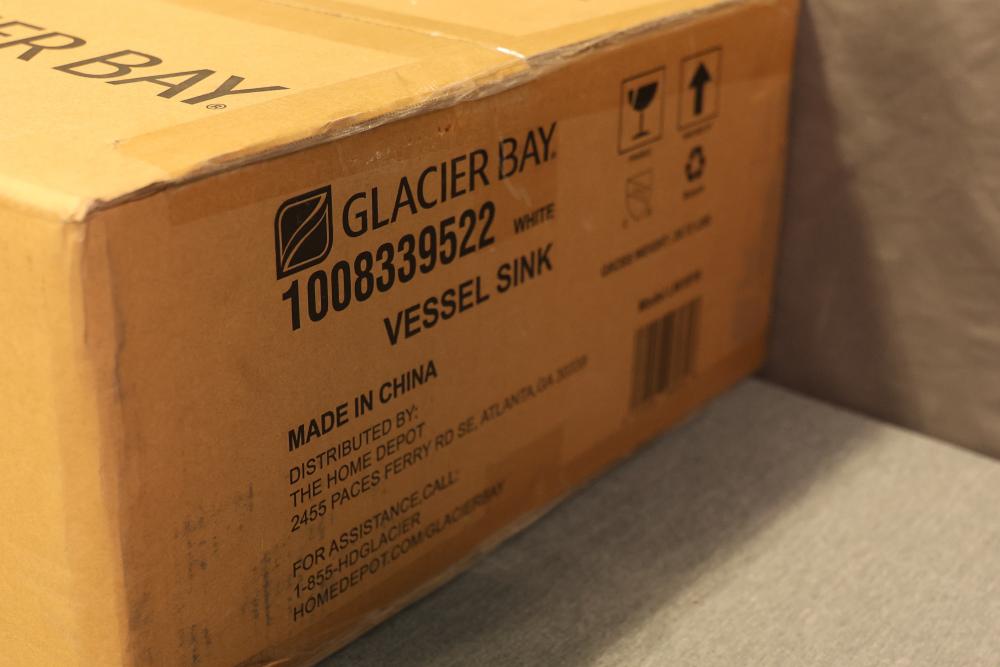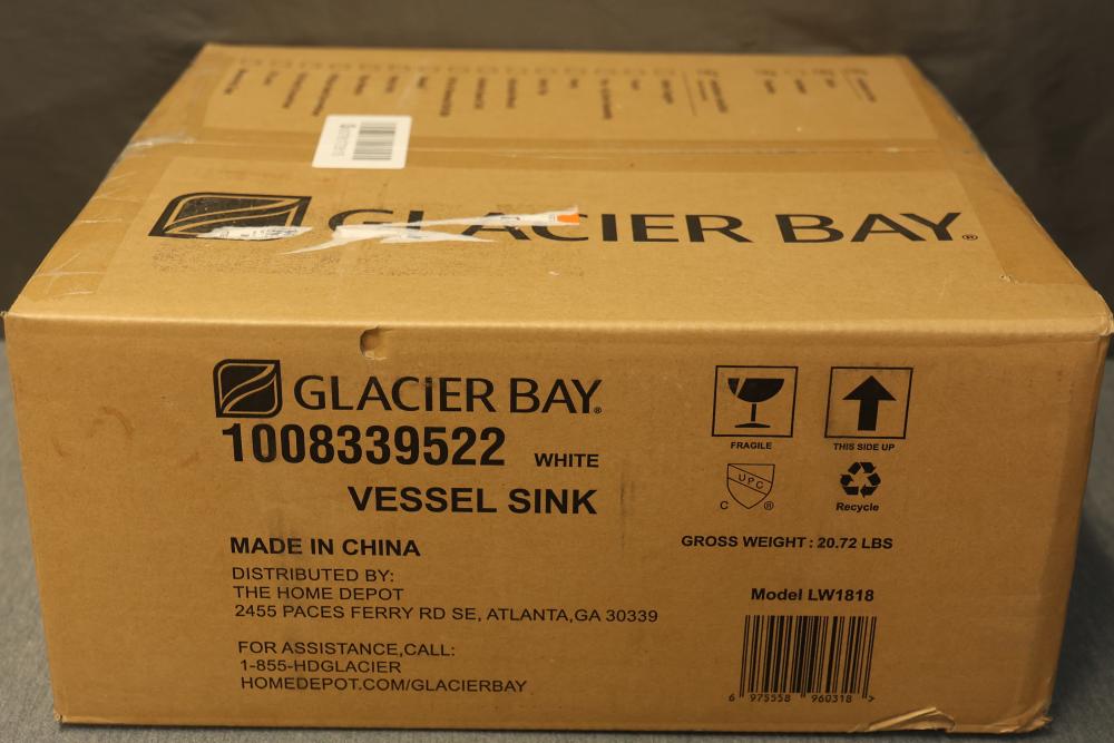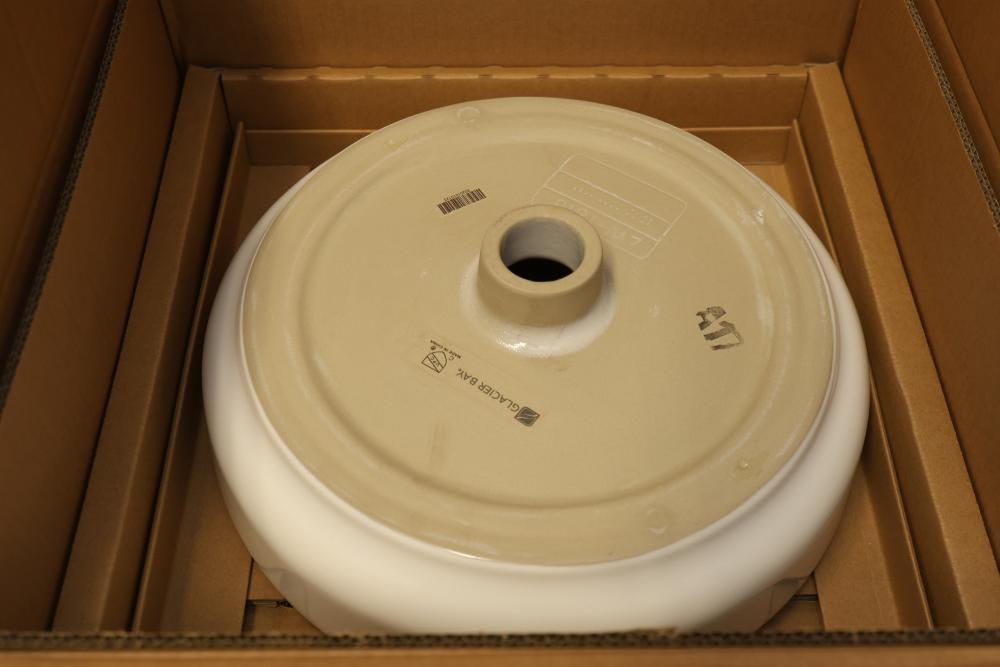 Glacier Bay LW1818 16 Inch Ceramic Round Vessel Sink in White. Made from durable ceramic with a glossy white finish. The vessel sink is round and measures 16 inches in diameter. It arrives in original packaging with no visible signs of use or damage. Model LW1818. Pickup only.