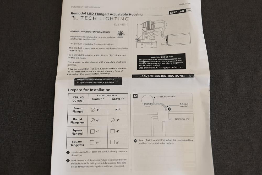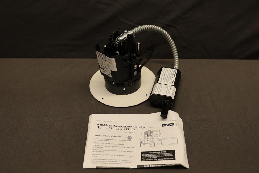 Element E3RRL-LHWD6AN 3 Inch 17W LED Round Adjustable Downlight Flangeless Remodel Housing. Features adjustable functionality designed for remodel installation, suitable for damp and wet locations when used with trims. Includes original packaging and installation instructions. Pickup only.