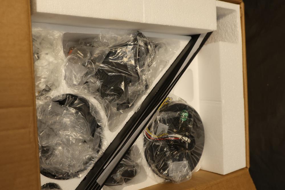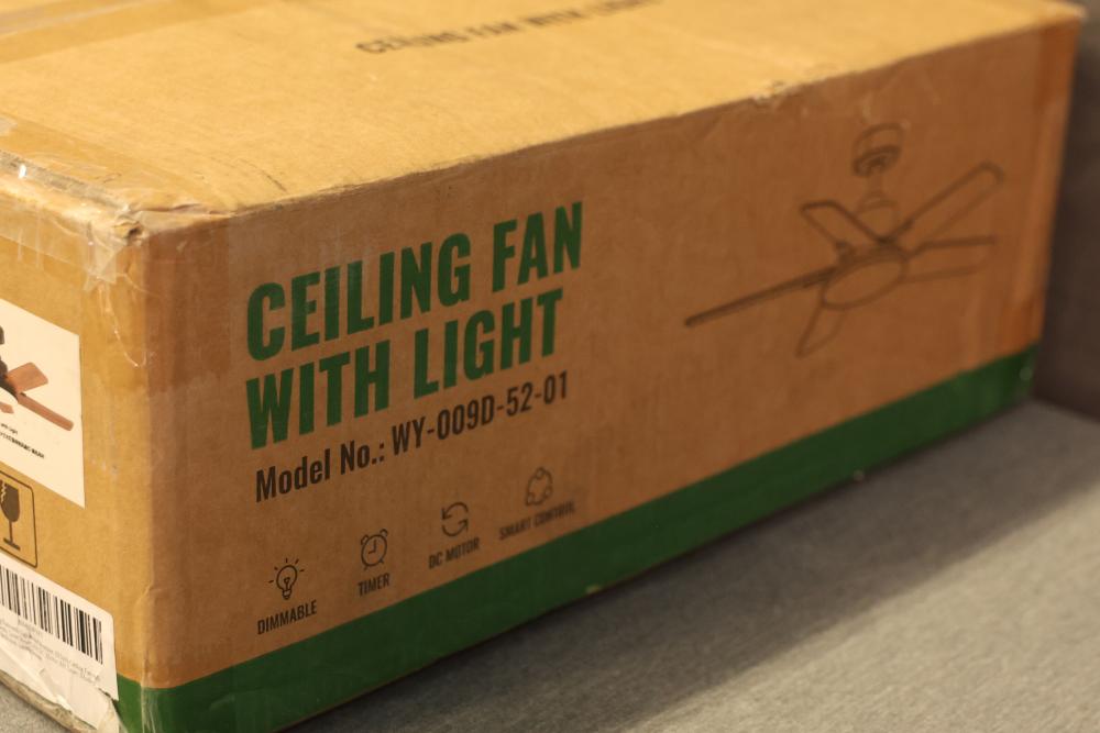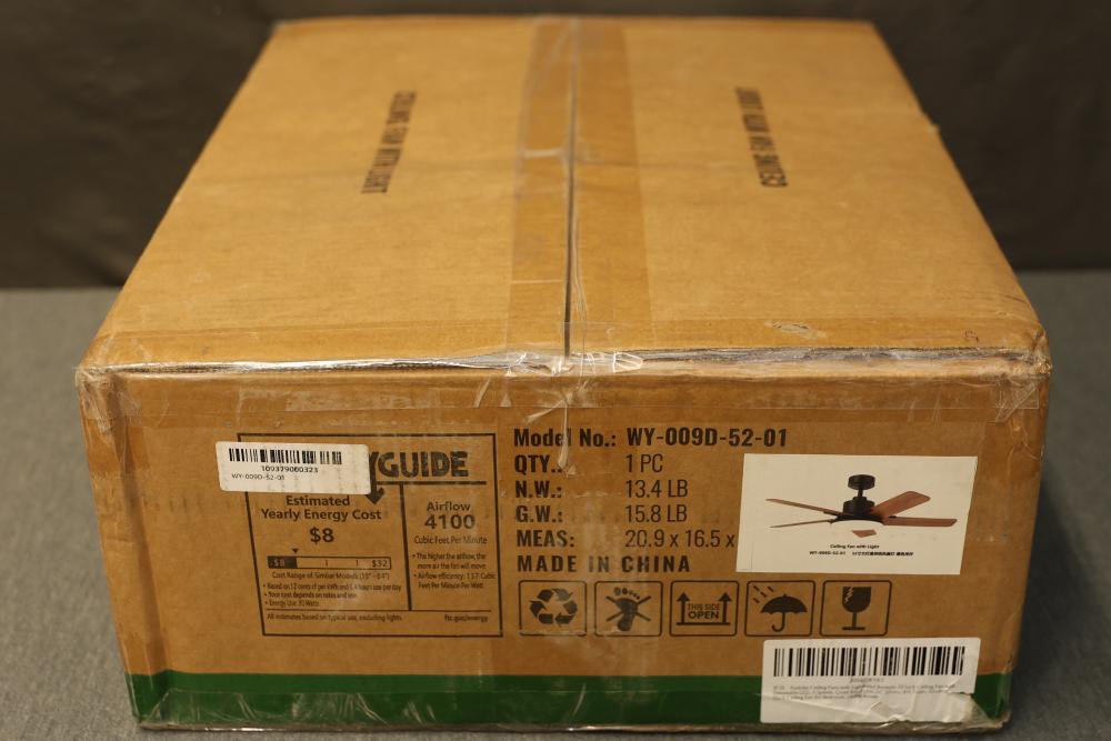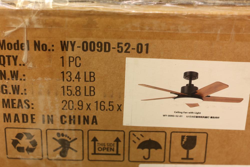 LuminFan WY-009D-52-01 52 Inch Indoor Black Downrod Mount Modern Ceiling Fan with Integrated LED and Remote Control. Features a 52-inch blade span, an integrated LED light, and a remote control for convenient operation. Designed for indoor use with a modern black finish and a downrod mount installation. Includes installation manual and required components. Pickup only.
