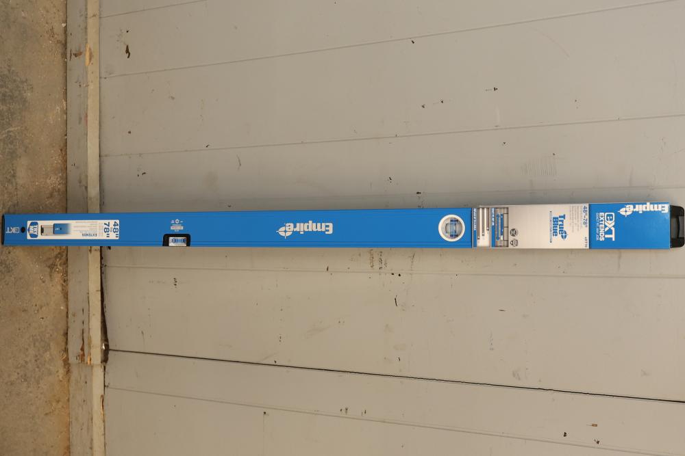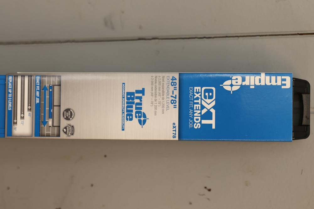 Empire eXT78 48 Inch to 78 Inch True Blue Extendable Box Level. Features include True Blue vials, extendable capability for versatility, and an adjustable slide control. Comes with a durable construction and user-friendly end caps. Packaged in original box. Pickup only.
