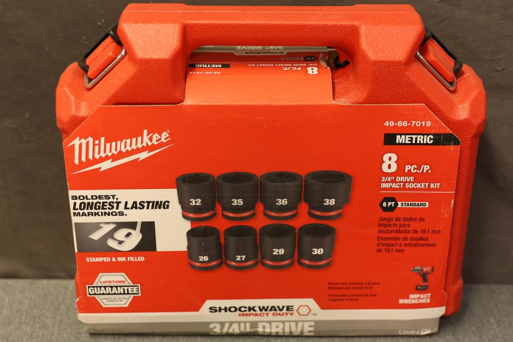 Milwaukee 49-66-7019 8-pc Shockwave 3/4 Inch Drive Metric Standard 6 Point Impact Socket Set. Includes 8 metric sockets ranging from sizes 26mm to 38mm and a durable carrying case. Features stamped and ink-filled size markings for long-lasting readability. Designed for use with impact wrenches. Pickup only.
