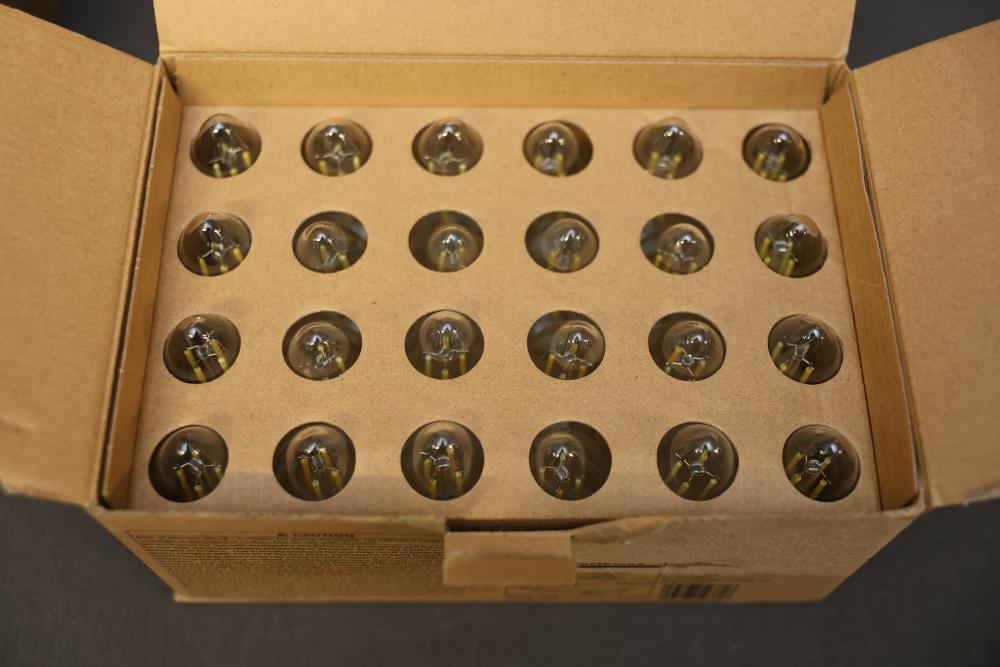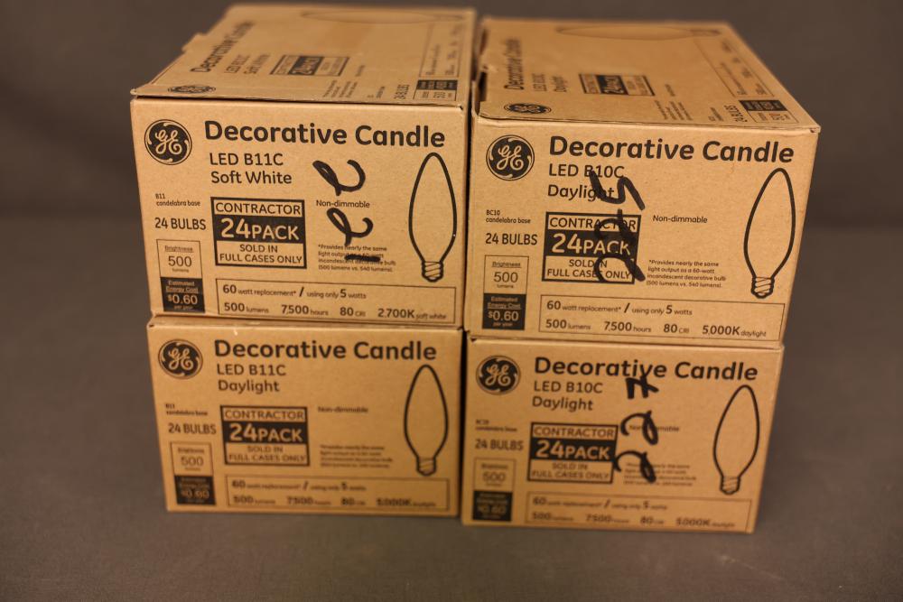 GE Decorative Candle LED B11C Bulbs, 24-Pack, Non-Dimmable. Includes a total of 24 bulbs per box, with four boxes included for a total of 96 bulbs. Bulbs are 60 watts equivalent, use 5 watts, and emit 500 lumens. They feature a candelabra base and have a daylight color temperature of 5000K and a soft white option at 2700K. Rated lifespan of 7500 hours. Pickup only.