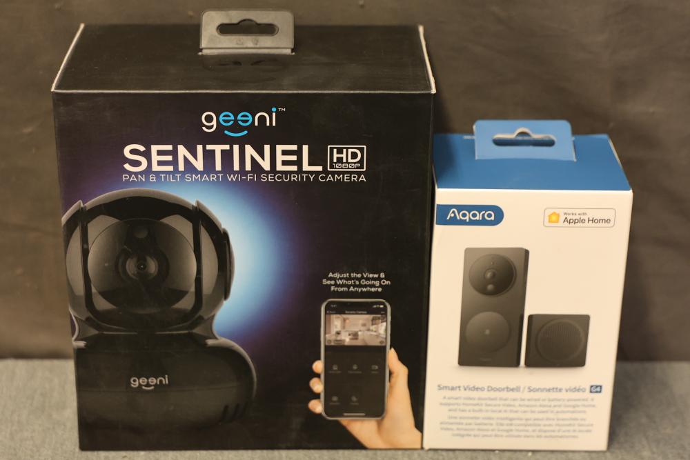Aqara SVD-C03 G4 Smart Wireless Video Doorbell and Geeni GN-CW021-101 Sentinel HD 1080p Pan and Tilt Indoor Smart Wi-Fi Security Camera. Aqara G4 doorbell supports HomeKit Secure Video, Amazon Alexa, and Google Home, and includes a 162-degree wide-angle lens, 1080p resolution, face recognition, motion alerts, and local AI functionalities. Geeni Sentinel camera features an adjustable camera view, motion detection, night vision, and app connectivity with no hub required. Pickup only.