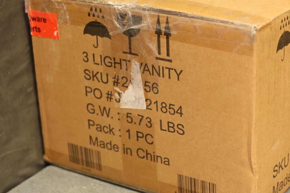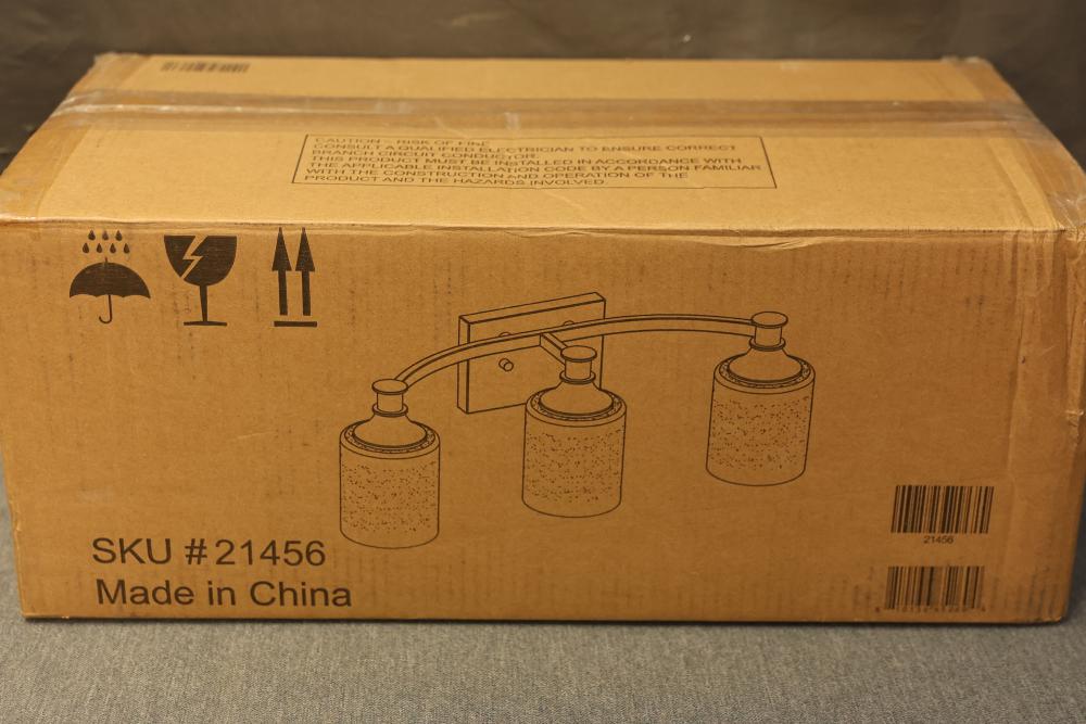 KAWOTI 21456 20.25 Inch 3-Light Painted Black Vanity Light with Clear Edge and Frosted Glass Shades. Includes clear edge and frosted glass shades with a painted black finish. Suitable for bathrooms or vanity areas. Unit comes securely packaged in the original box. Pickup only.