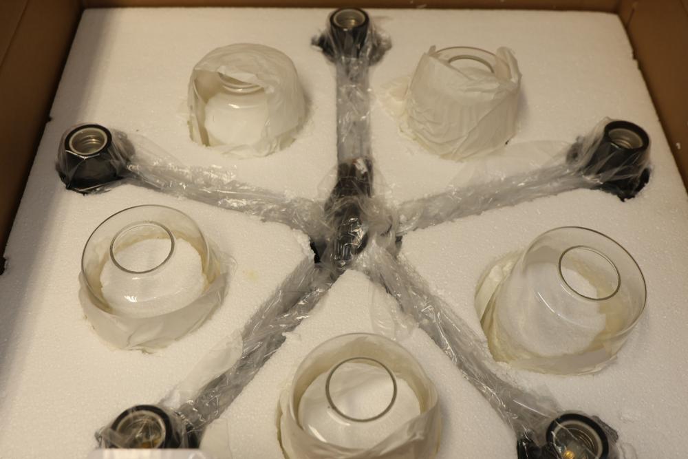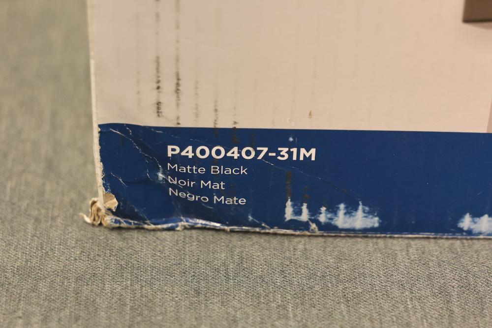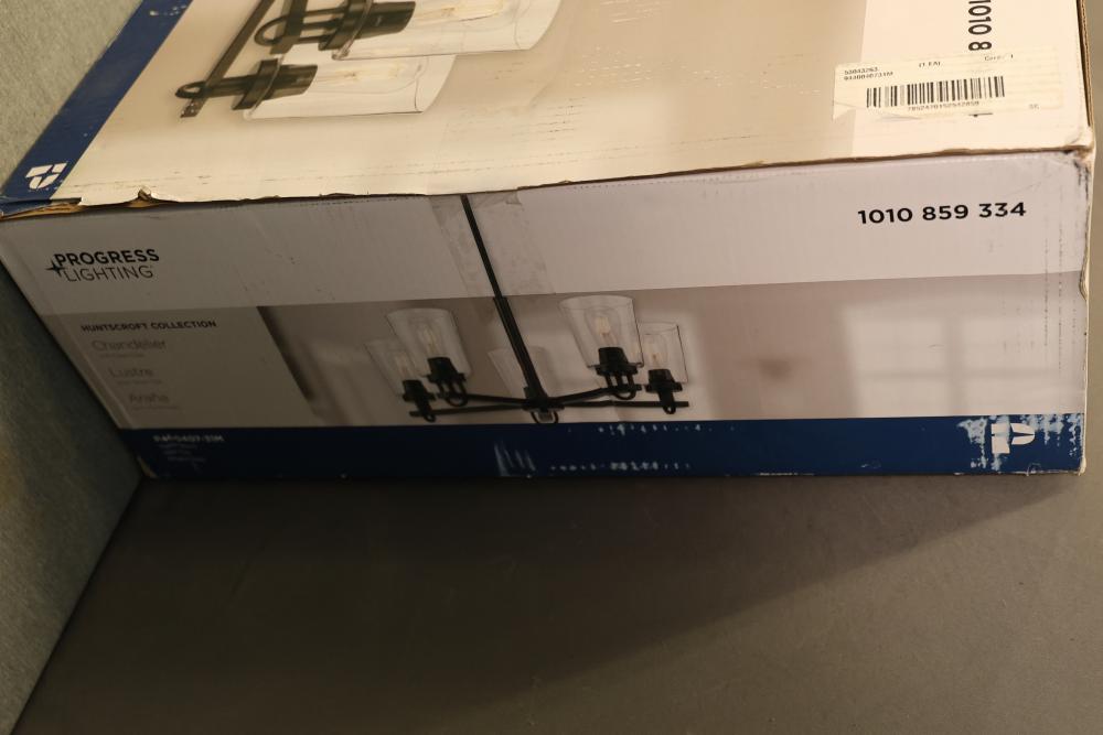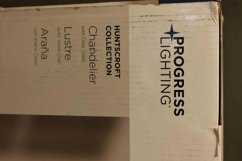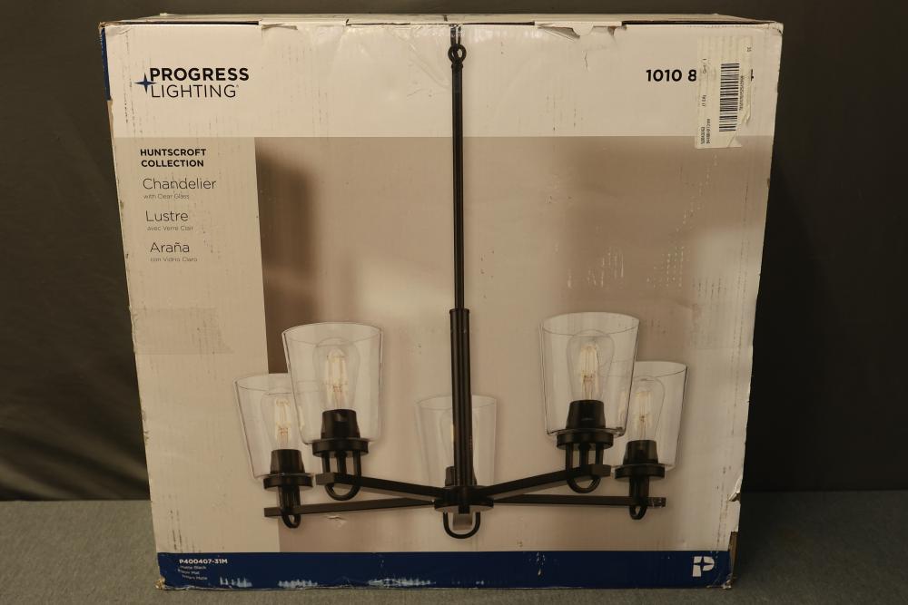 Progress Lighting P400407-31M Huntscroft 25 Inch 5-Light Matte Black Chandelier. Features a matte black finish with clear glass shades. The chandelier is designed for indoor use and requires five bulbs, which are not included. The item appears to be packed in its original box with protective materials. Pickup only.
