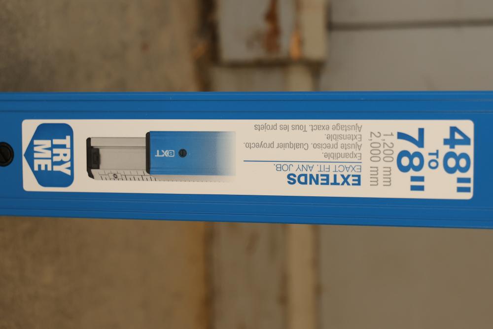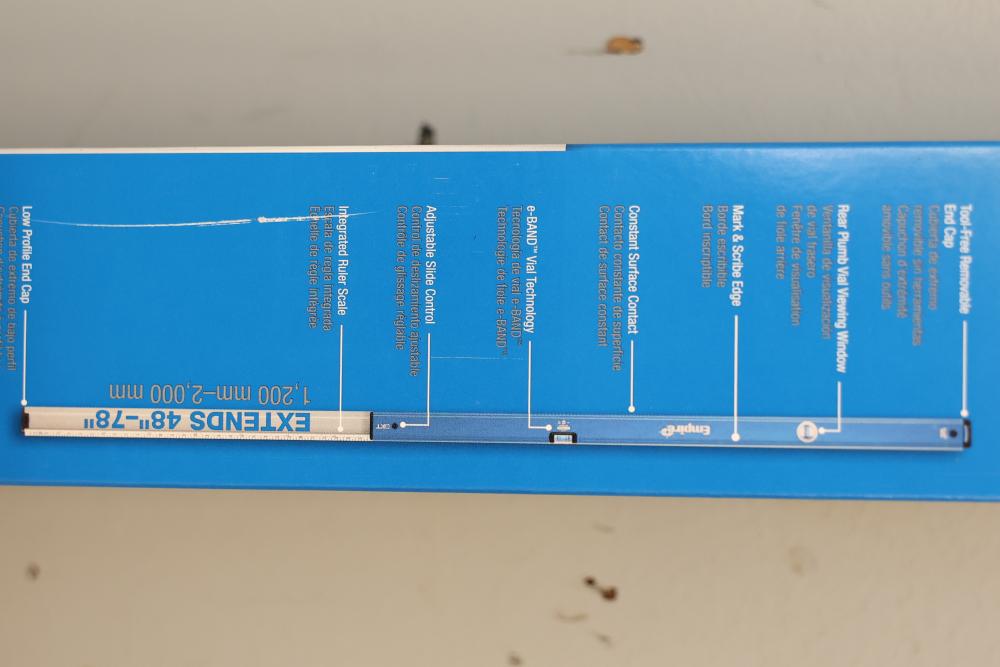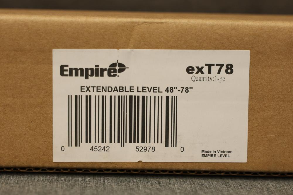 Empire eXT78 48 Inch to 78 Inch True Blue Extendable Box Level. Features include a removable end cap, high-visibility viewing window, scribe edge, e-Band vials, and an adjustable slide control for extendability. Measures 48 inches but extends up to 78 inches for enhanced functionality. Comes in original packaging. Pickup only.