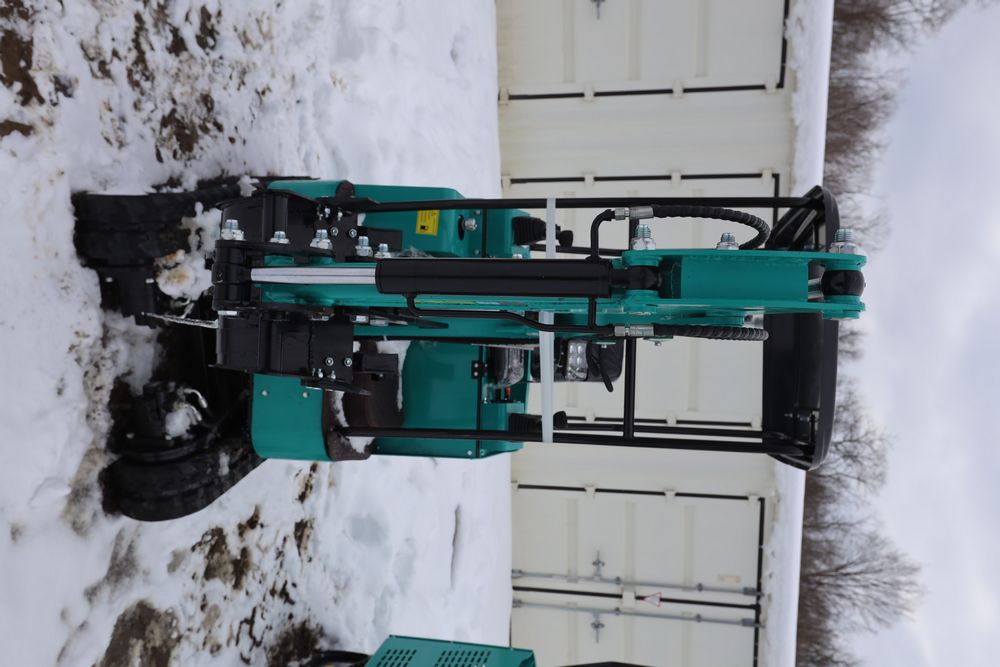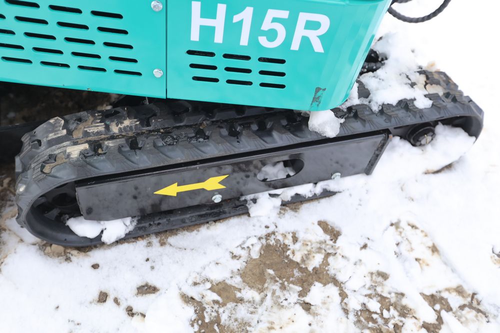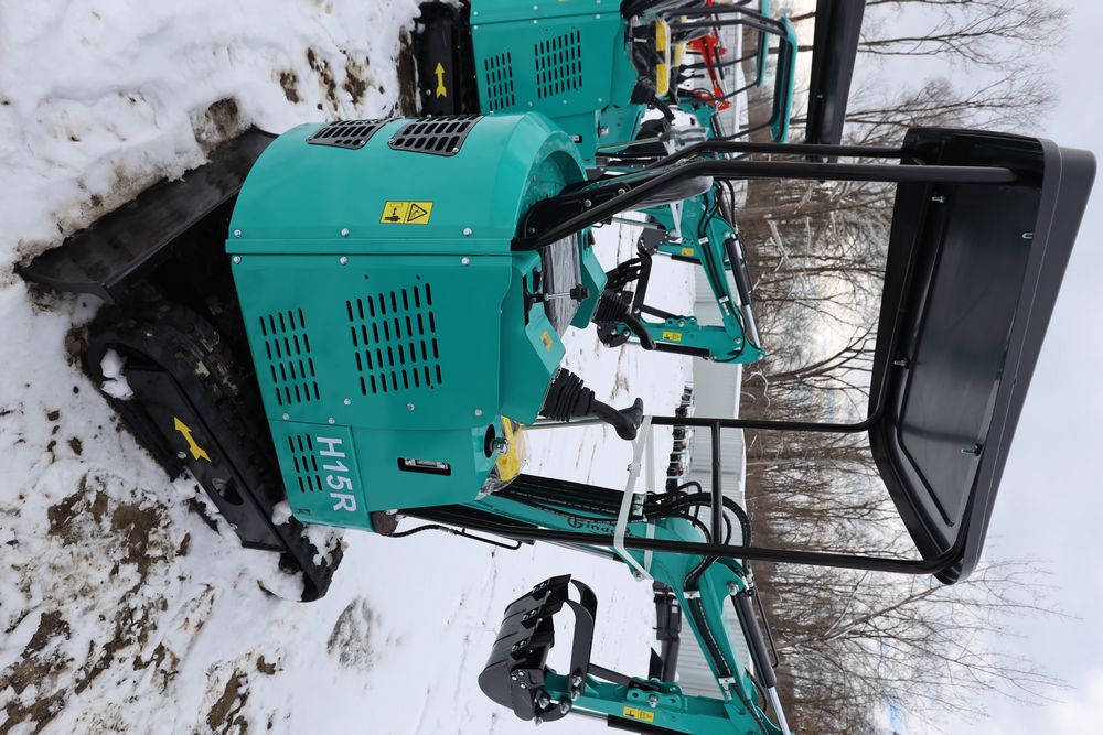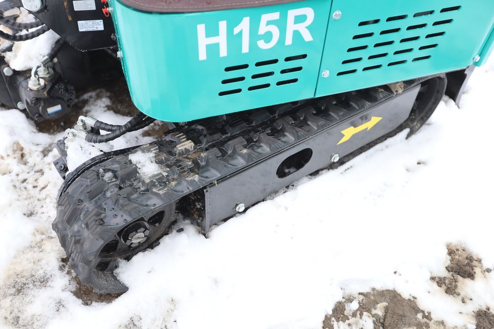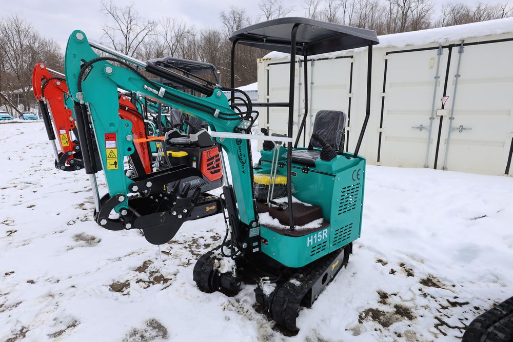 New 2026 CFG Industrial gas powered mini Excavator model H15R with 420cc gasoline engine, bucket, 4' long tracks, 38.5" wide base, 6" wide tracks, canopy, hydraulic boom & bucket controls, pilot system, thumb, dozer blade. Hours reading less than 1 hour.