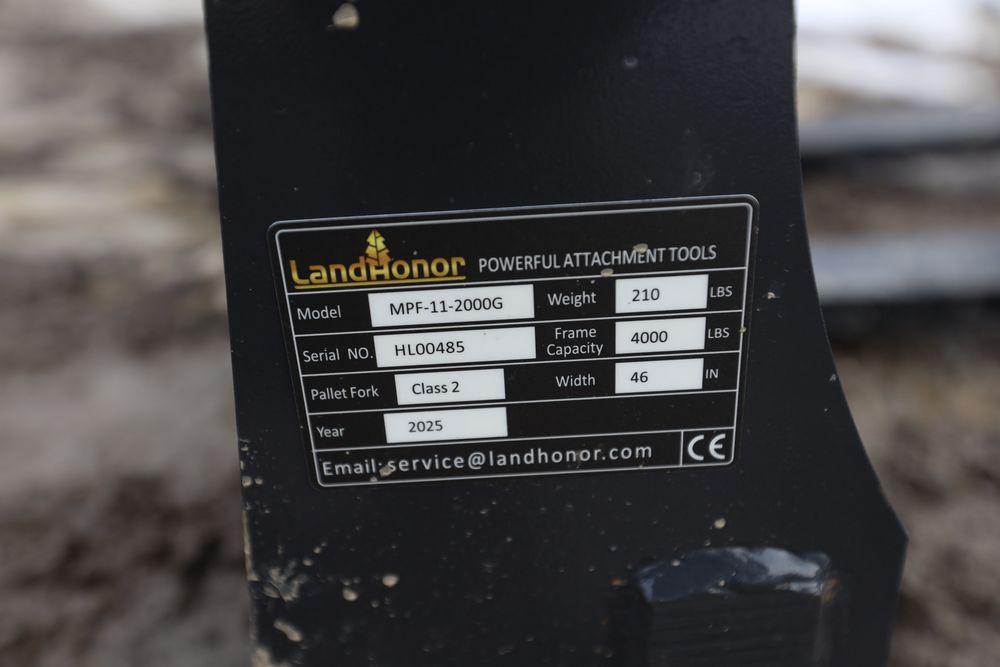 New 2026 Landhonor mini skid steer pallet fork attachment with bale spear holes, model MPF-11-2000G.