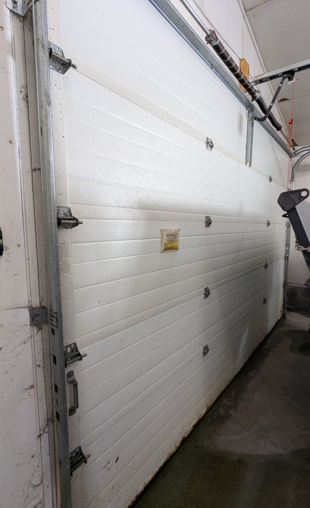 Insulated Overhead Door No. 8; 10ftx12ft. Lot includes door, opener, track and springs. Door is uninstalled.
