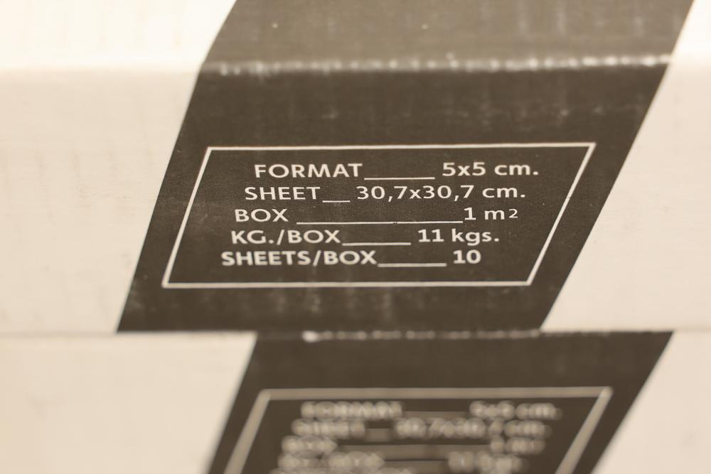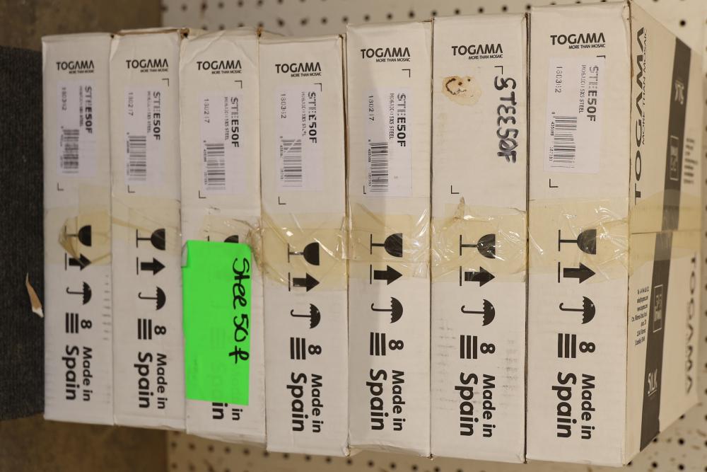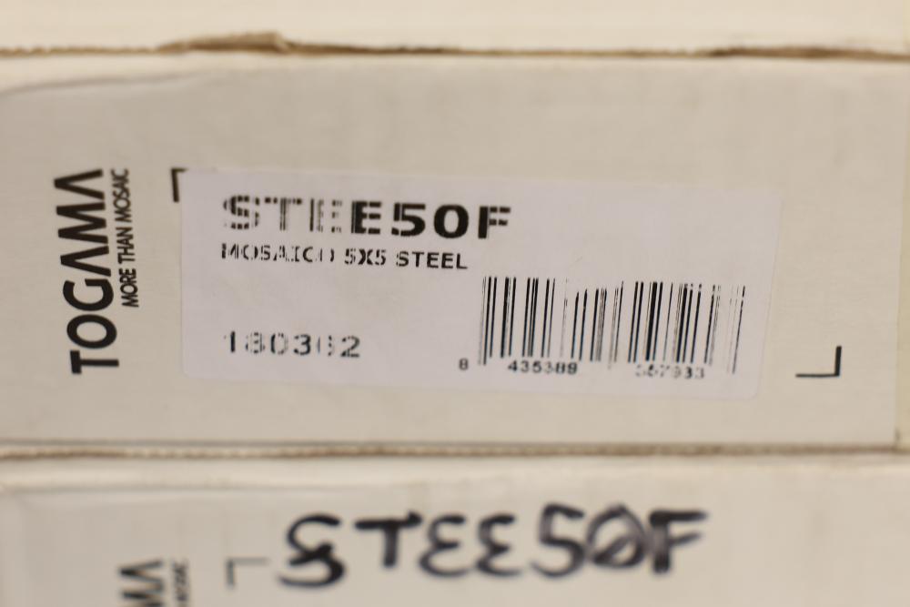 Seven boxes TOGAMA STEE50F mosaic tile labeled MOSAICO 5X5 STEEL, Made in Spain, each box marked 10 sheets per box with sheet size 30.7 x 30.7 cm and format 5 x 5 cm, total 70 sheets, approximately 75.32 sqft total. Sold by: Square Foot. Sold as: Price X Quantity. Sold by: Square Foot. Sold as: Price X Quantity.