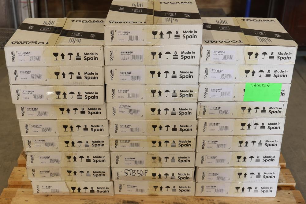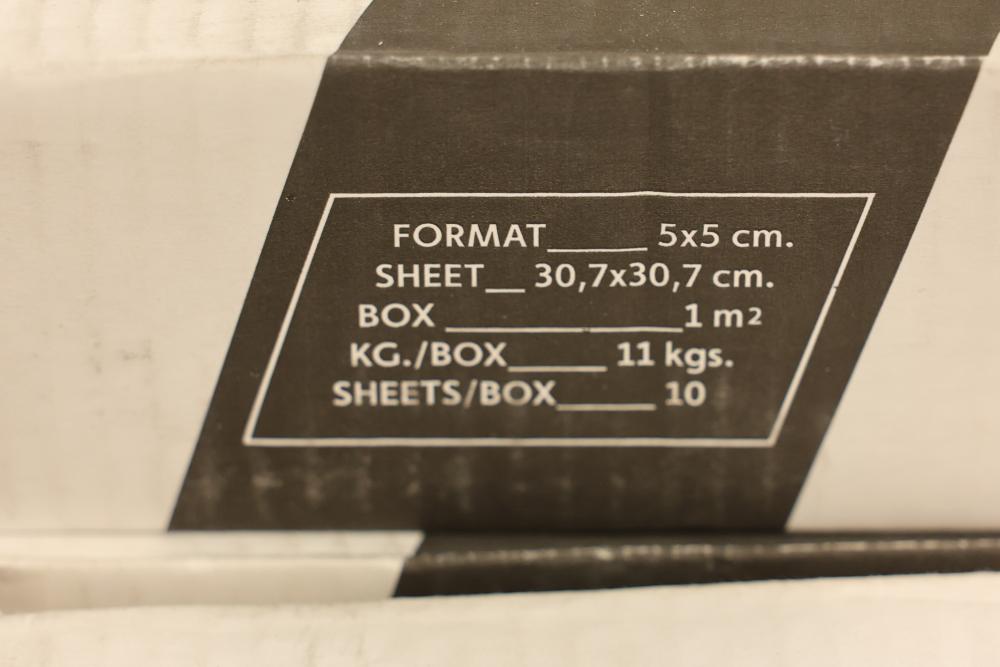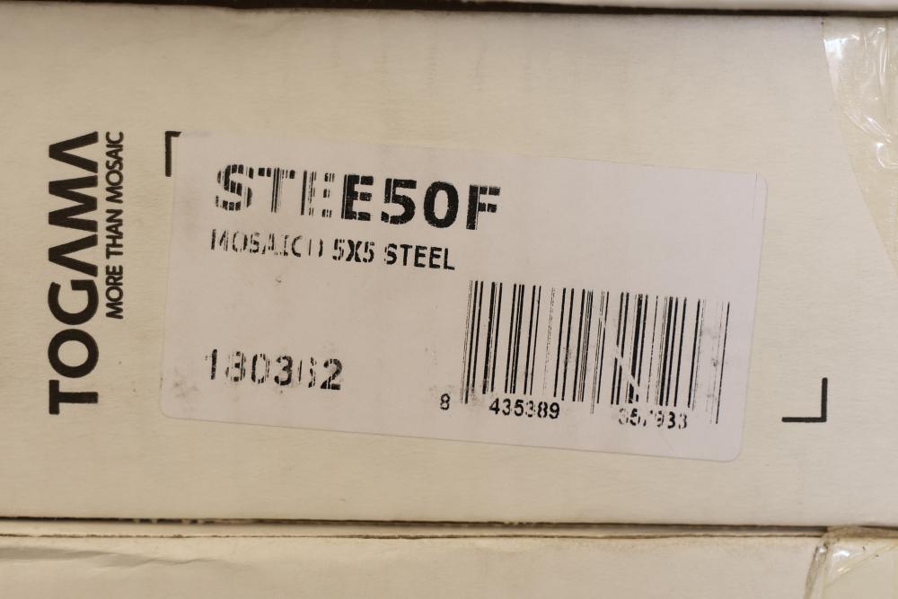 Twenty eight boxes TOGAMA STEE50F mosaic tile labeled MOSAICO 5X5 STEEL, Made in Spain, each box marked 10 sheets per box with sheet size 30.7 x 30.7 cm and format 5 x 5 cm, total 280 sheets, approximately 301.28 sqft total. Sold by: Square Foot. Sold as: Price X Quantity. Sold by: Square Foot. Sold as: Price X Quantity.