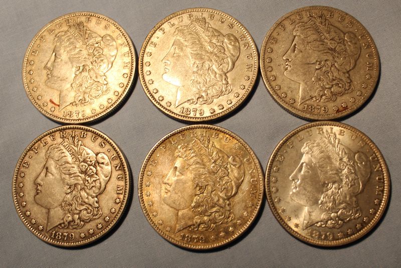 Six 1879 Morgan Silver Dollars including three "O". Shipping is available for this item.