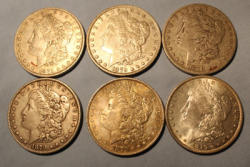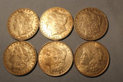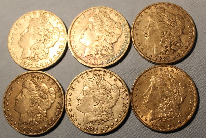 Six Morgan Silver Dollars including three 1887 (two "O") and three 1888 (one "O"). Shipping is available for this item.