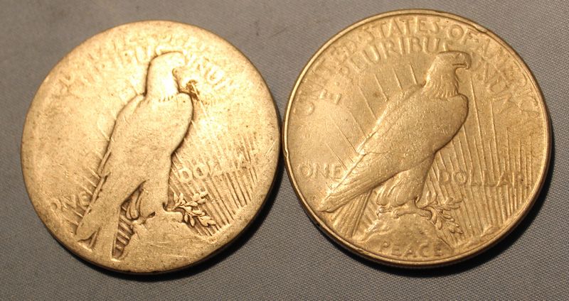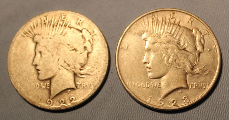 Five U.S. Silver Dollars including three 1921 Morgans (one "S", one "D"), a 1922 Peace Dollar and a 1923 Peace Dollar. Shipping is available for this item.
