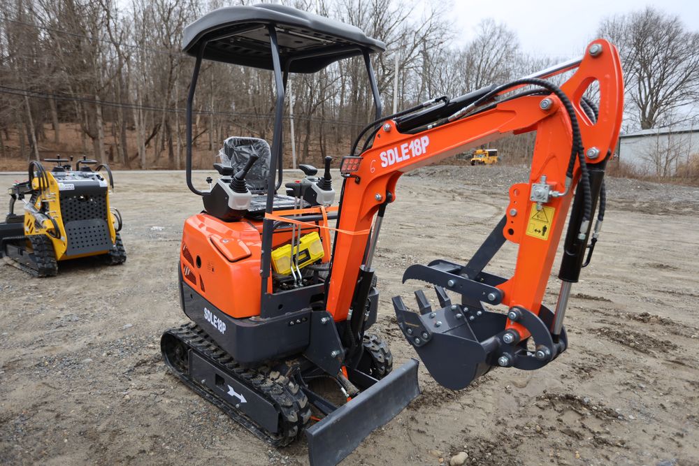 New 2025 mini excavator model SDLE18P with bucket, thumb, and RATO 420 gas engine. Hours reading less than 1 hour.