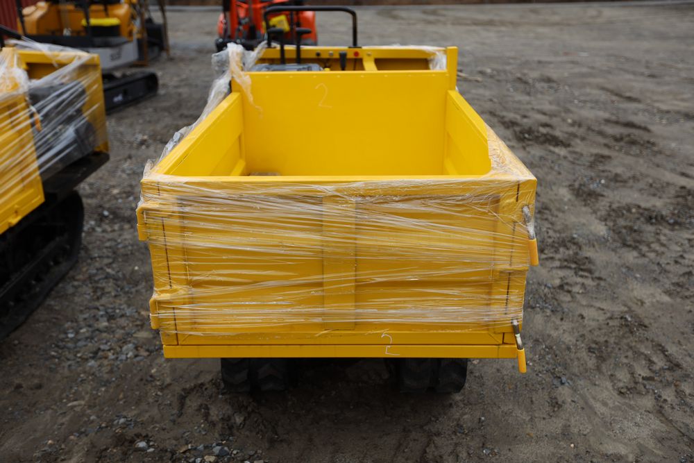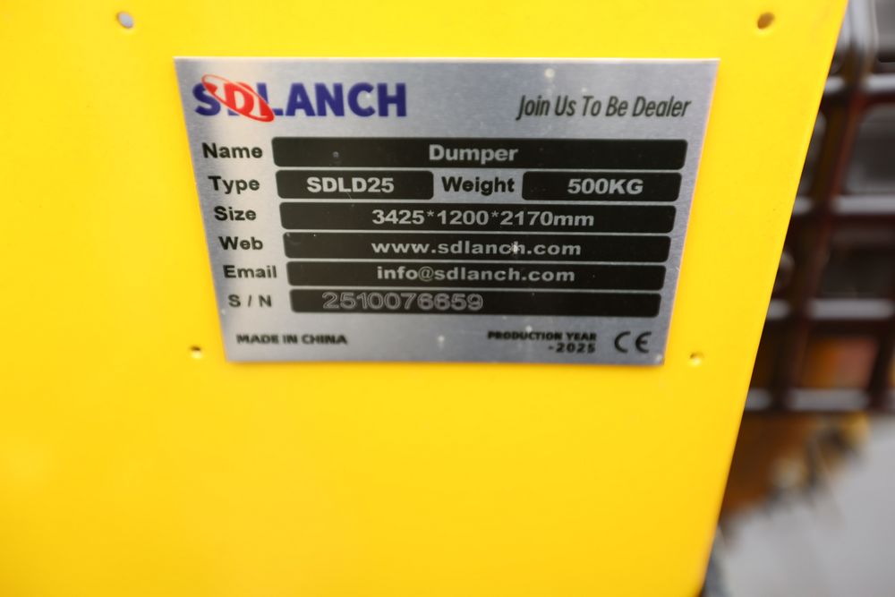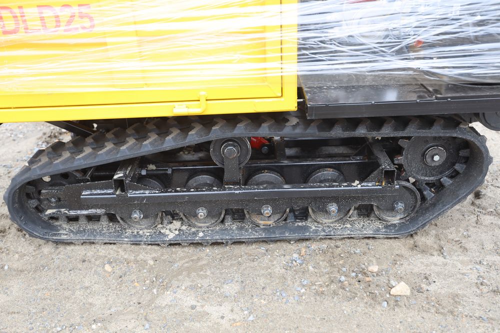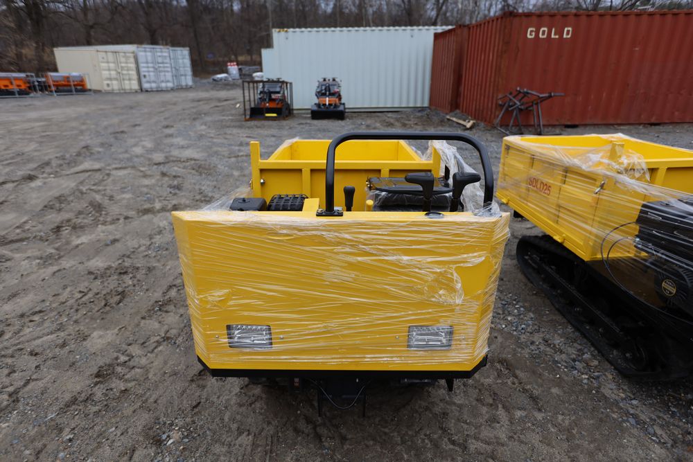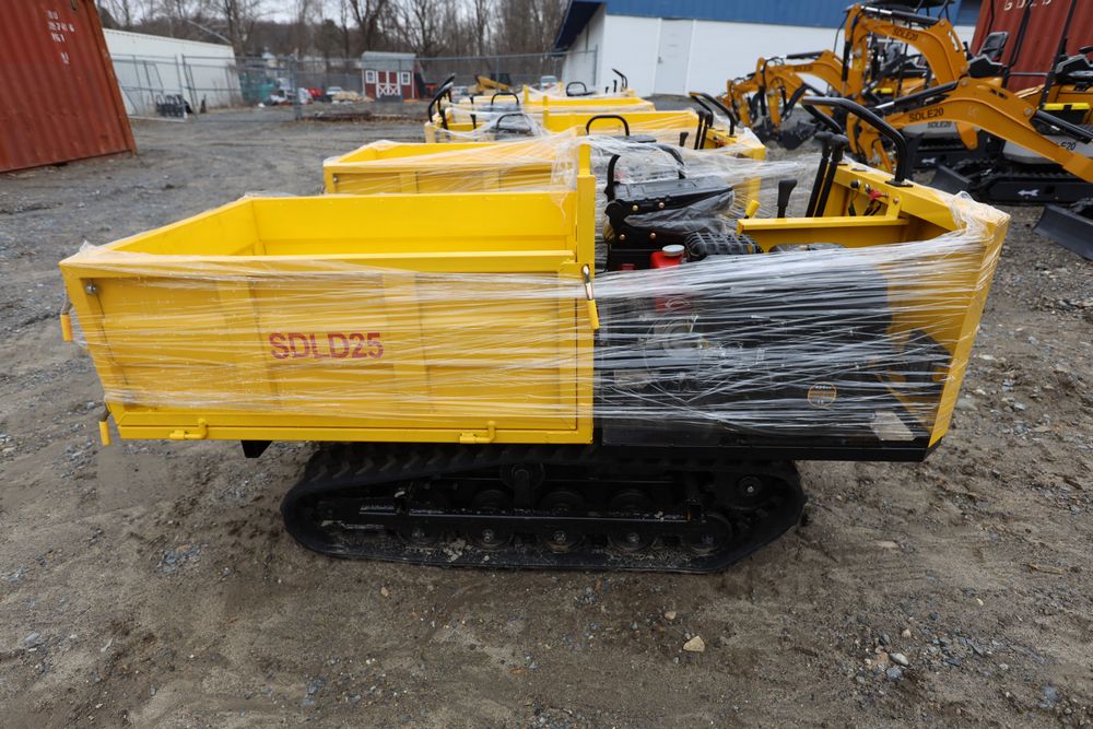 New 2025 tracked dumper model SDLD25 with a high-sided yellow steel cargo bed and rear-mounted engine. Features a single-operator seat with control levers, and rubber tracks for enhanced mobility on rough terrain.