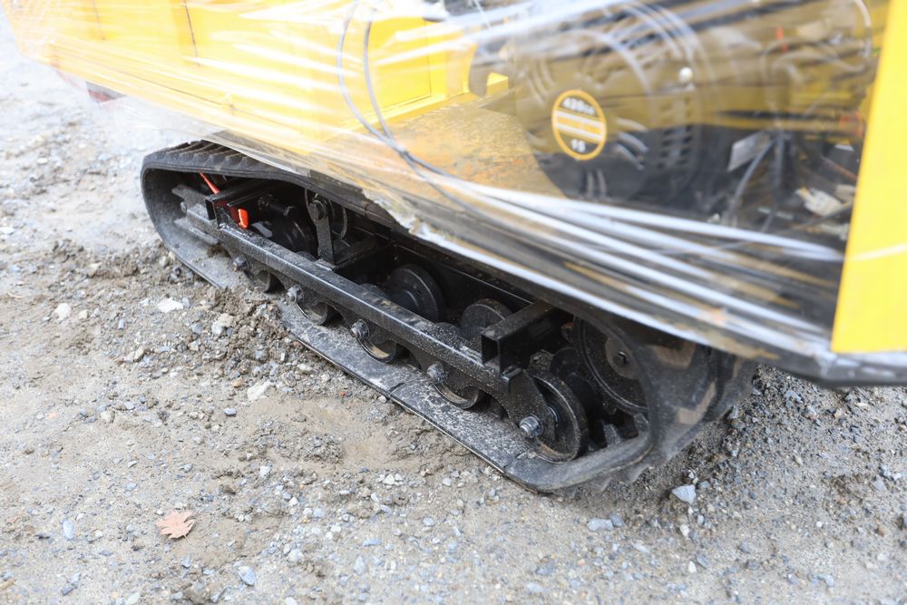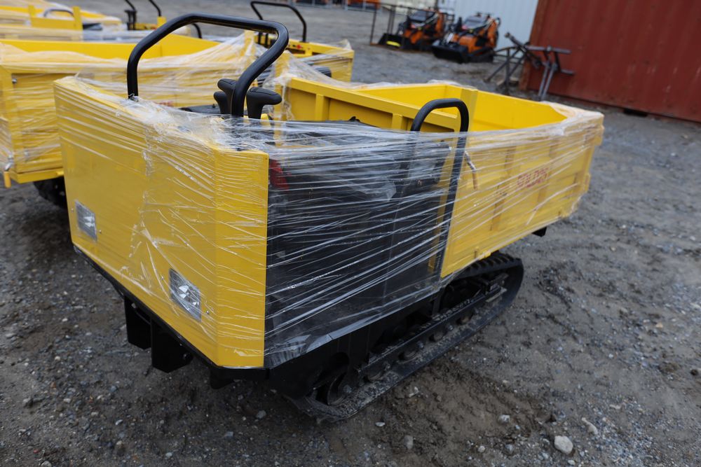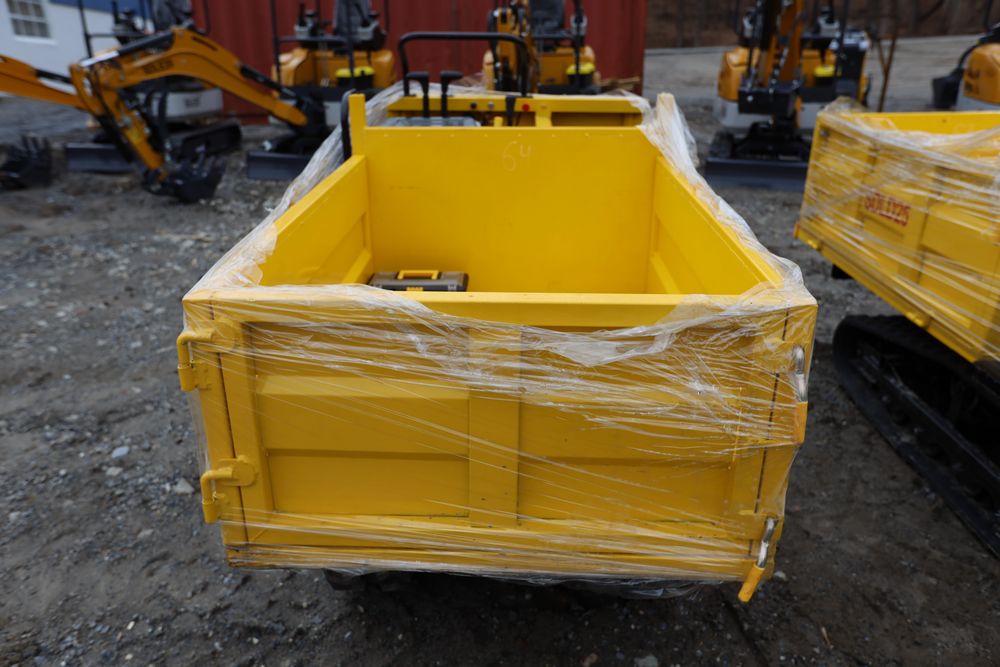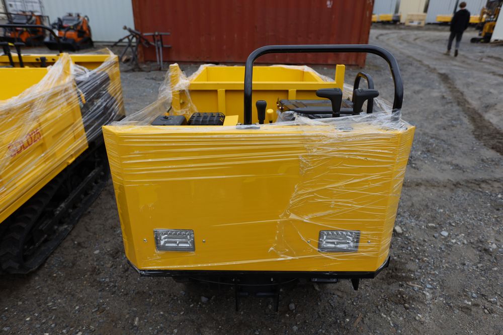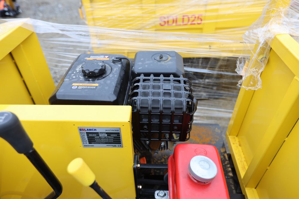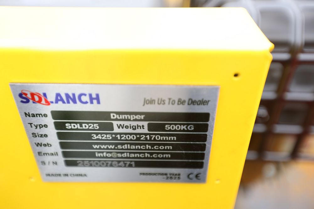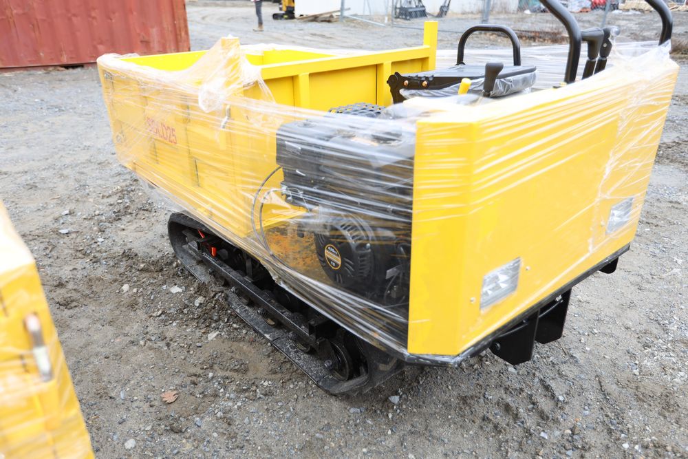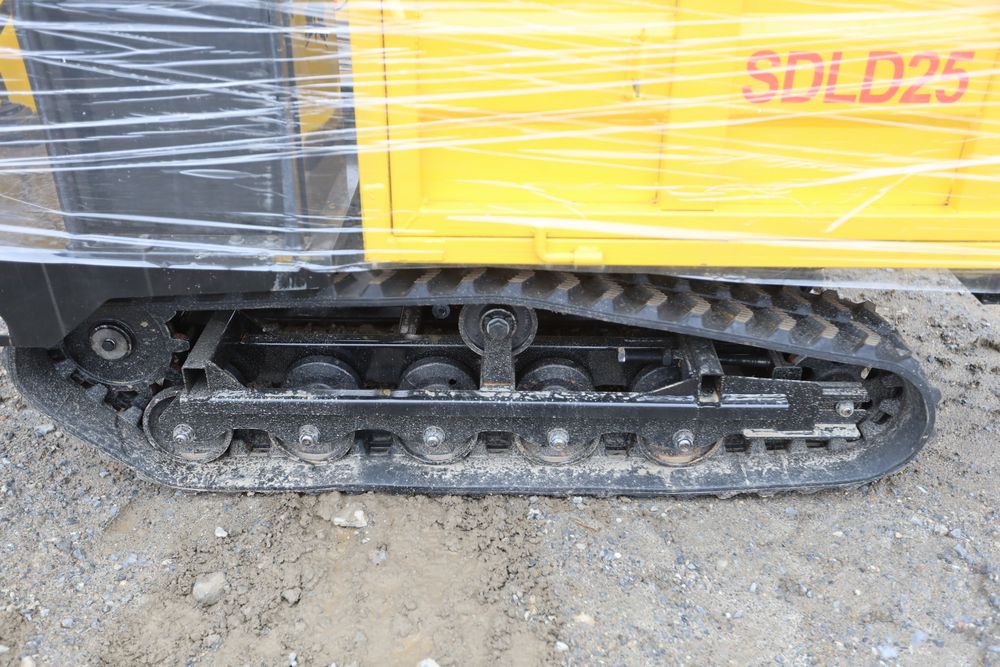 New 2025 tracked dumper model SDLD25 with a high-sided yellow steel cargo bed and rear-mounted engine. Features a single-operator seat with control levers, and rubber tracks for enhanced mobility on rough terrain.