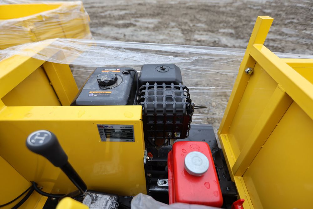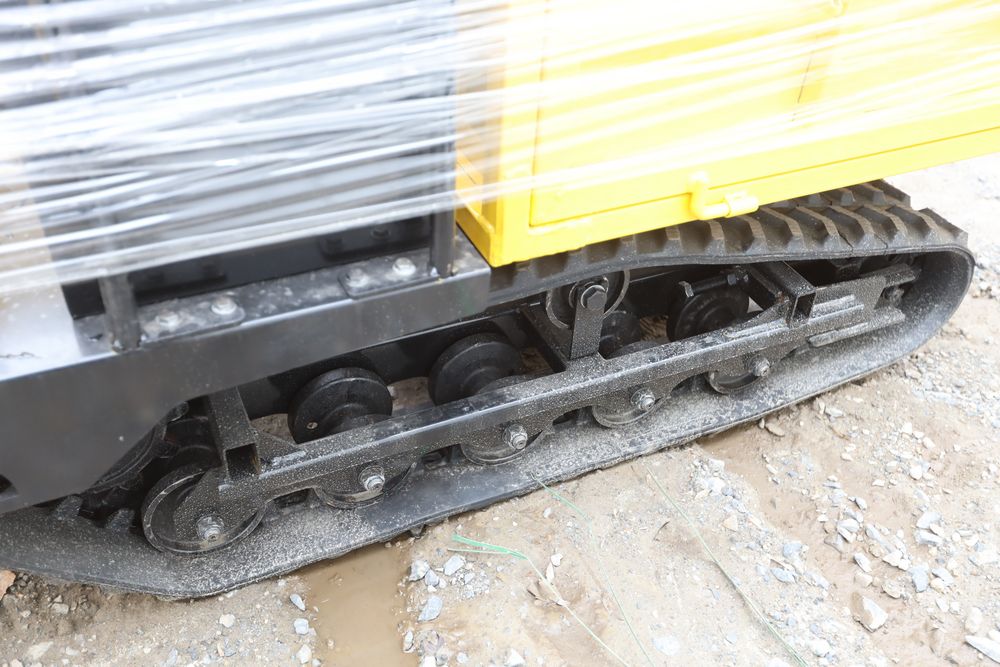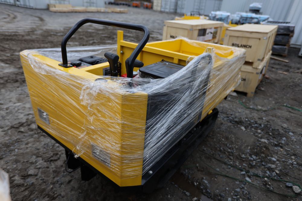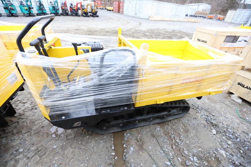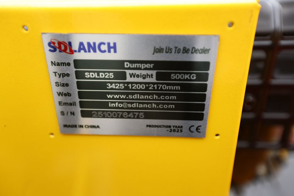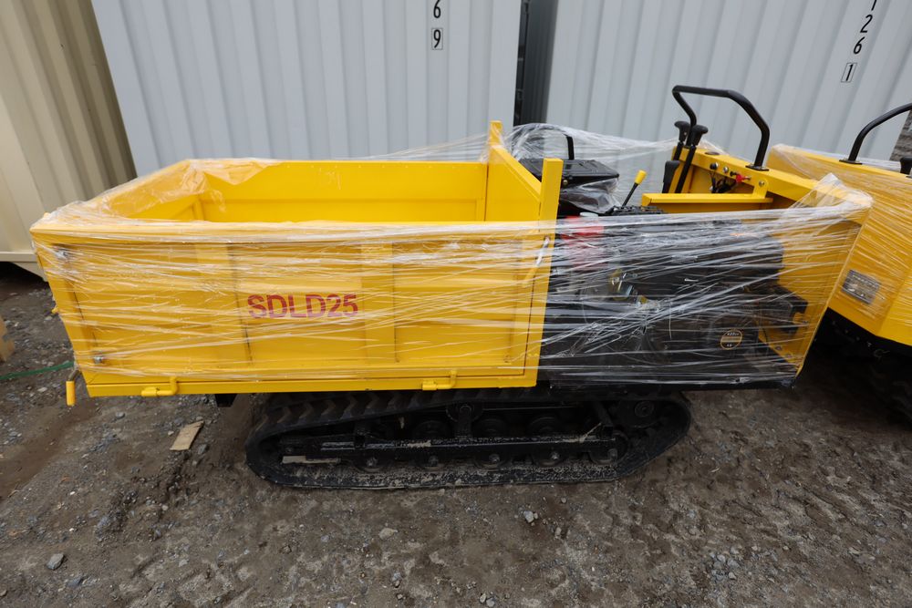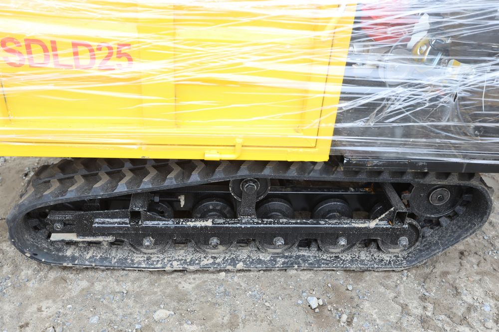 New 2025 tracked dumper model SDLD25 with a high-sided yellow steel cargo bed and rear-mounted engine. Features a single-operator seat with control levers, and rubber tracks for enhanced mobility on rough terrain.