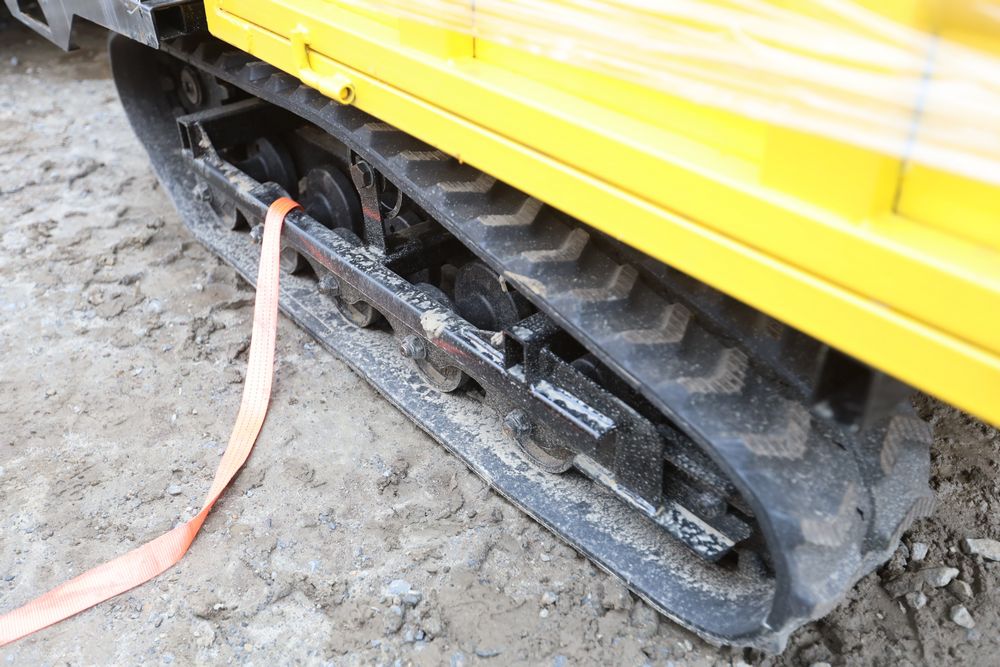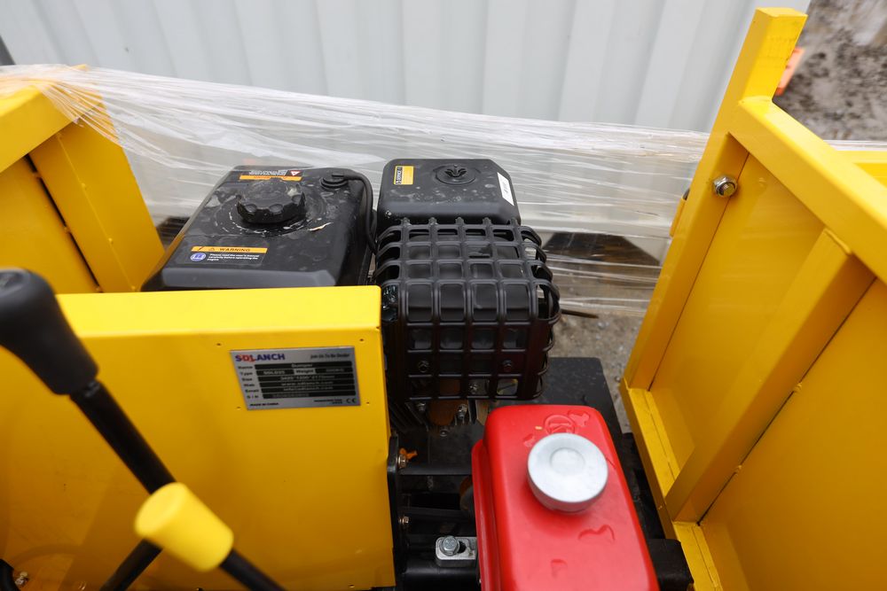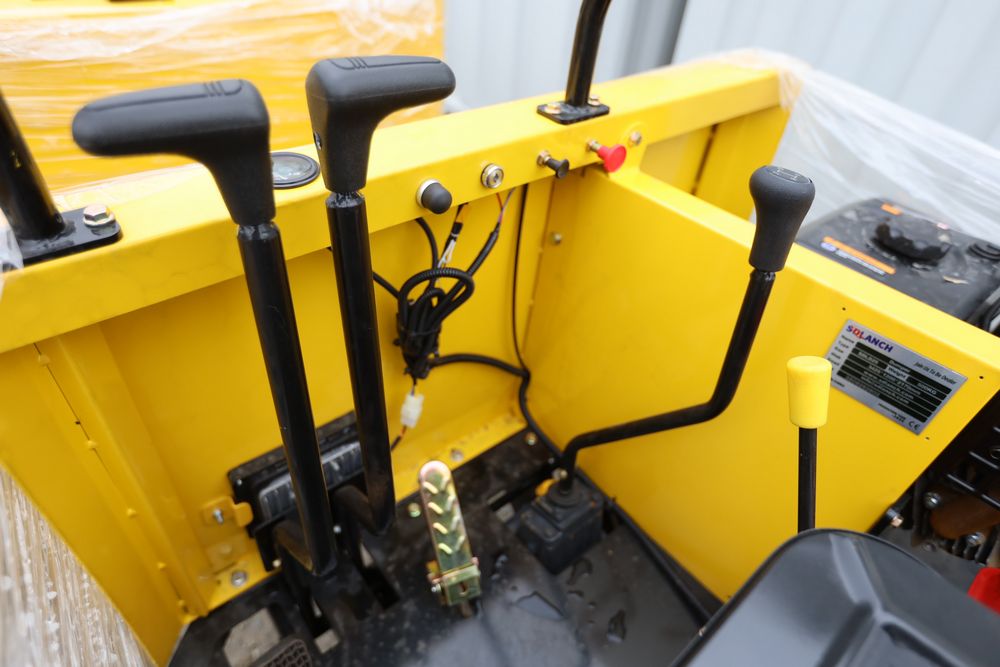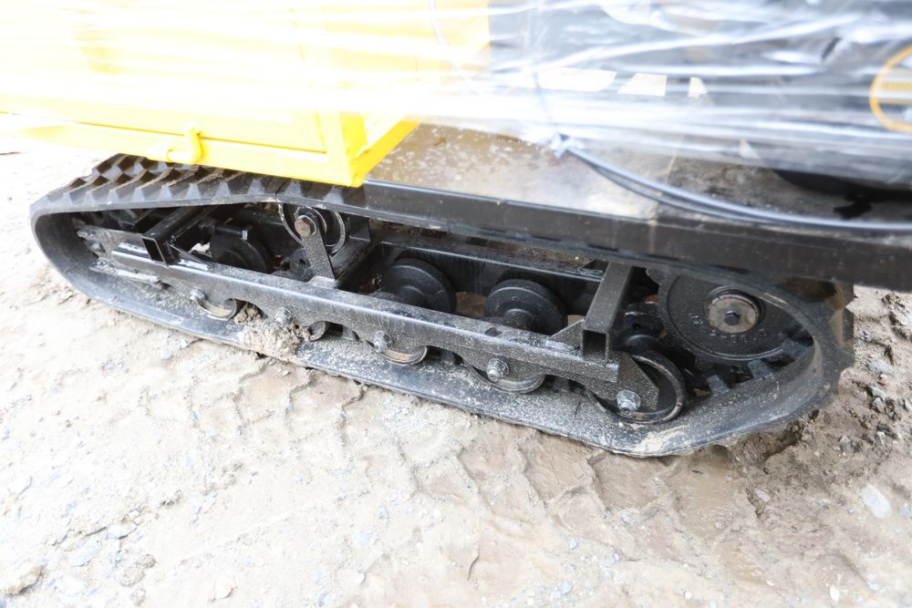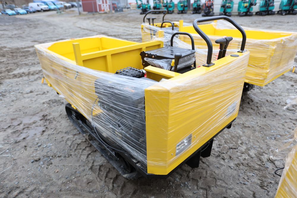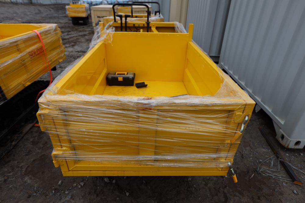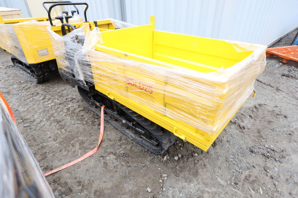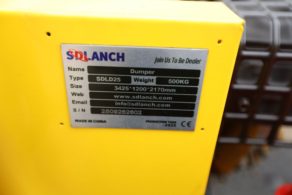 New 2025 tracked dumper model SDLD25 with a high-sided yellow steel cargo bed and rear-mounted engine. Features a single-operator seat with control levers, and rubber tracks for enhanced mobility on rough terrain.