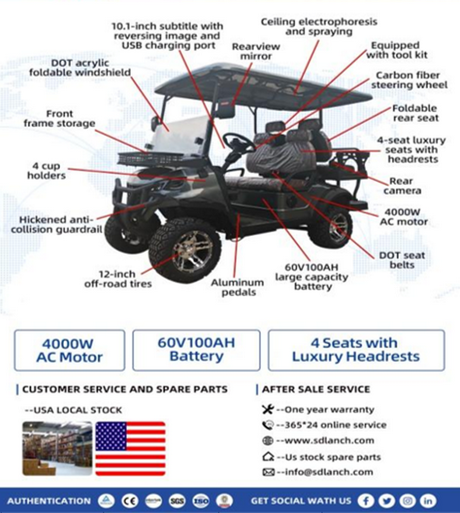 New 2025 golf cart model SDLG80, seats four, top speed of 23-24mph, 4KW AC motor, canopy cover, front window, brush guard.. Comes disassembled, appearing to be complete. Condition may very. Sold as is.