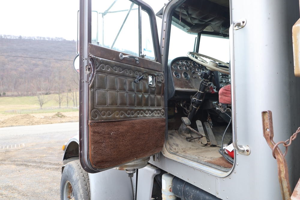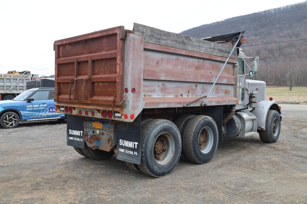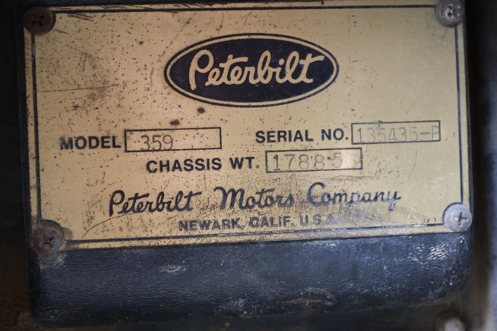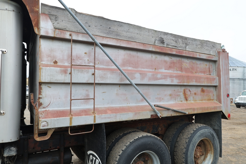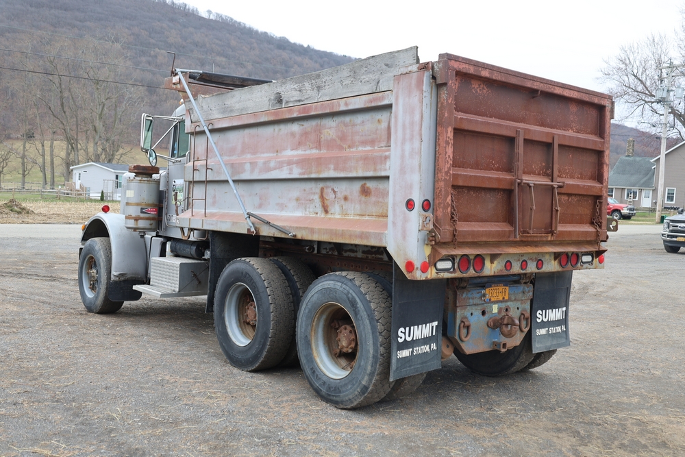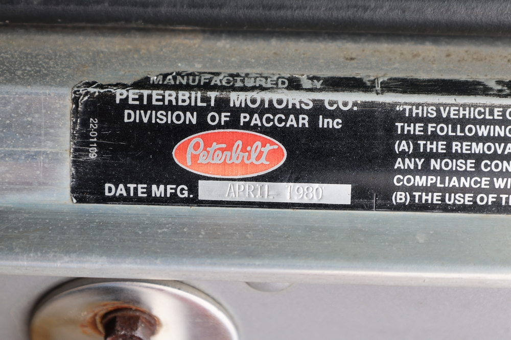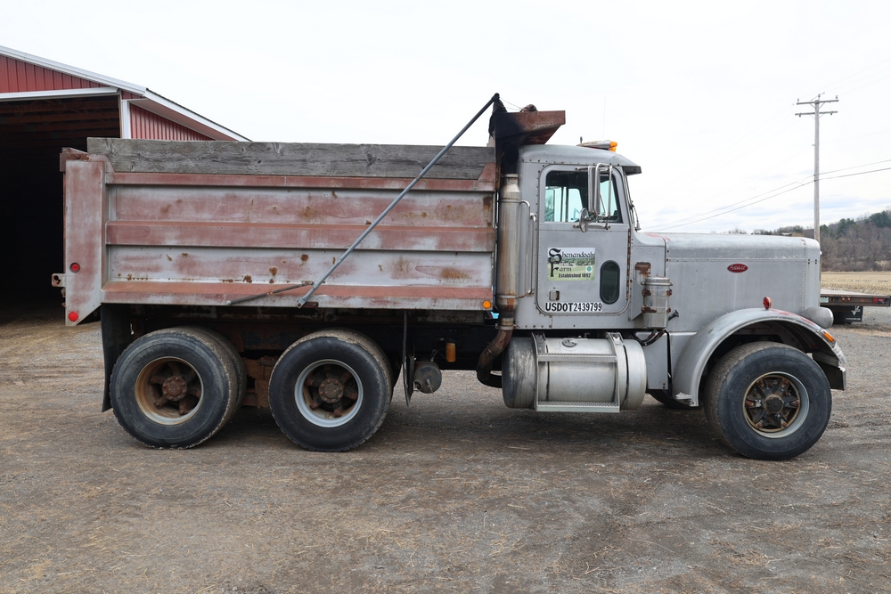 1980 Peterbilt 359 Dump Truck. Serial #: 135435-P. Odometer Reading: 137,460 miles. Hour Meter Reading: 3,264. Engine: Detroit Diesel. Transmission: Manual. With steel dump body. Interior: Vinyl seating, manual controls, auxiliary gauges. Configuration: Tandem axle, dump body. Manufacture Date: 04/1980. Made in USA. Runs and drives. Title and key available.