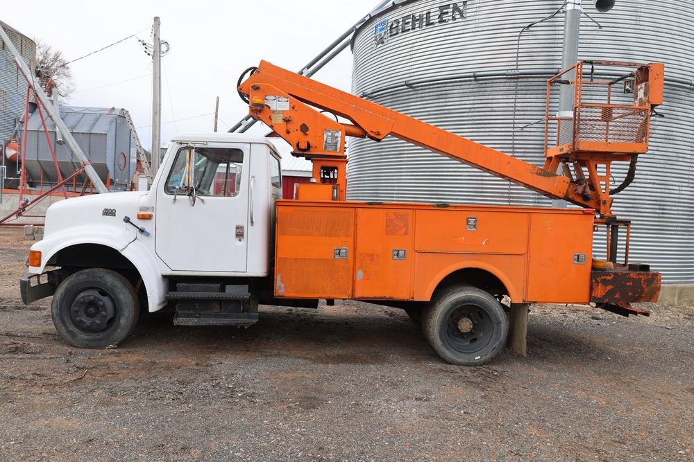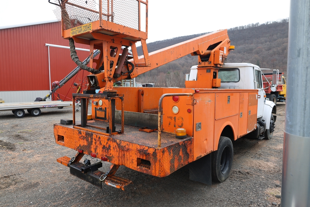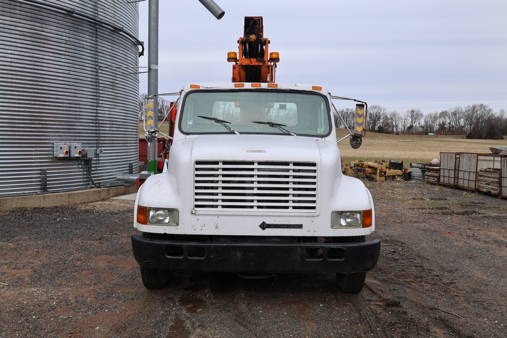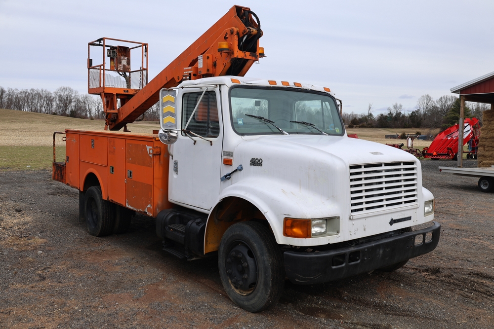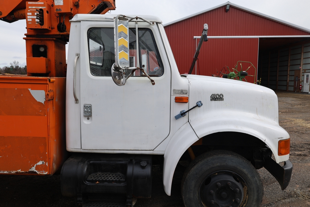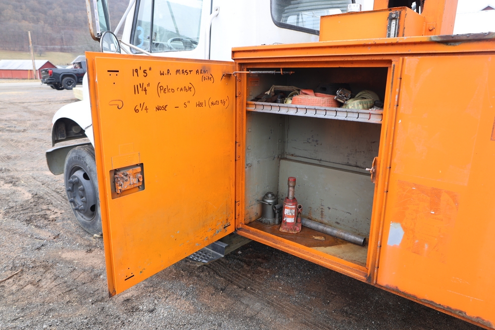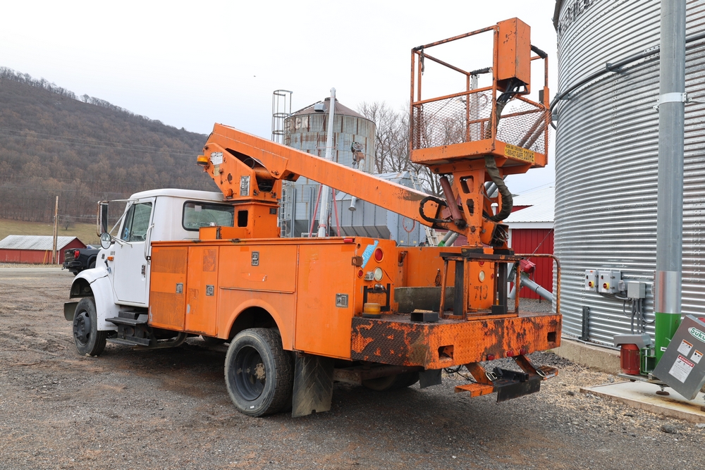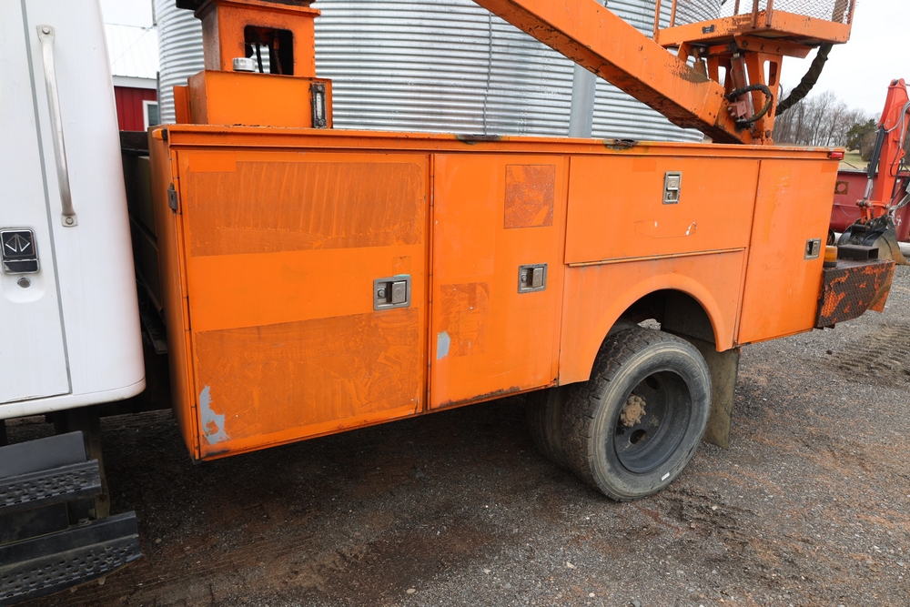 1998 International 4700 with a 7.3L V8 diesel engine. VIN: 1HTSCABK2WH529757. Odometer reading: 38209. Hour meter reading: 2048. Body: utility service truck with aerial boom. Equipped with Aero-Lift 2TPE-35 boom, 35 ft platform height, 500 lb capacity, dual rear wheels, side storage compartments, rear hitch, strobe light, and in-cab boom controls.