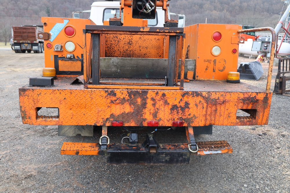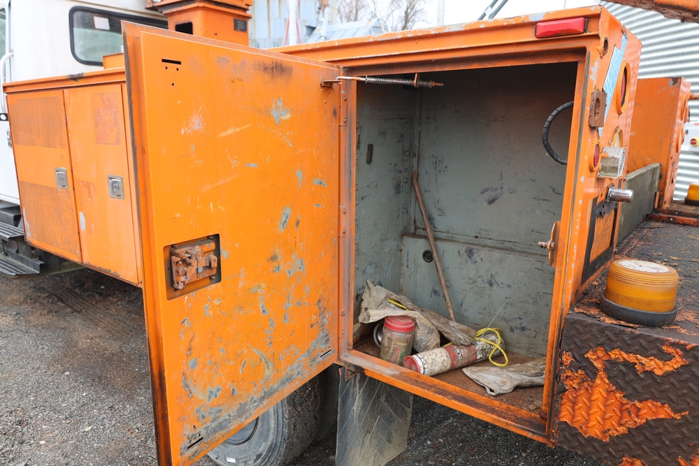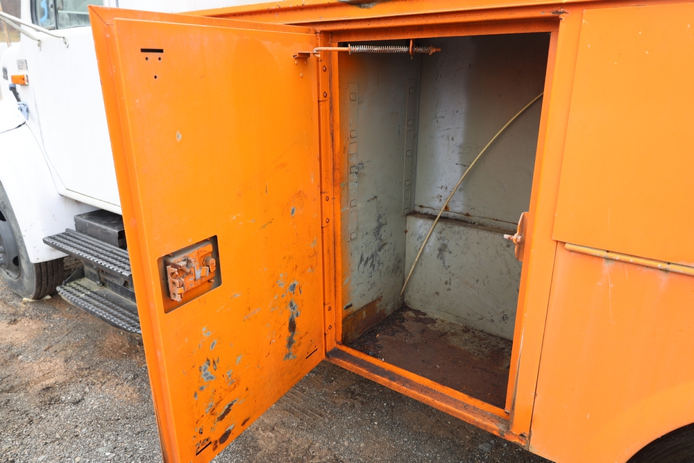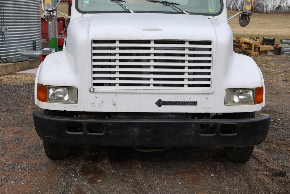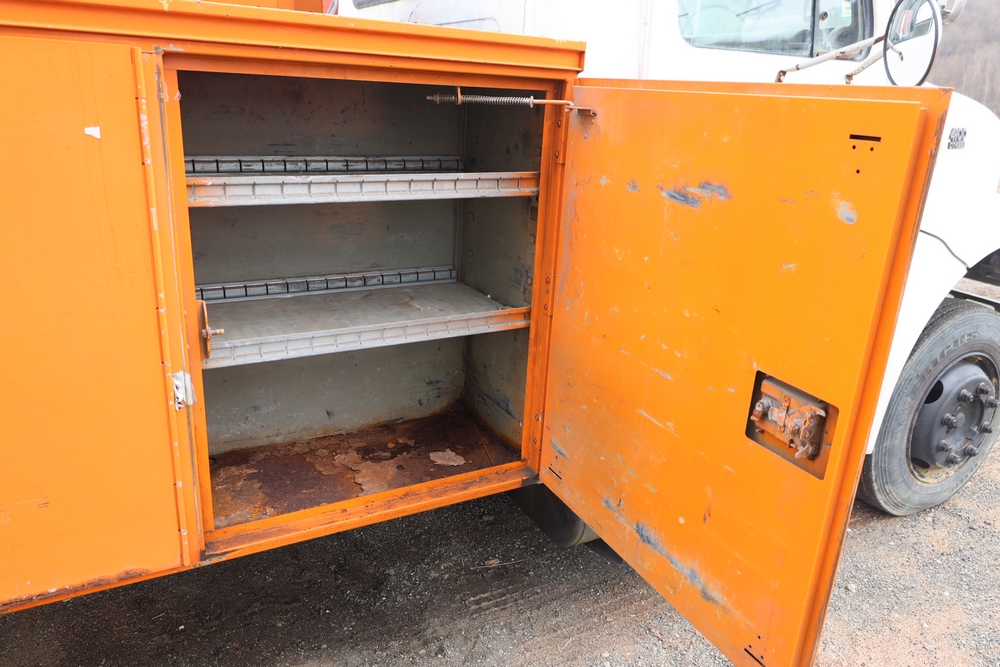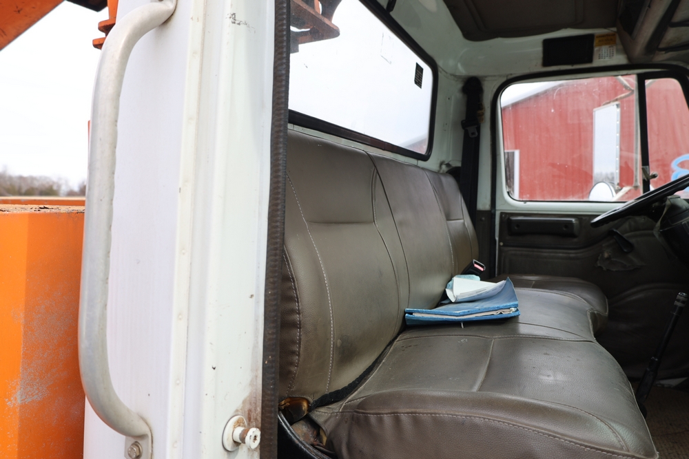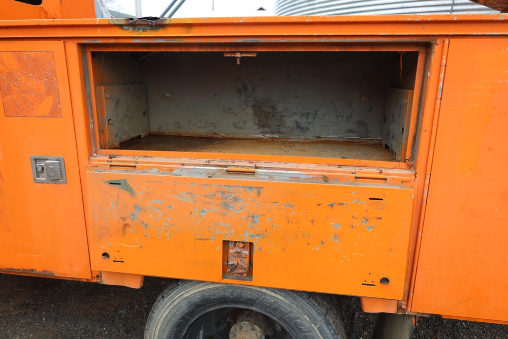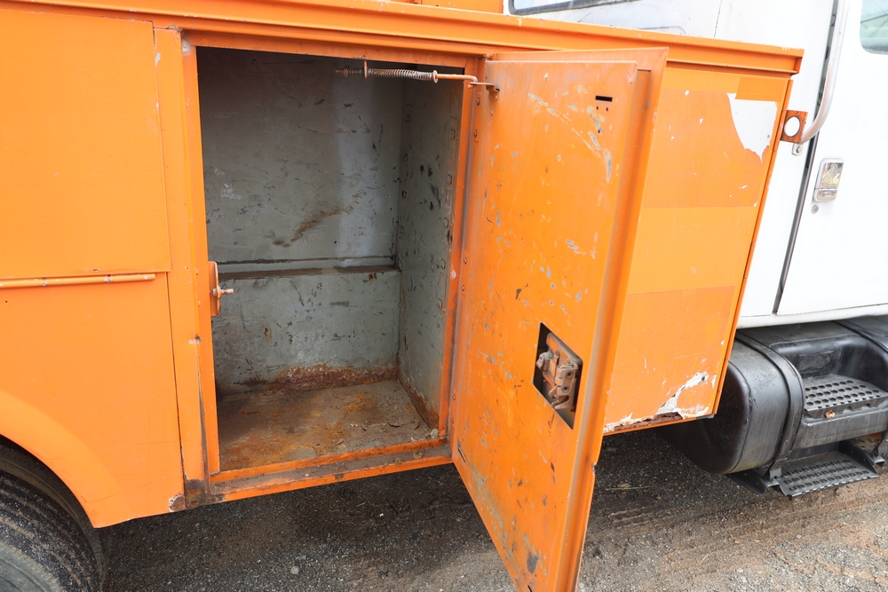 1998 International 4700 with a 7.3L V8 diesel engine. VIN: 1HTSCABK2WH529757. Odometer reading: 38209. Hour meter reading: 2048. Body: utility service truck with aerial boom. Equipped with Aero-Lift 2TPE-35 boom, 35 ft platform height, 500 lb capacity, dual rear wheels, side storage compartments, rear hitch, strobe light, and in-cab boom controls.