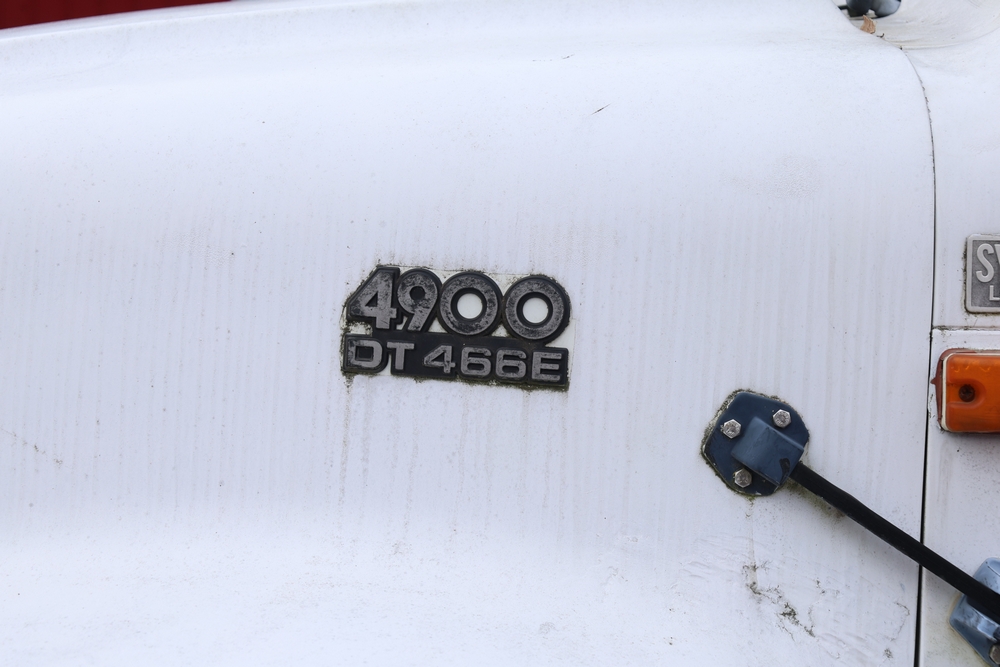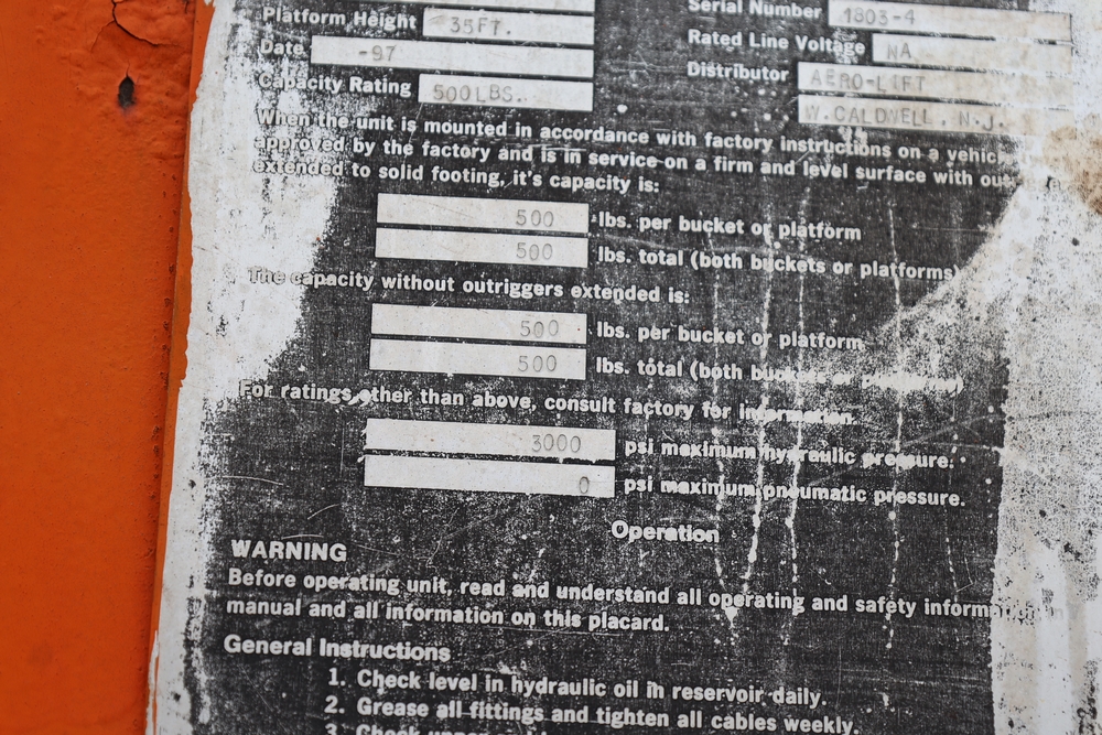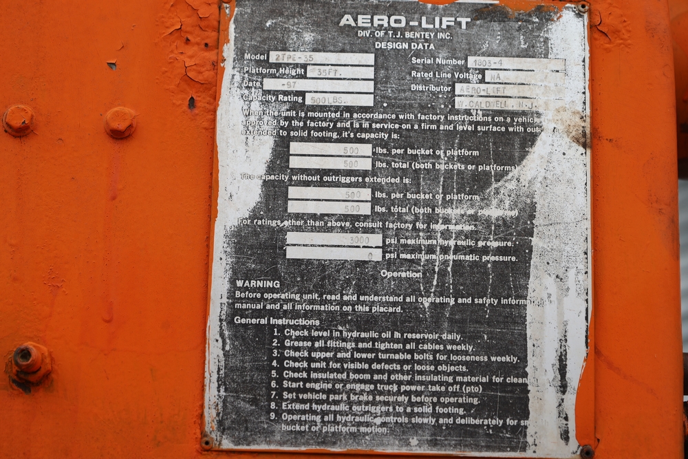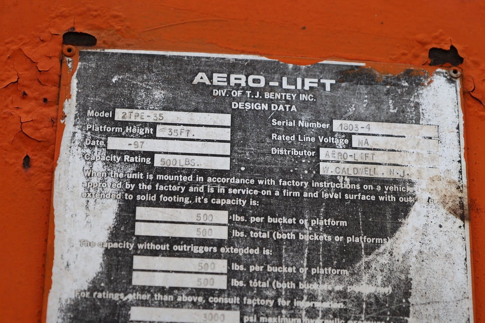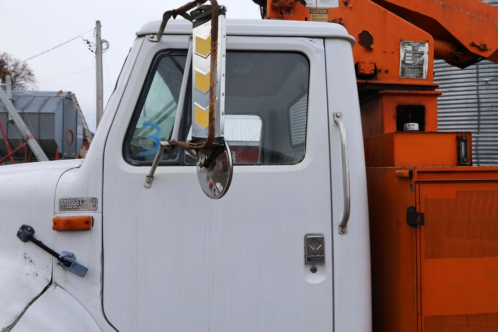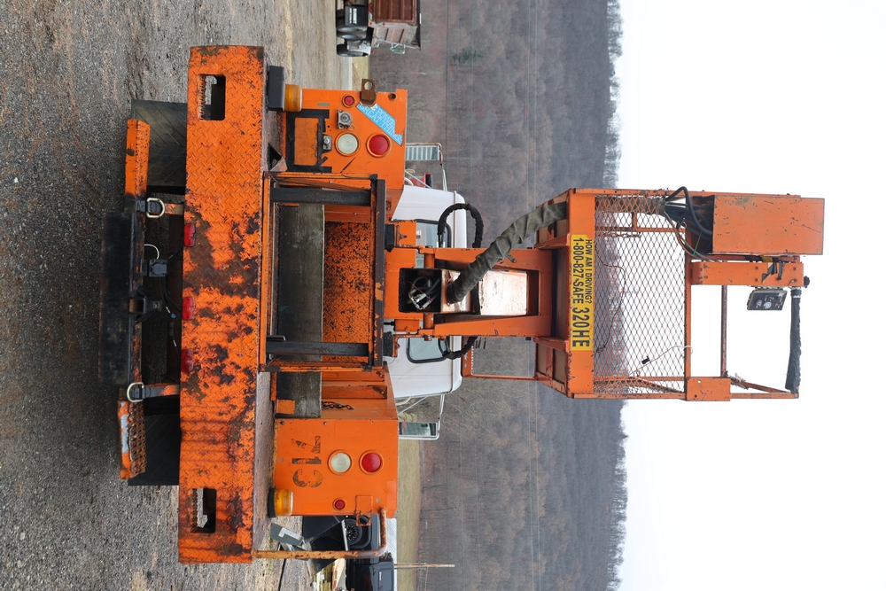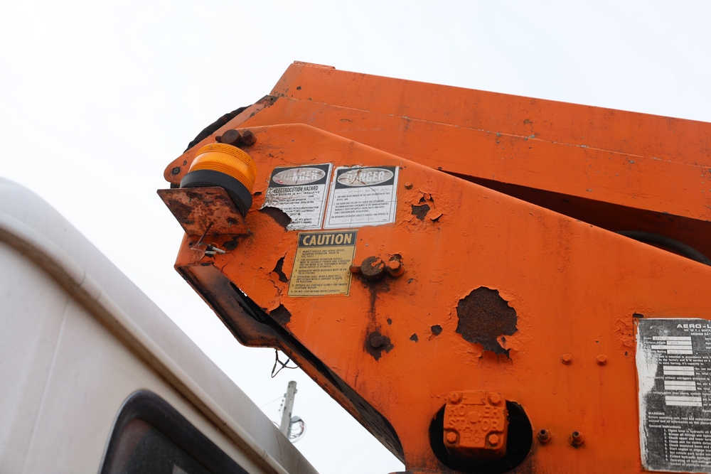 1998 International 4700 with a 7.3L V8 diesel engine. VIN: 1HTSCABK2WH529757. Odometer reading: 38209. Hour meter reading: 2048. Body: utility service truck with aerial boom. Equipped with Aero-Lift 2TPE-35 boom, 35 ft platform height, 500 lb capacity, dual rear wheels, side storage compartments, rear hitch, strobe light, and in-cab boom controls.