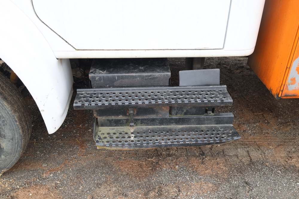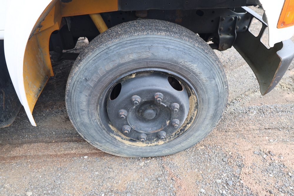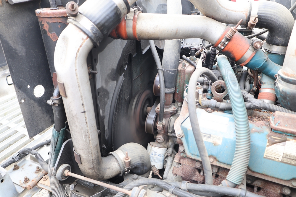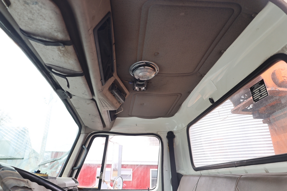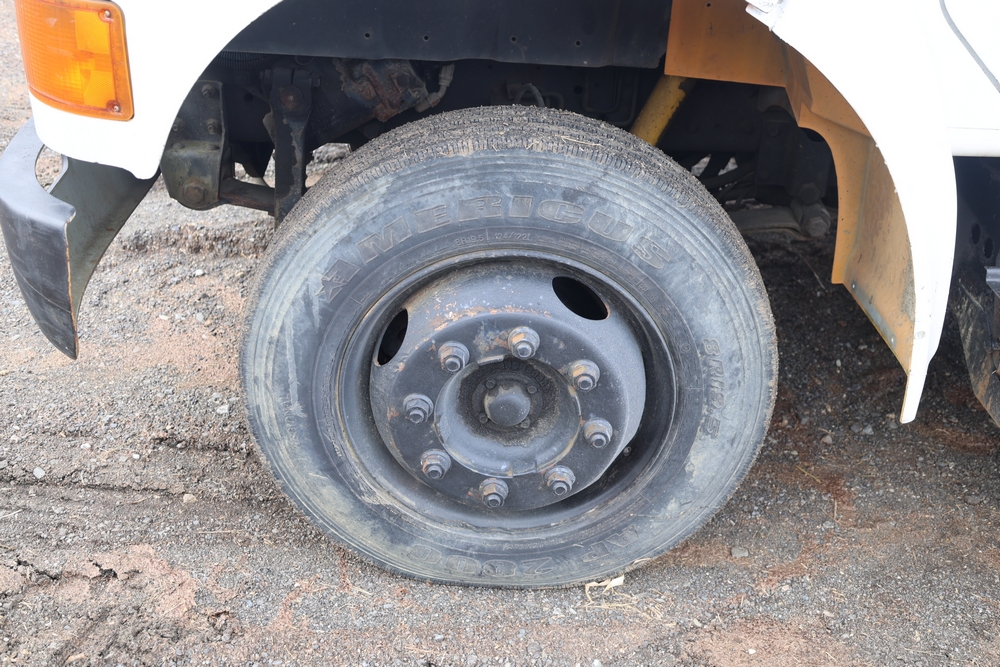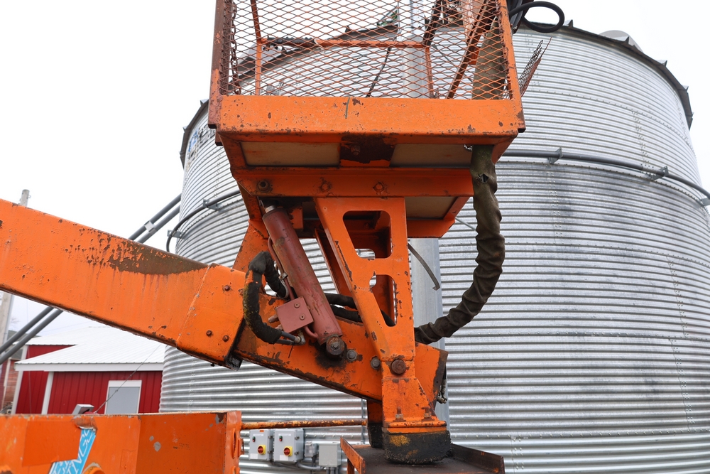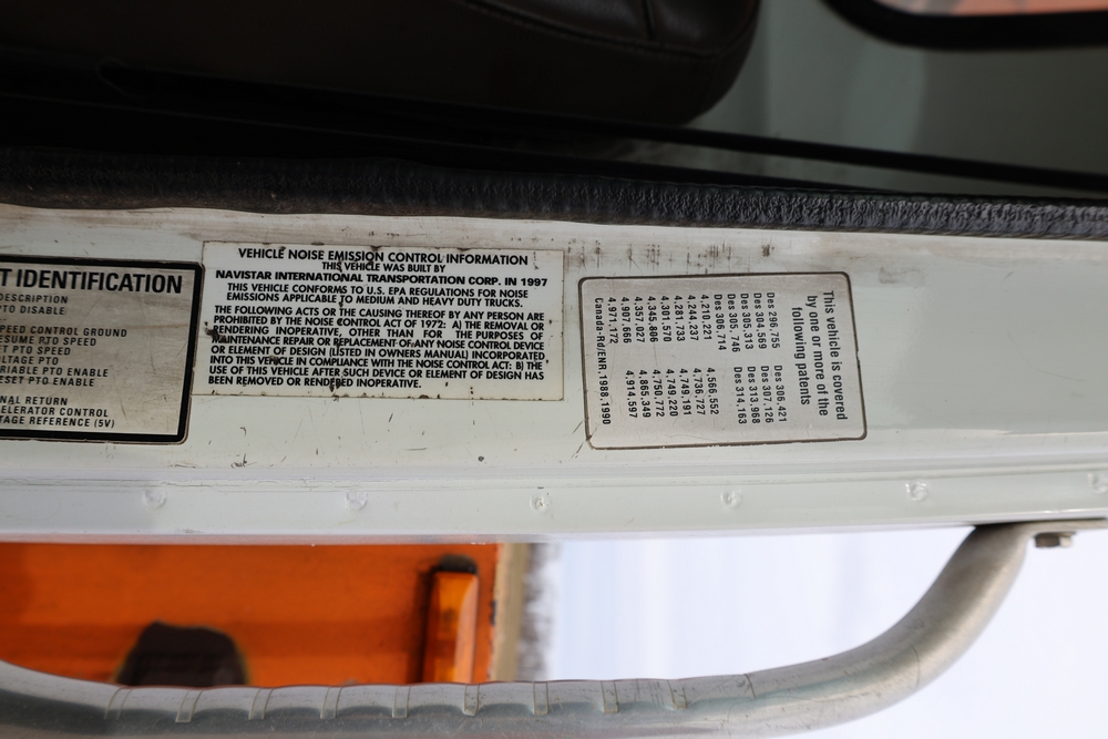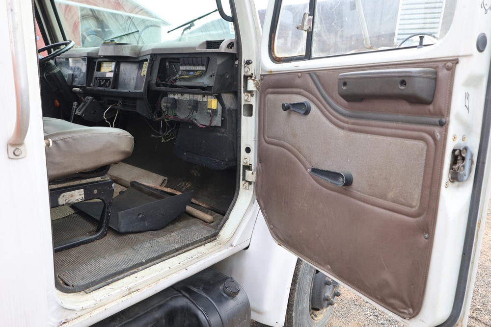1998 International 4700 with a 7.3L V8 diesel engine. VIN: 1HTSCABK2WH529757. Odometer reading: 38209. Hour meter reading: 2048. Body: utility service truck with aerial boom. Equipped with Aero-Lift 2TPE-35 boom, 35 ft platform height, 500 lb capacity, dual rear wheels, side storage compartments, rear hitch, strobe light, and in-cab boom controls.