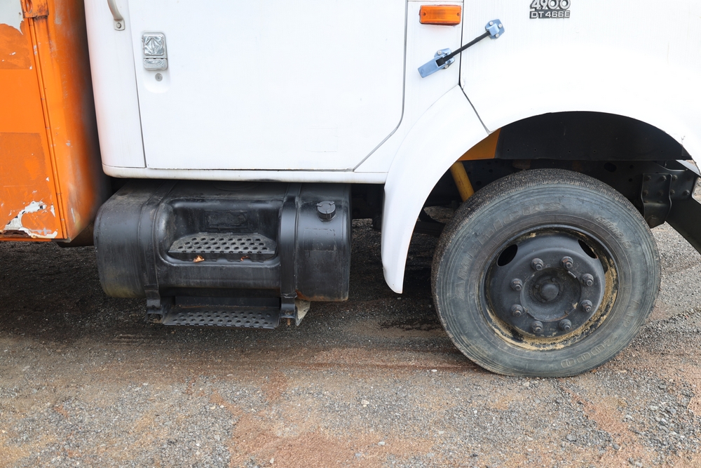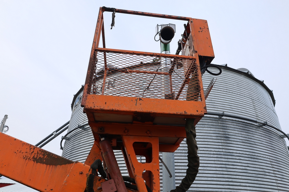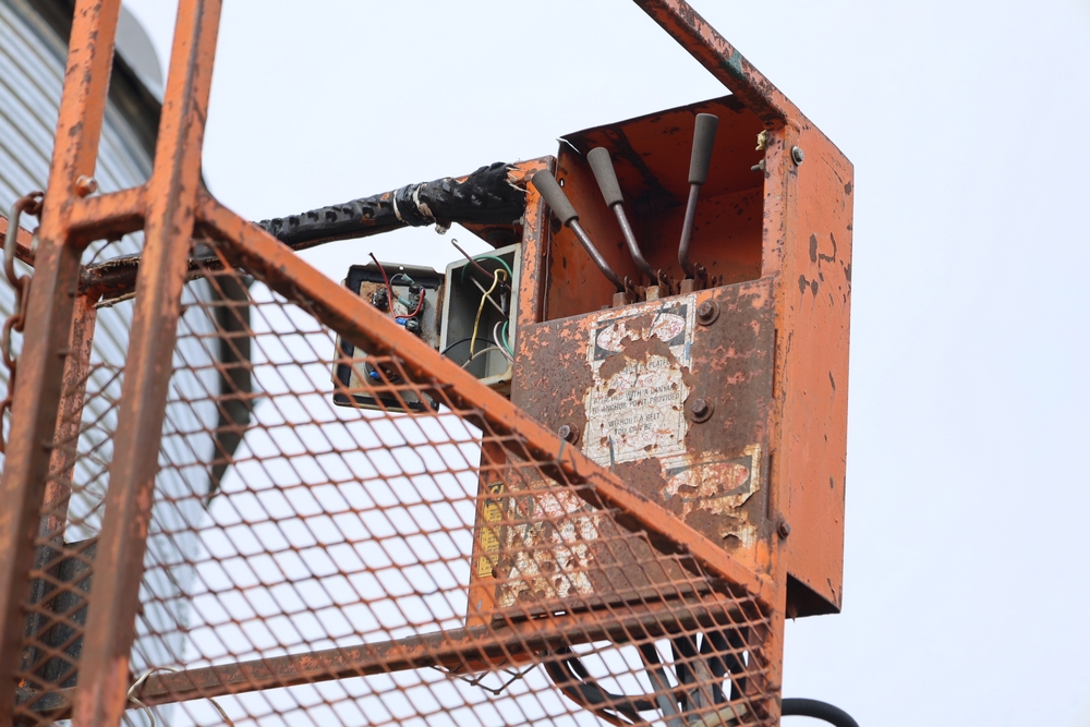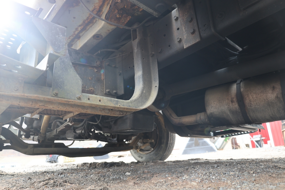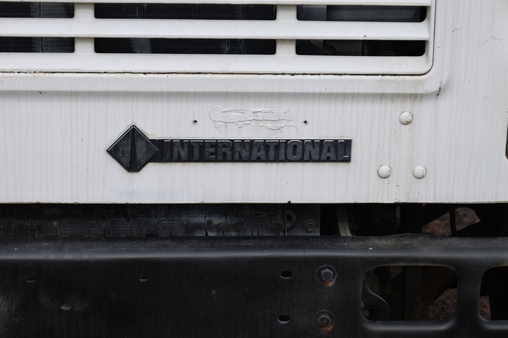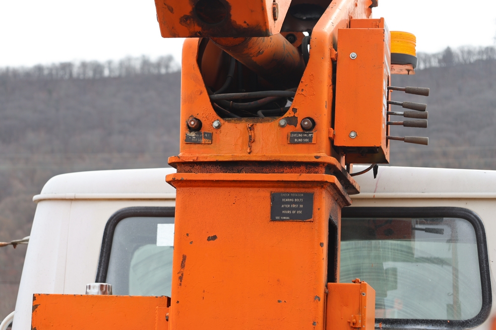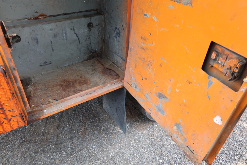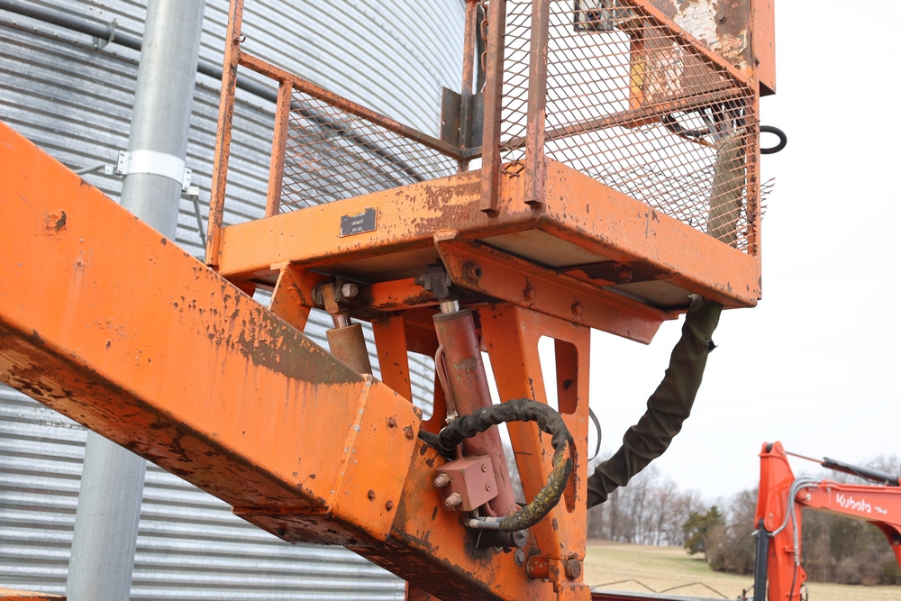 1998 International 4700 with a 7.3L V8 diesel engine. VIN: 1HTSCABK2WH529757. Odometer reading: 38209. Hour meter reading: 2048. Body: utility service truck with aerial boom. Equipped with Aero-Lift 2TPE-35 boom, 35 ft platform height, 500 lb capacity, dual rear wheels, side storage compartments, rear hitch, strobe light, and in-cab boom controls.