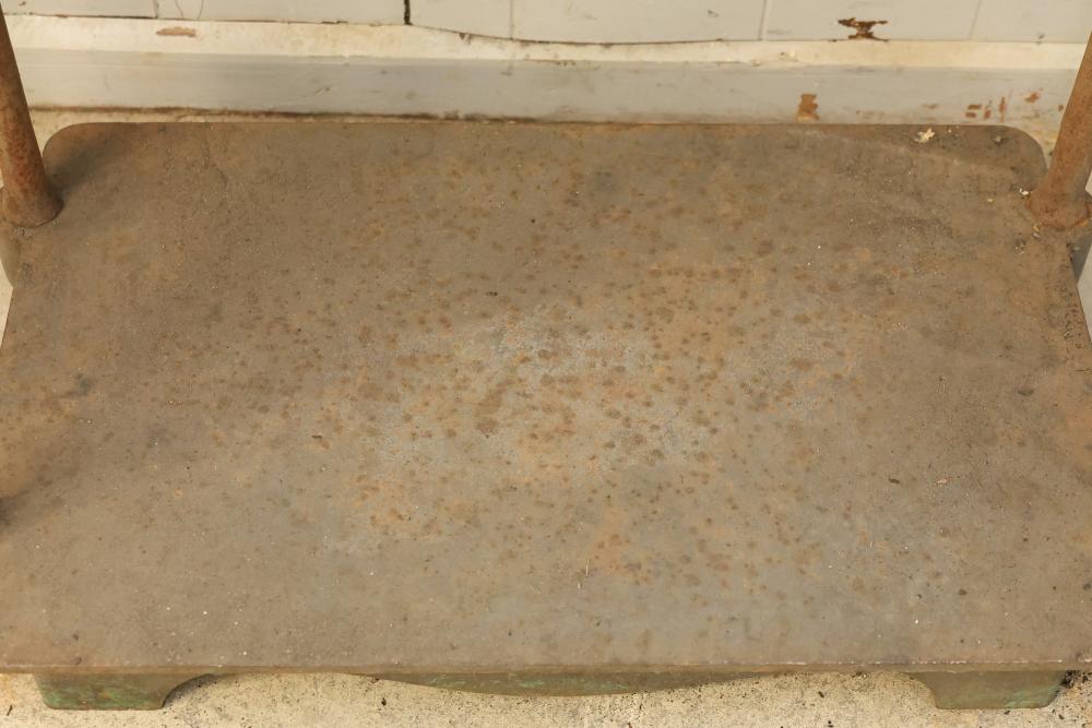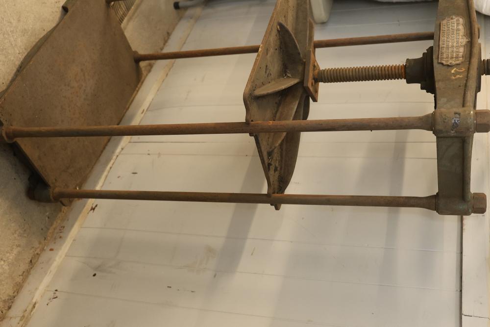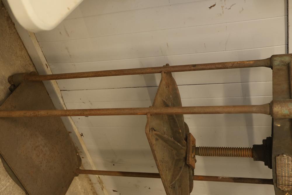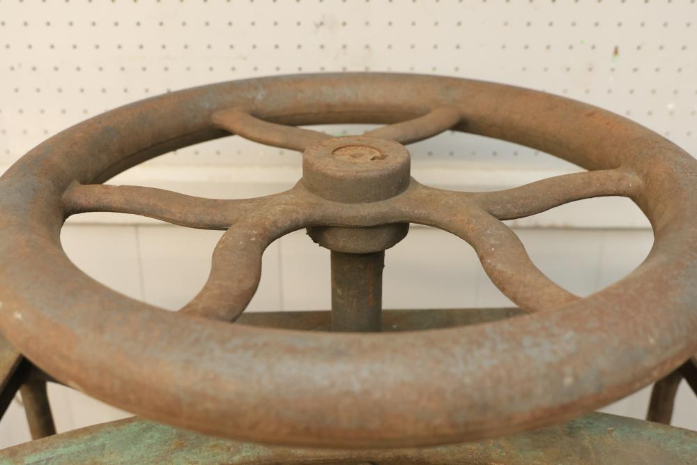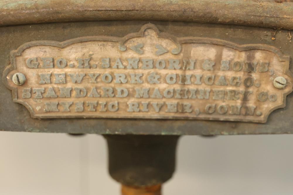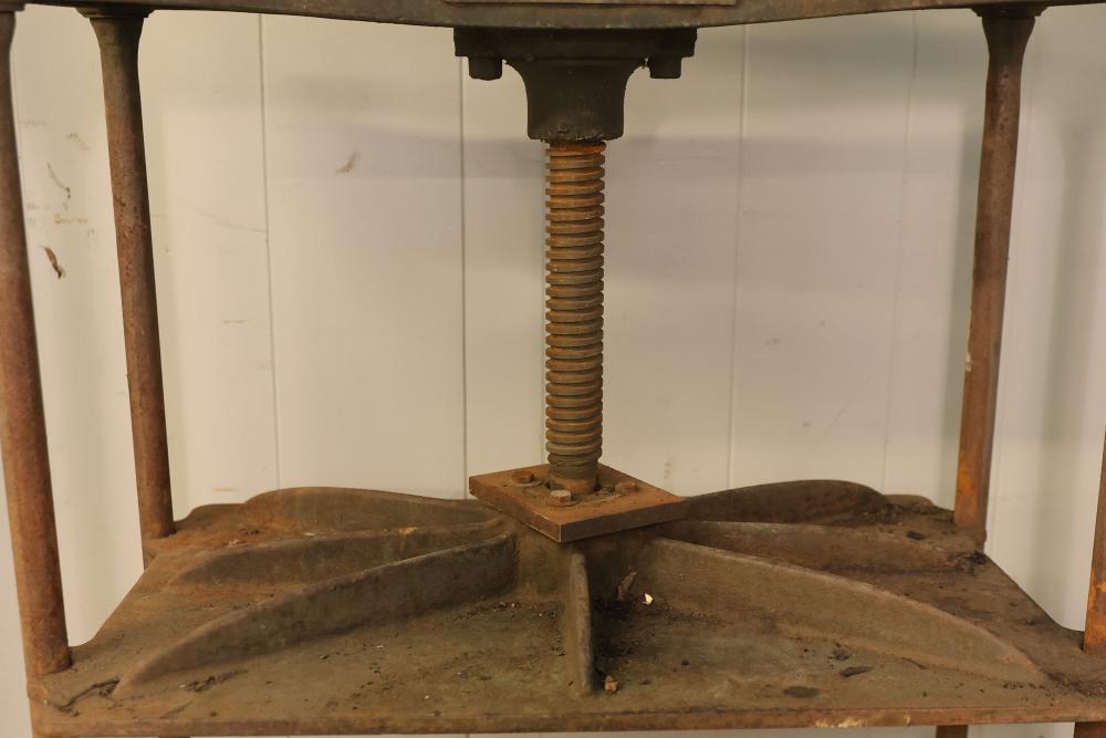 Sanborn & Sons Manufacturing Company Cast-Iron Book Embossing Press Frame. Features a cast-iron frame with a hand-operated wheel and screw mechanism. Includes a sturdy multi-shelf construction with a labeled plaque indicating the manufacturer. Notable surface wear and rust consistent with age and use. Pickup only.
