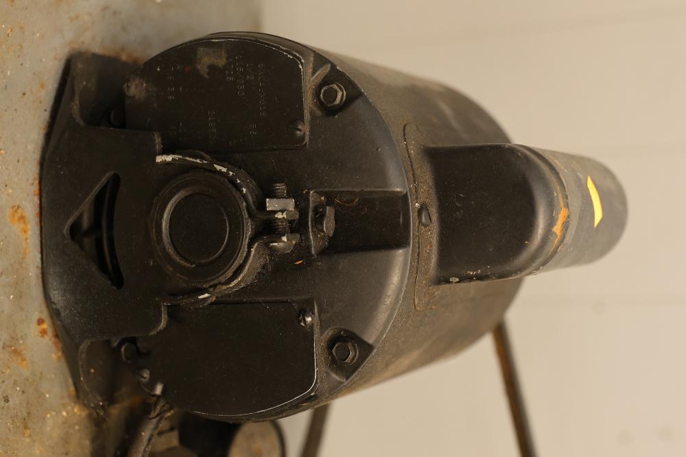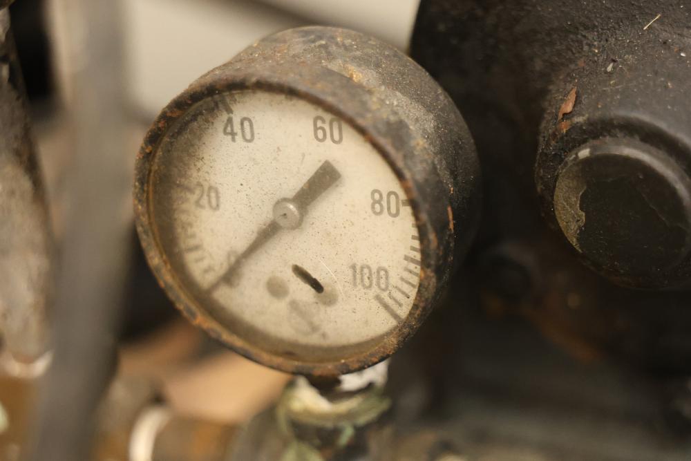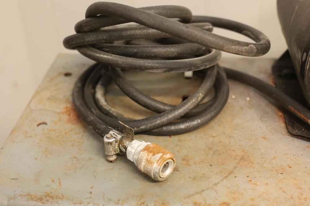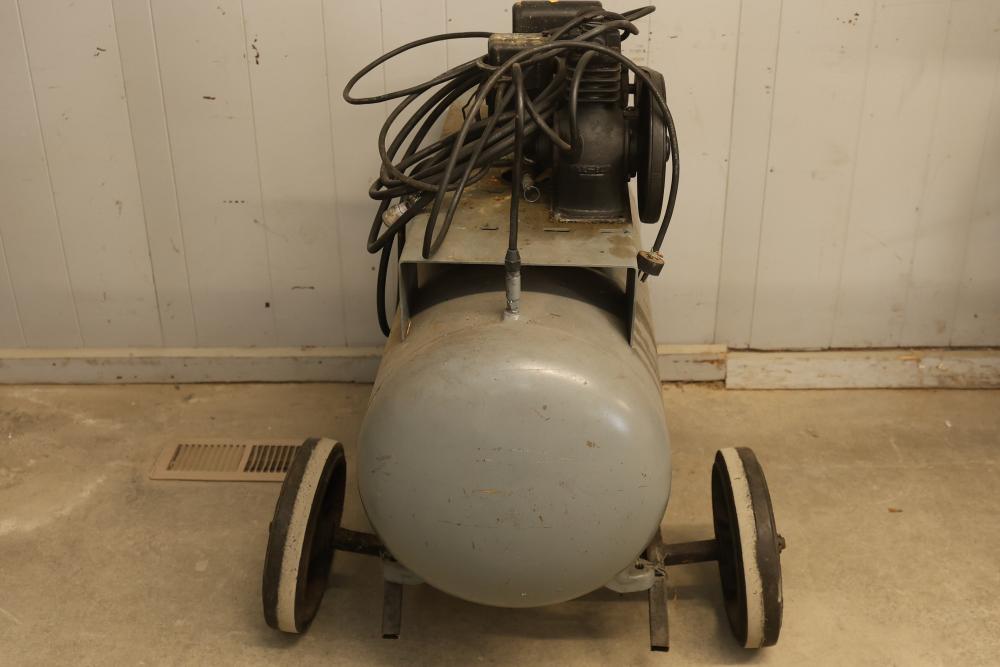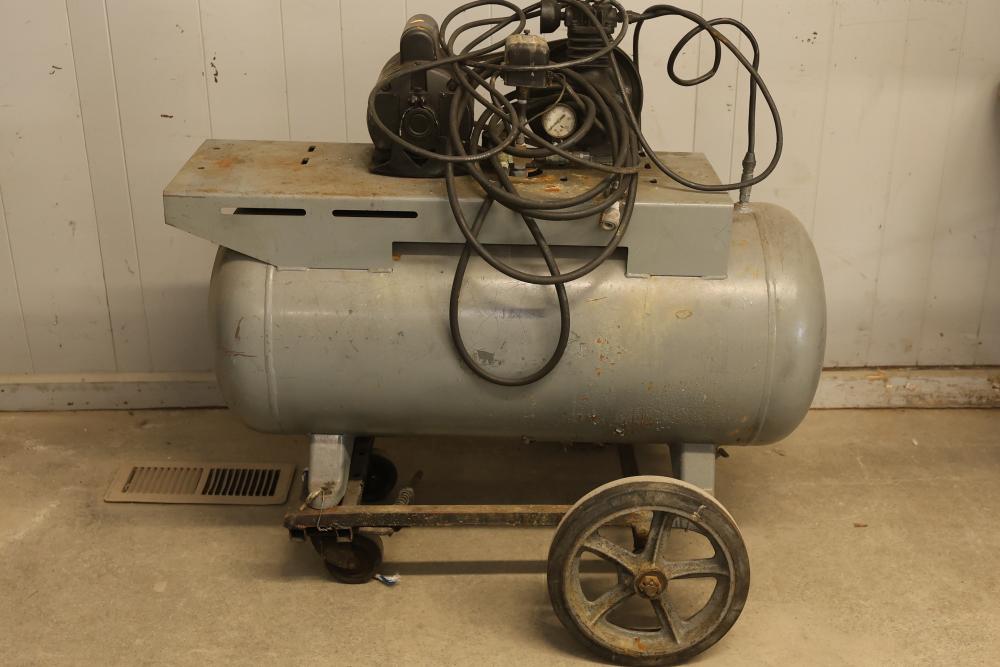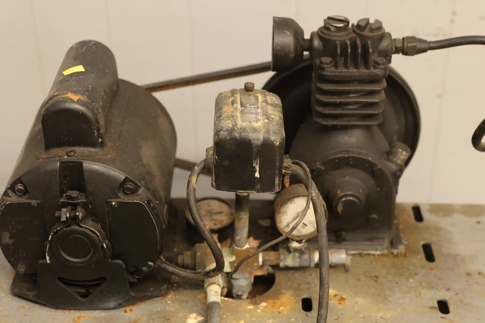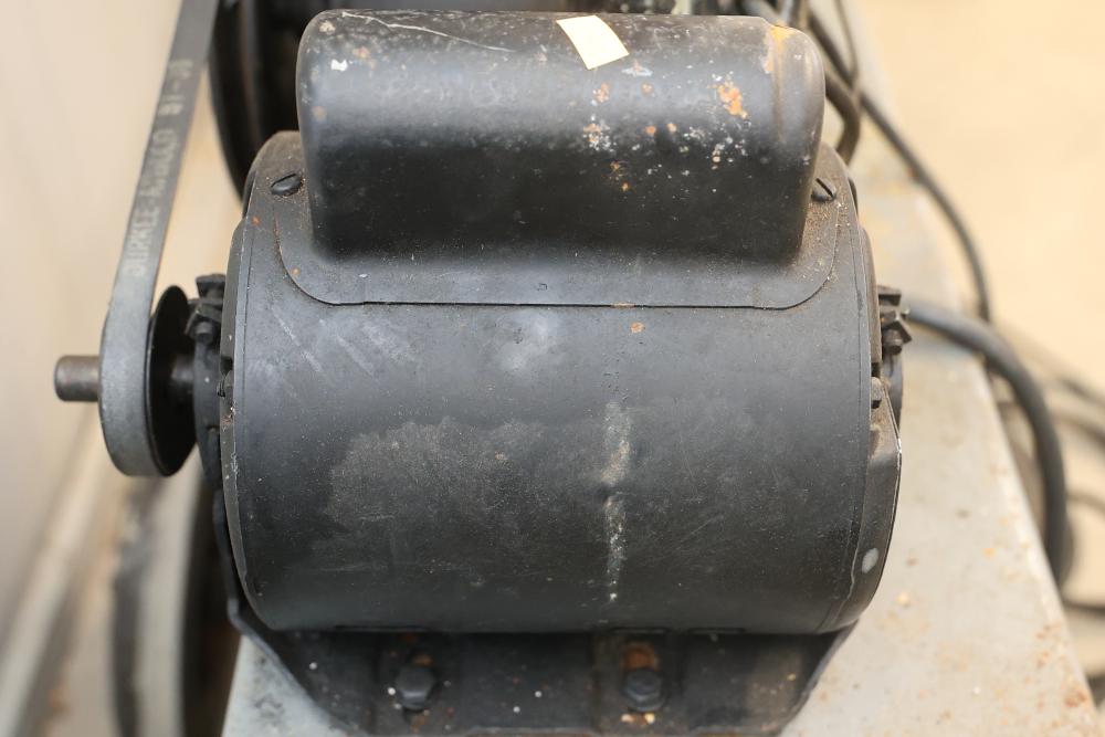 Portable Air Compressor with General Electric 5KC43MG1B Belt Drive Motor. Features a 0.5 HP motor operating at 1725 RPM with a 115/230V single-phase configuration and a 56 frame size. Capable of up to 60 PSI. Includes a wheeled base for mobility and a visible pressure gauge. Shows signs of wear and use. Pickup only.