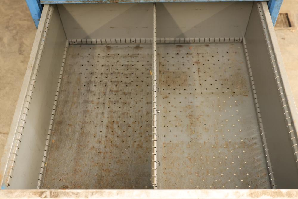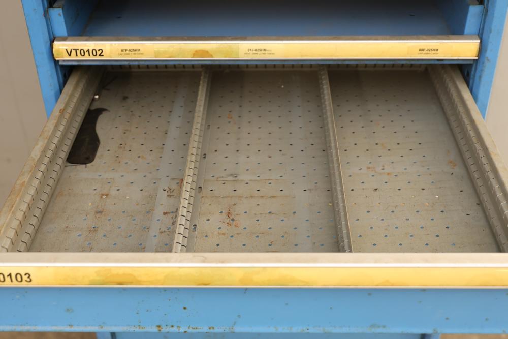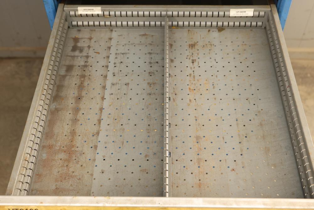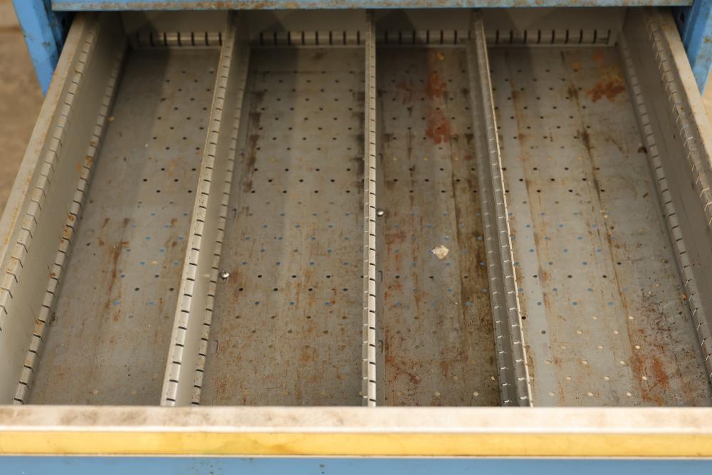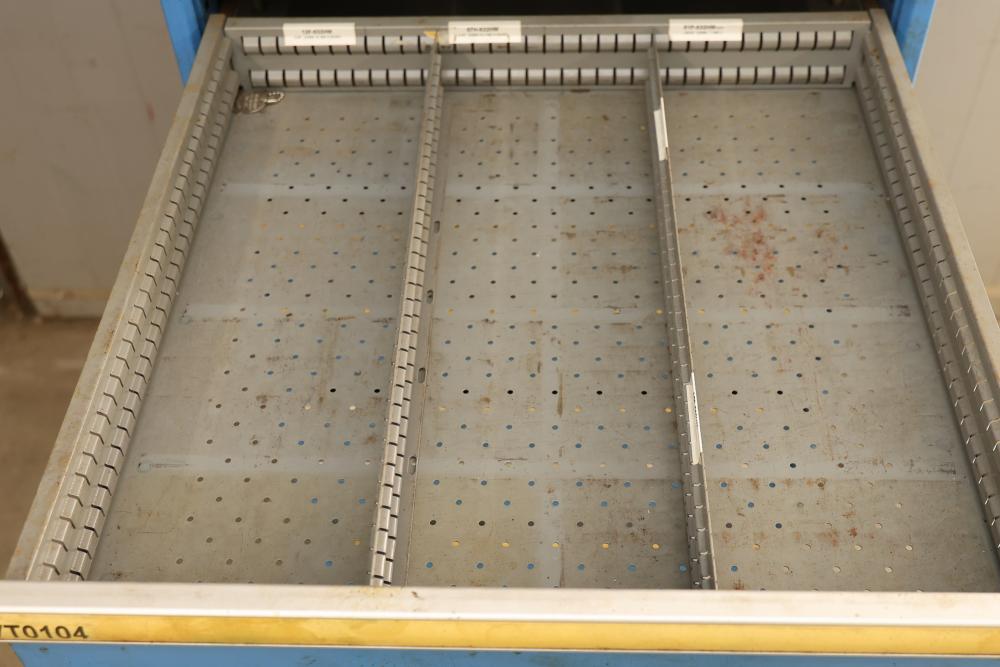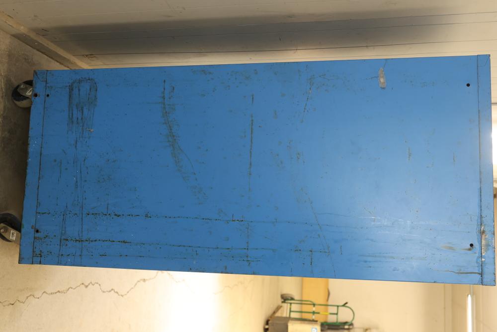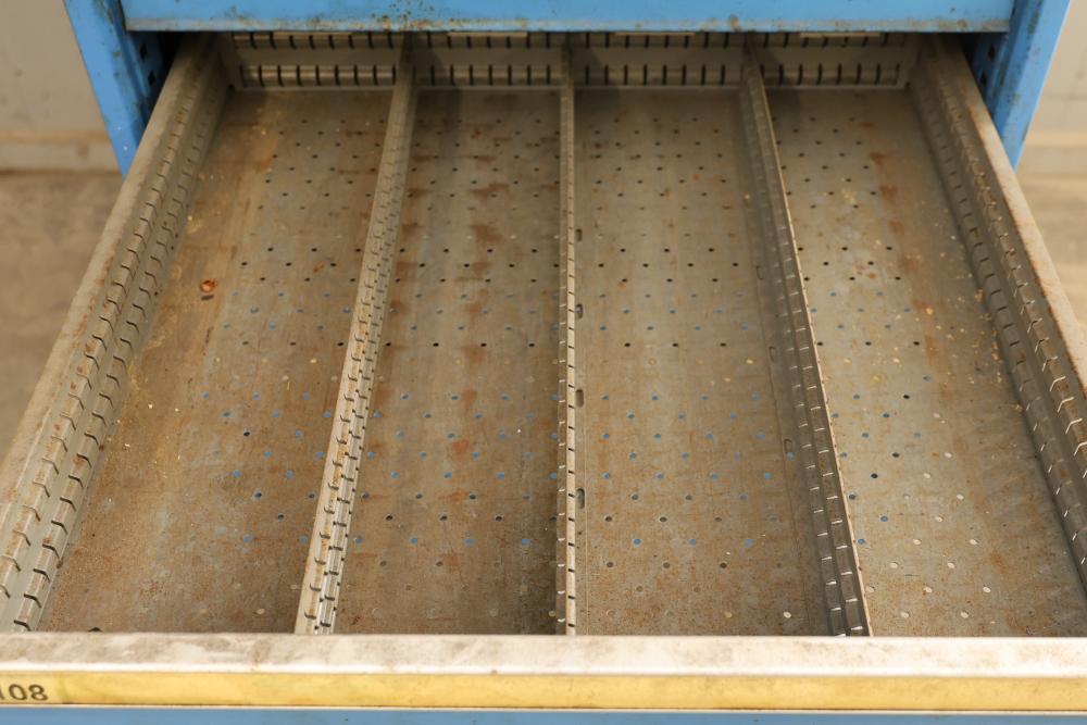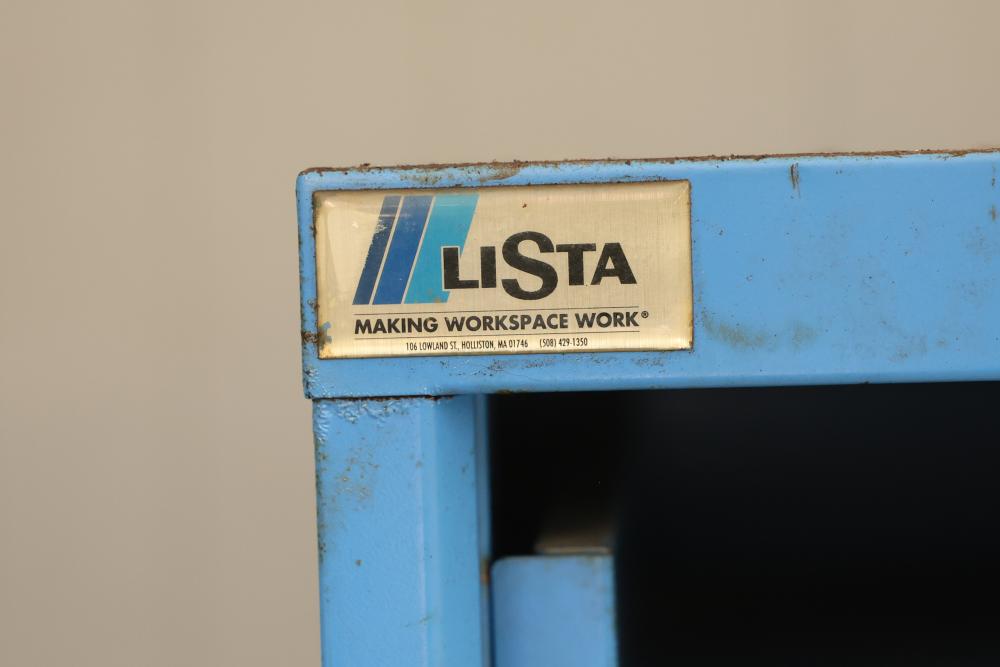 Lista Industrial Modular 11 drawer rolling Cabinet. Measures approximately 70.5 inches long, 28.5 inches wide, and 28.5 inches deep. Missing two drawers and no key is included shows some signs of wear and tear and usage. Pickup only.