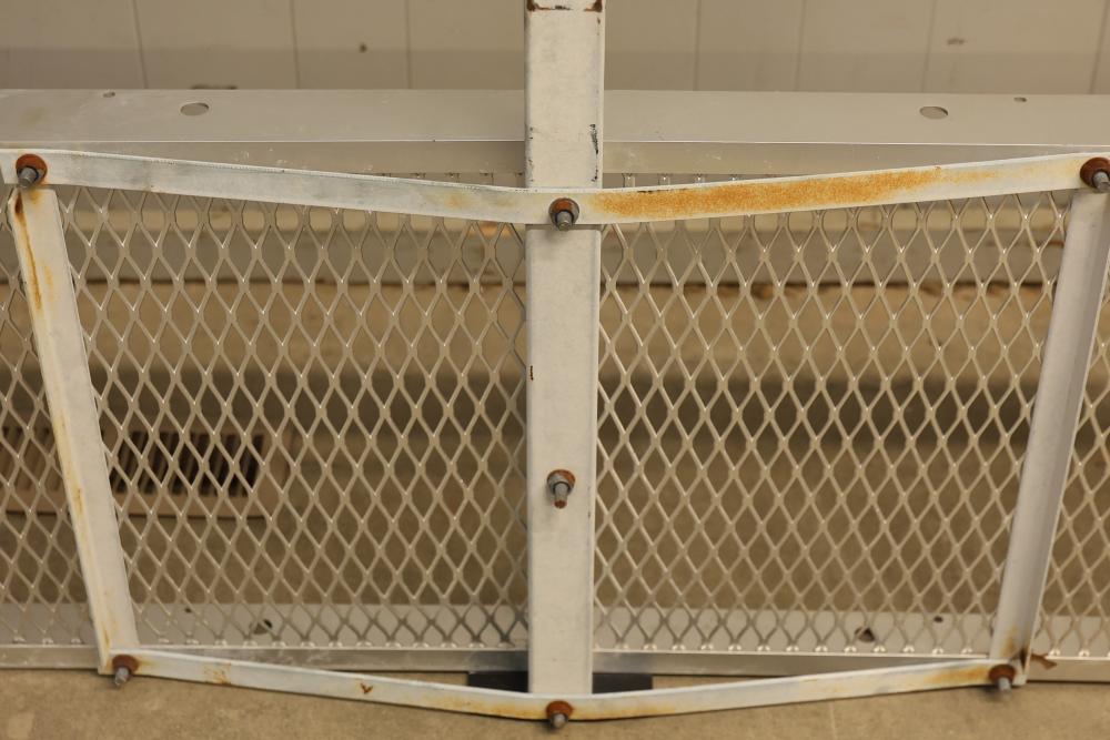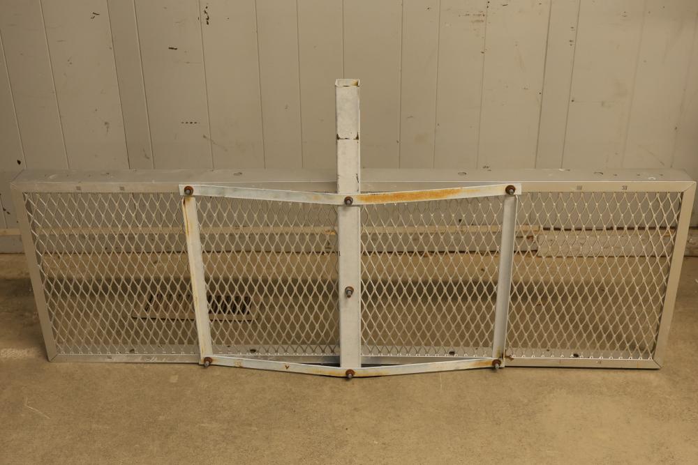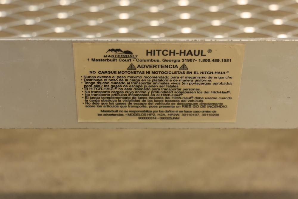 Masterbuilt Hitch-Haul Cargo Carrier, 60x19.5 Inches. Features a 2-inch square receiver opening. Weight capacity not listed on the unit. Designed with a metal mesh surface and sturdy construction. Some visible signs of wear and rust present. Pickup only.
