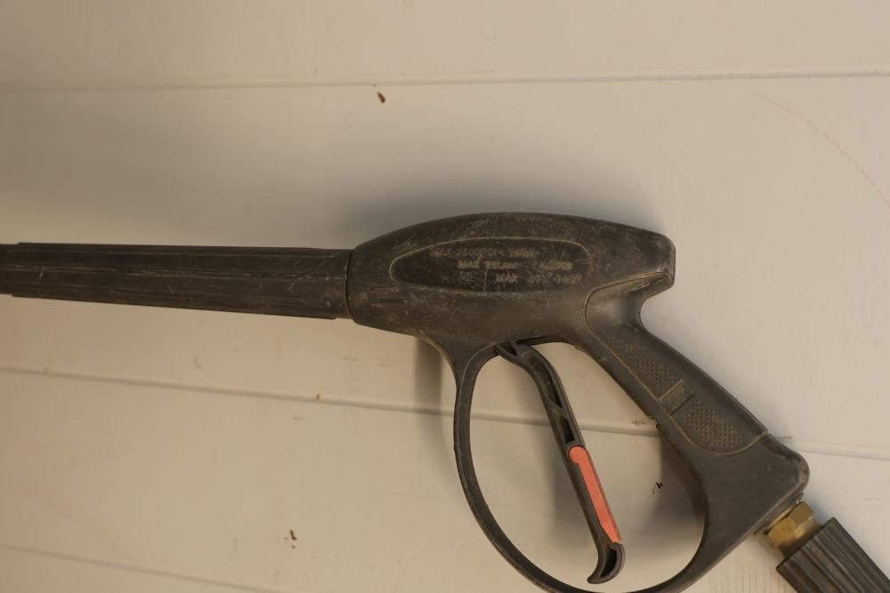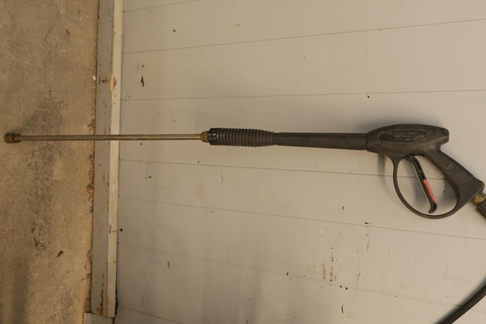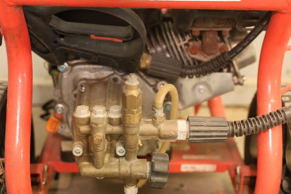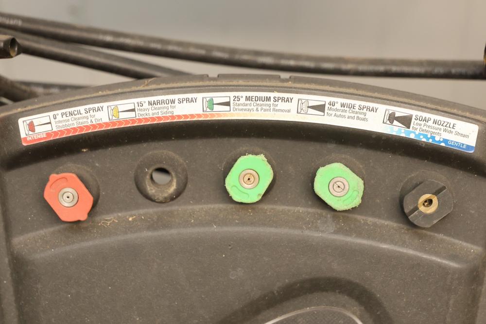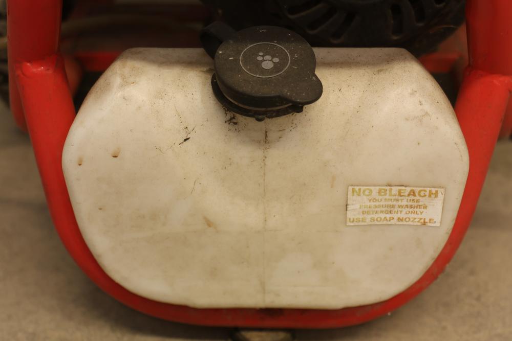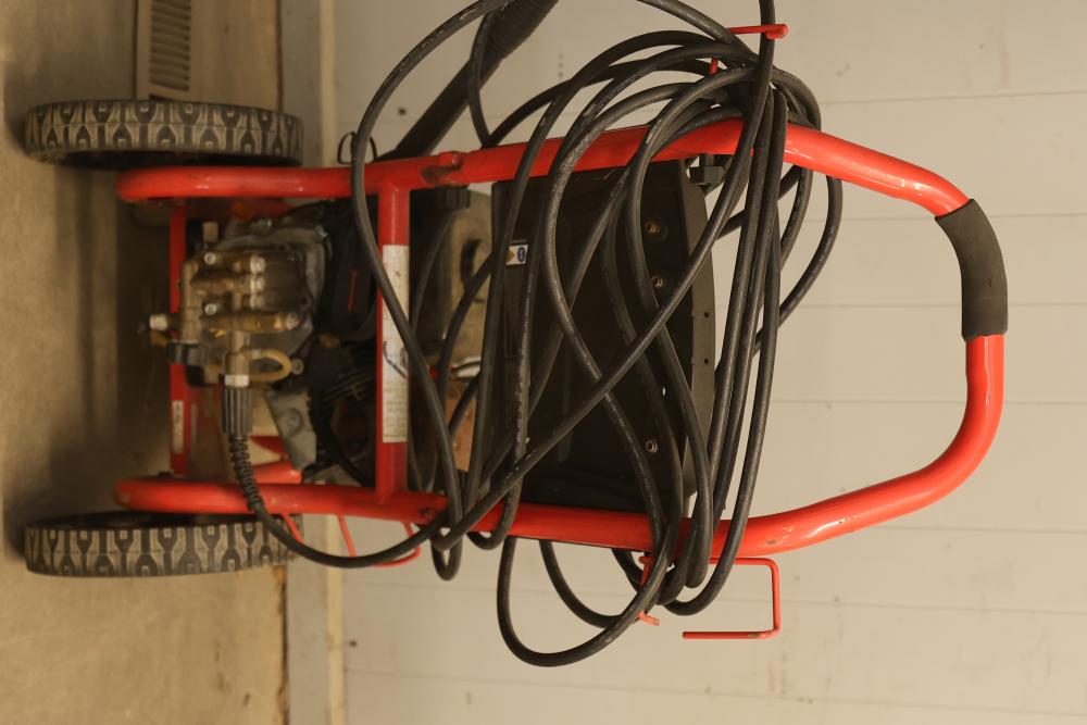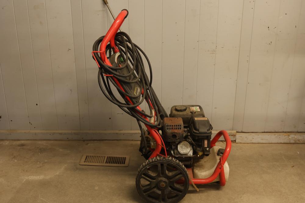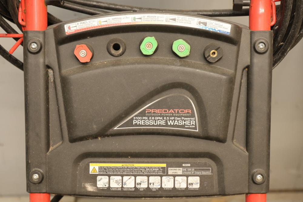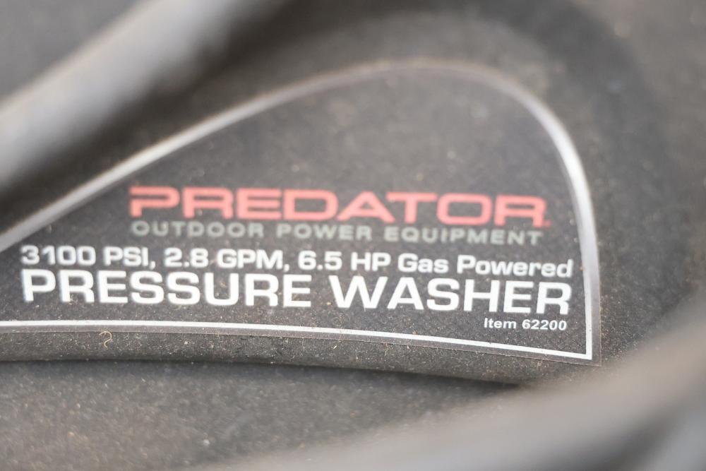 Predator Outdoor Power Equipment Model 62200 Power Washer, 3100 PSI, 2.8 GPM, 6.5 HP gas-powered unit. Includes wand and hoses but is missing the 15-degree narrow spray nozzle. Shows signs of prior use, with visible dirt and rust on some components. Pickup only.