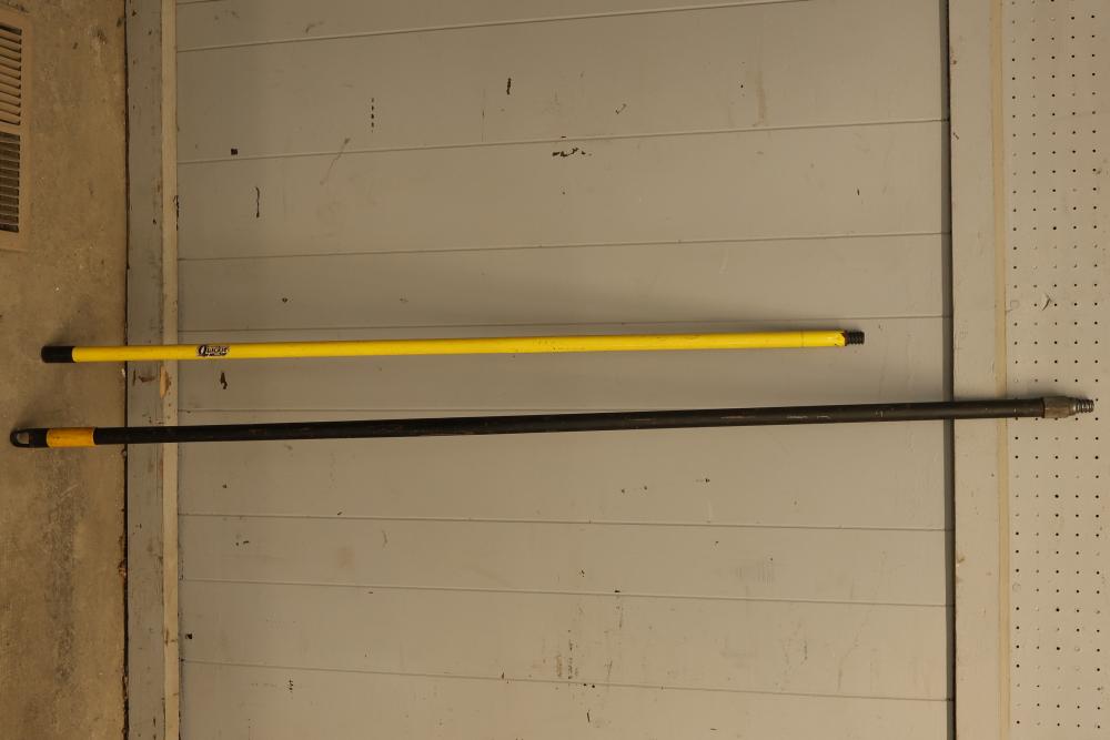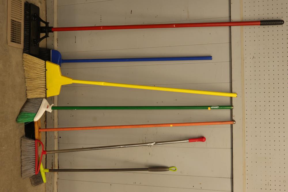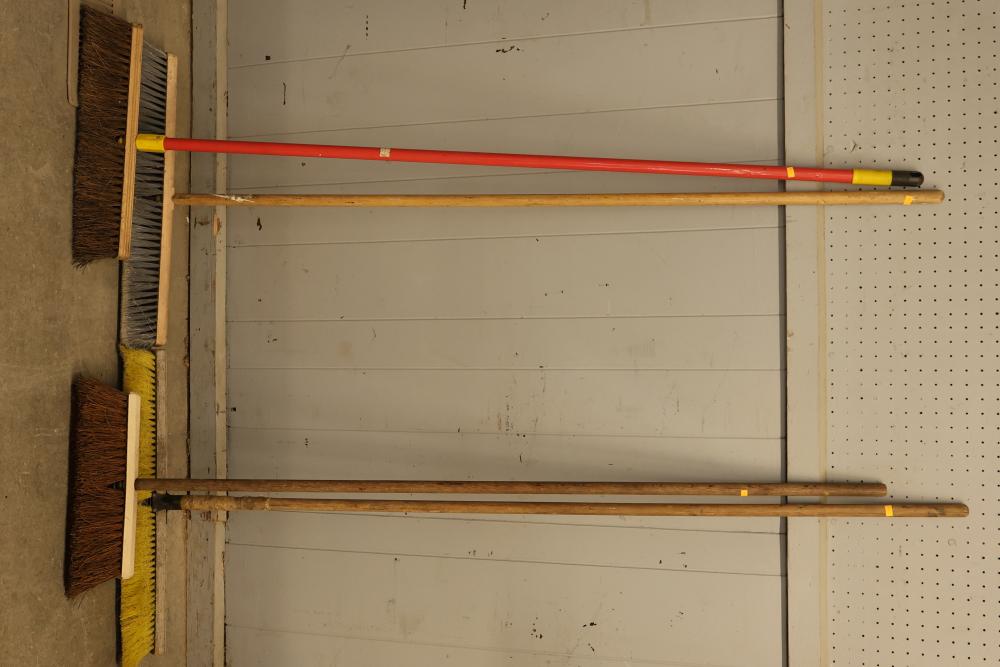 Maintenance Tools consisting of 4 Long-Handled Push Brooms, 7 Dust Brooms, and 2 Broom-Handles. These tools are specifically designed for sweeping and maintenance tasks. Items are in used condition. Pickup only.