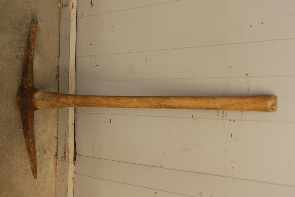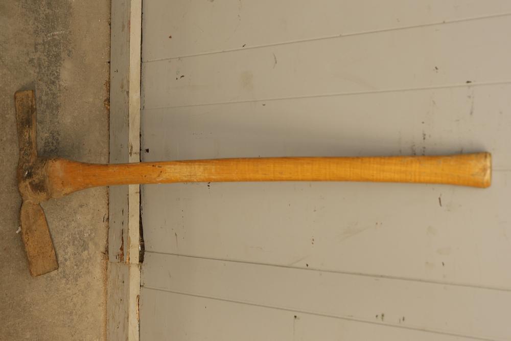 Striking Tools Including 2 Pickaxes and 1 Sledgehammer. Includes a sledgehammer with a wooden handle and two pickaxes with wooden handles. All tools show signs of previous use and wear consistent with their age. Pickup only.