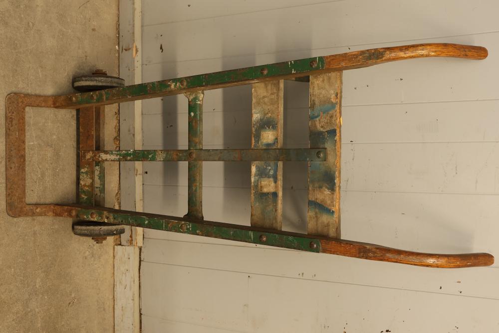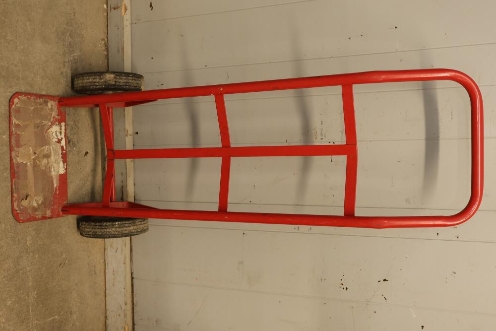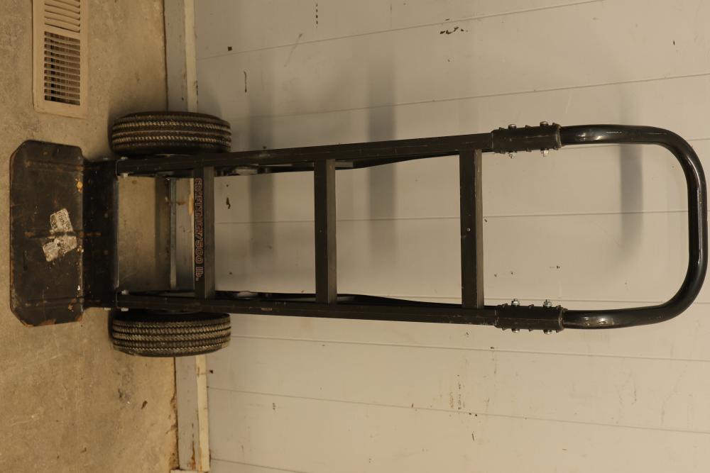 Transportation tools consisting of three hand trucks. Includes one wooden and metal hand truck, one black metal hand truck, and one red metal hand truck. Each features wheels for mobility and a design suitable for transporting various items. Pickup only.