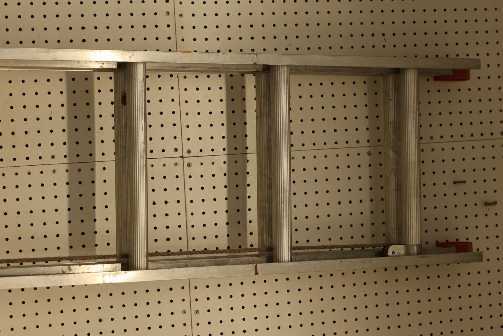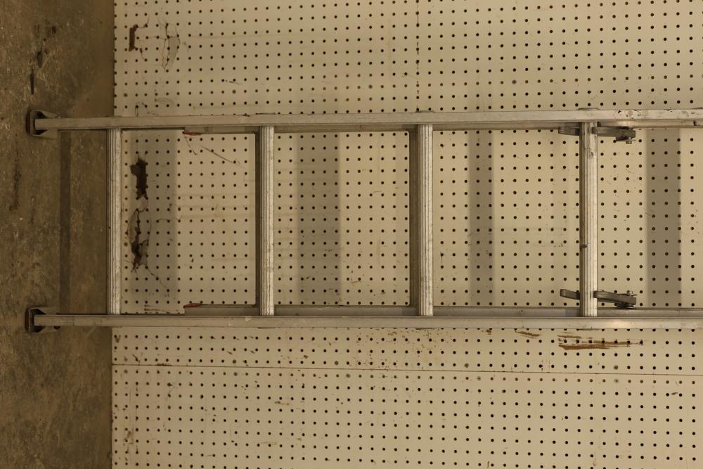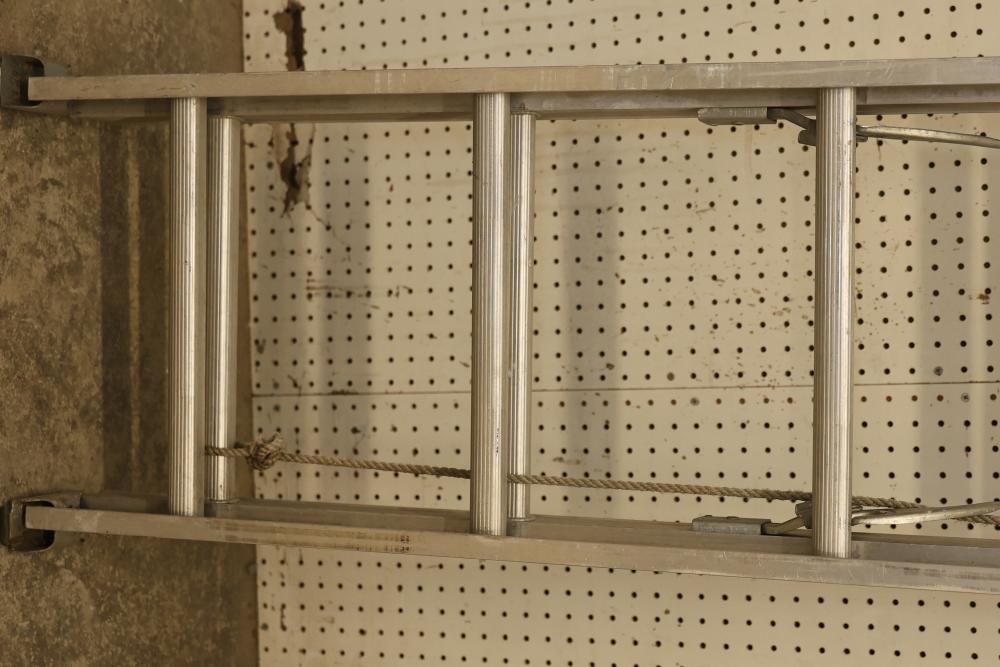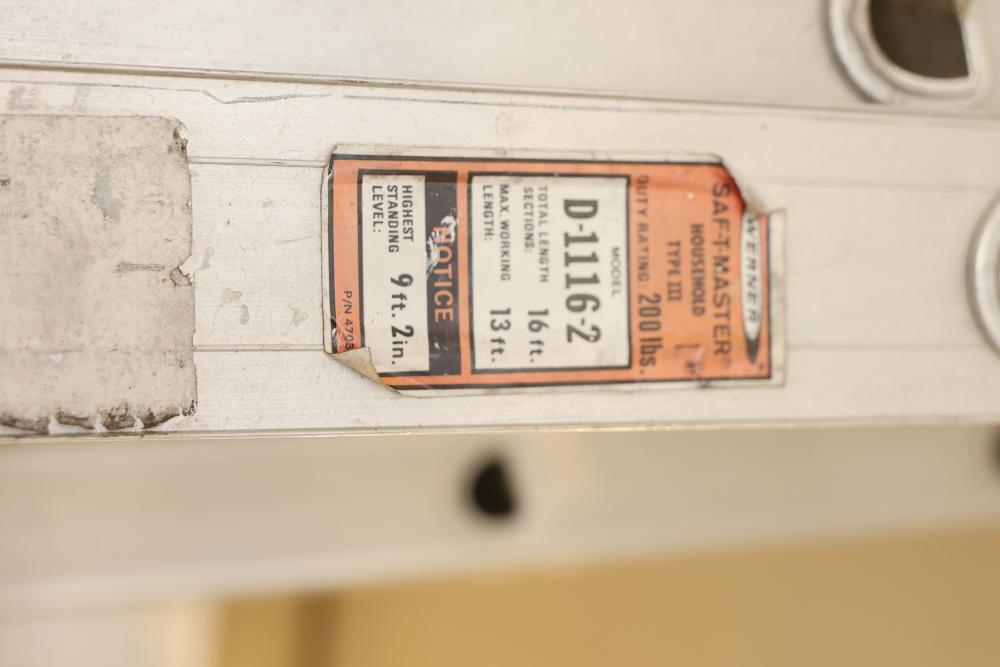 Access equipment including one Werner D-1116-2 Saf-T-Master 16' aluminum ladder and one unmarked 20' aluminum ladder. Werner ladder has a total length of 16', maximum working length of 13', and highest standing level of 9' 2". Both ladders are constructed from aluminum. Pickup only.