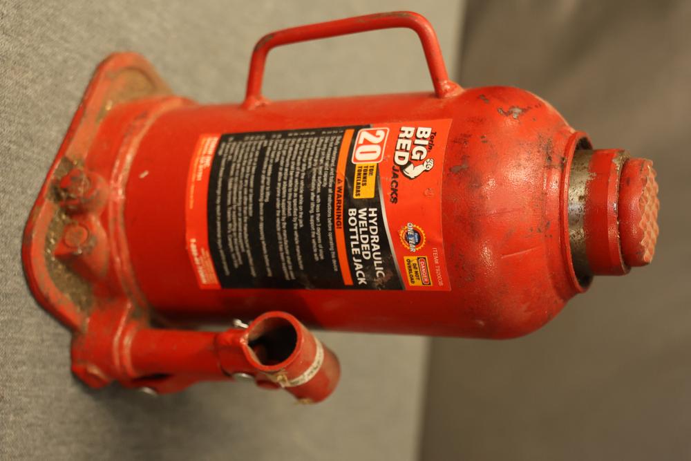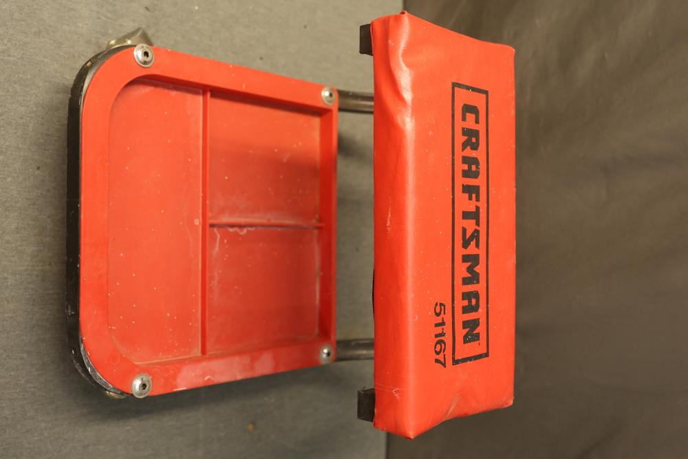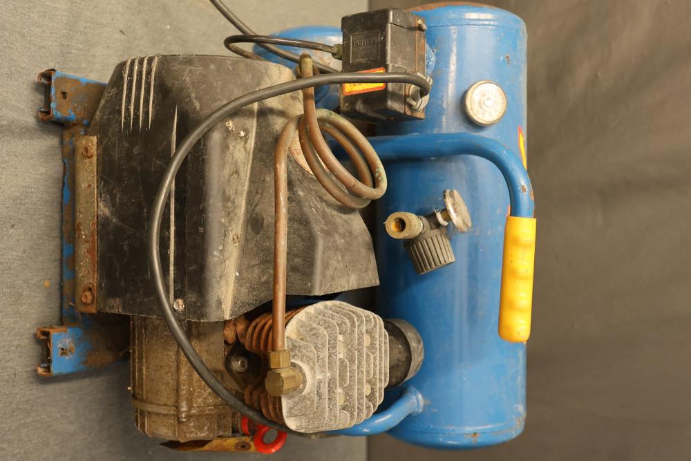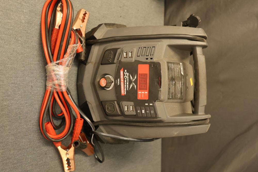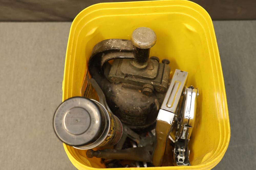 Hand Tools and Automotive Tools Set Including Storage Chest, Jacks, Compressor, and More. Includes a vintage storage chest with divided compartments, a vintage automotive jack, a Torin T92003B hydraulic welded bottle jack, a Schumacher 1200A battery extender with jumper cables, an Emglo Airmate portable air compressor (works intermittently), a Craftsman 51176 mechanic roller seat, and four buckets of various hand tools. Pickup only.