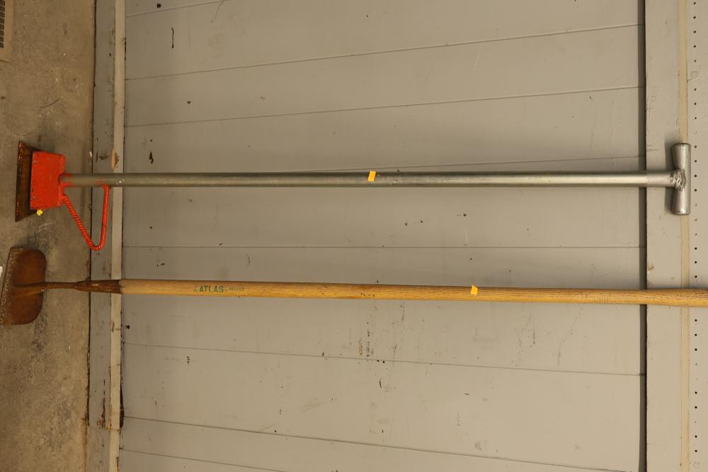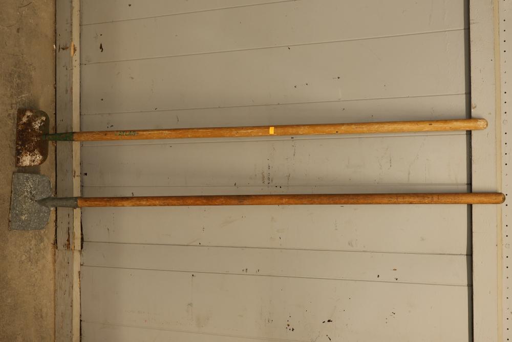 Landscaping Tools Set Including Shovels, Hoes, and Scrapers. Includes a variety of tools such as long-handle hoes, a T-handle tool, scrapers, and digging implements, each with wood or metal handles. Ideal for gardening or landscaping purposes. Pickup only.
