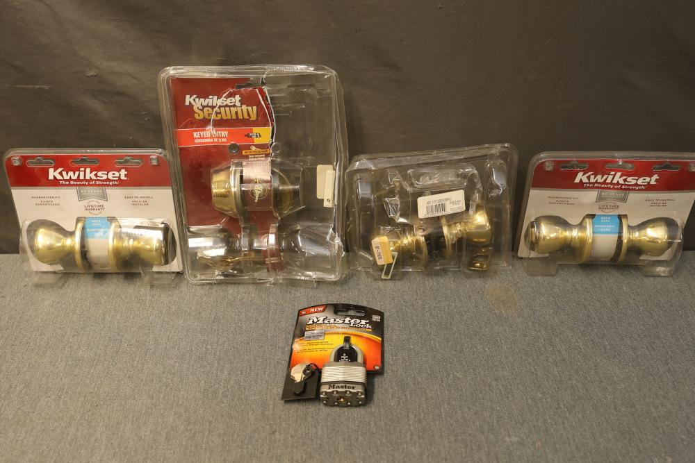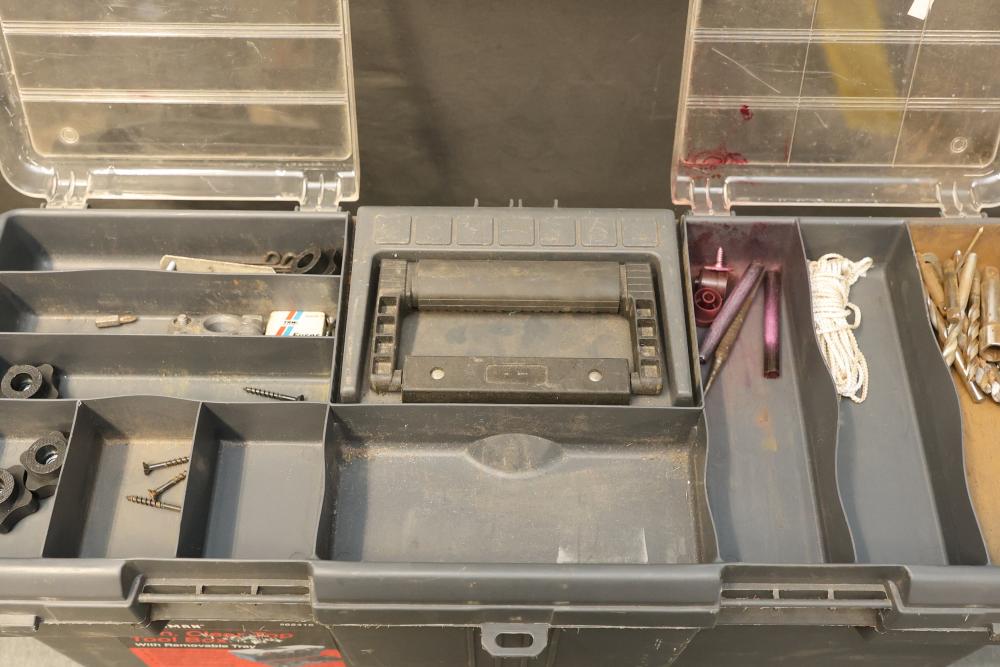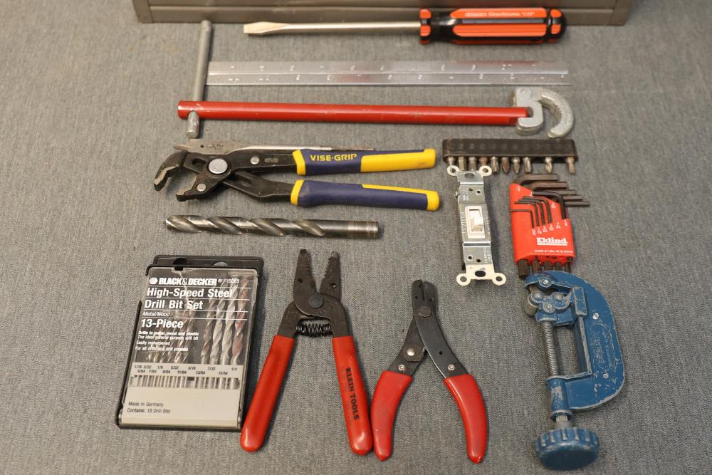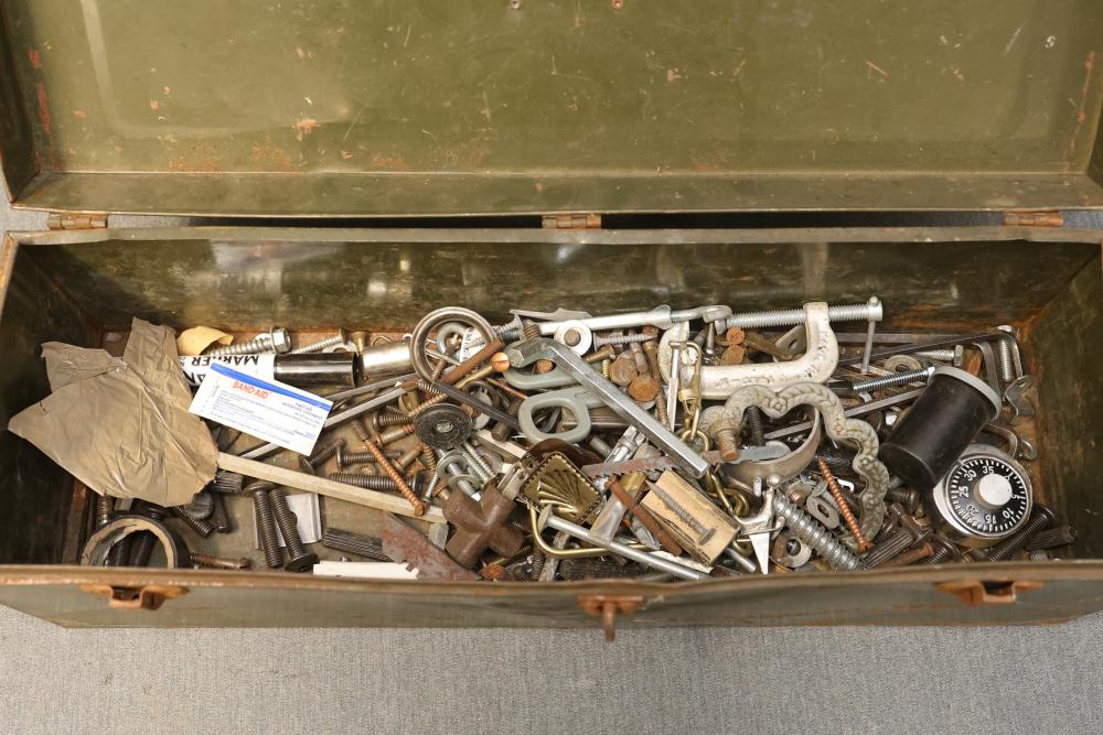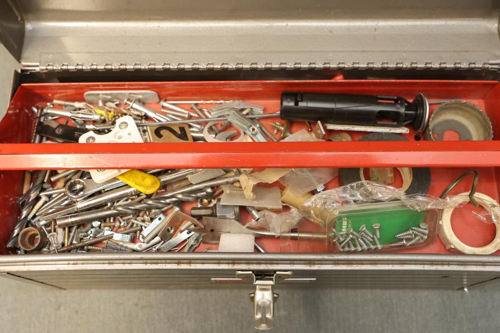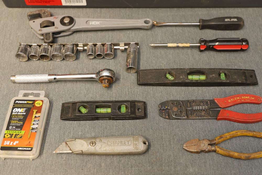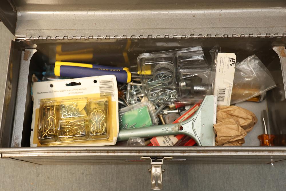 Toolboxes, Tools, Doorknob Sets, and Accessories. Includes five toolboxes (various tools inside), doorknob sets with some pieces missing, a Master Lock with key, Harris-Dracon TS21 Telephone Test Set, Black and Decker 71960 screwdriver bit organization case (some bits included), tool holsters, a lightbulb changer, and a moving dolly. Pickup only.