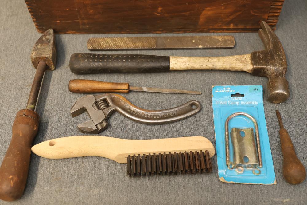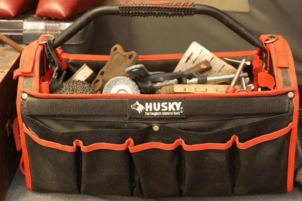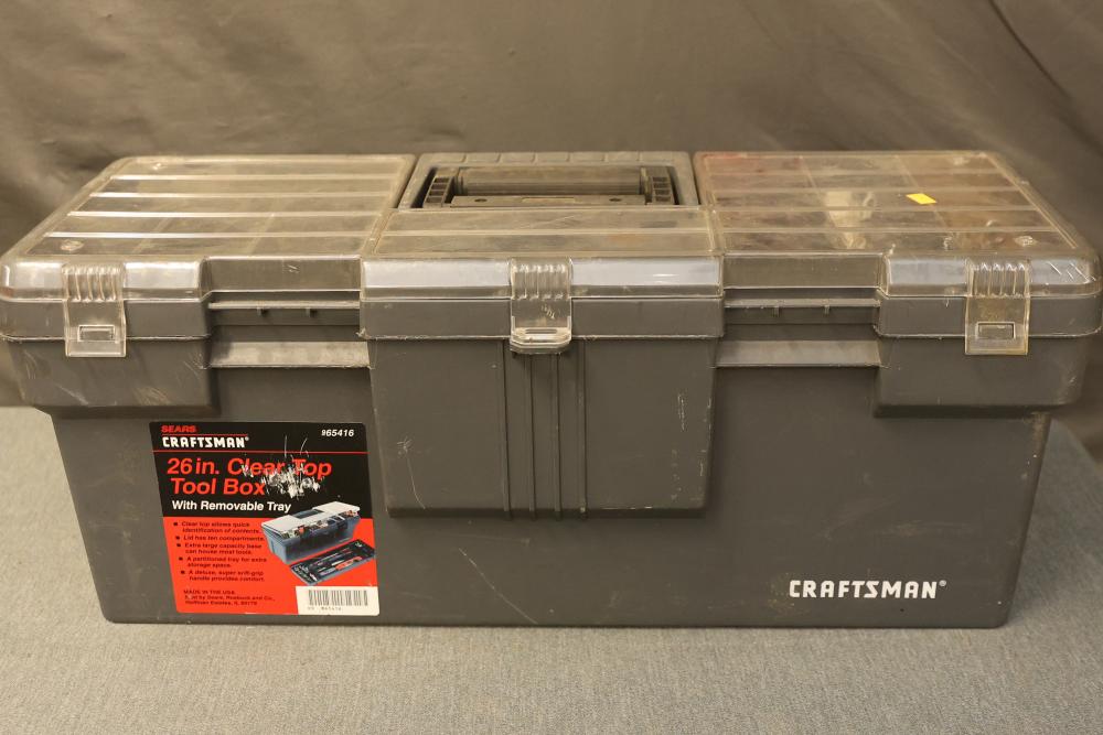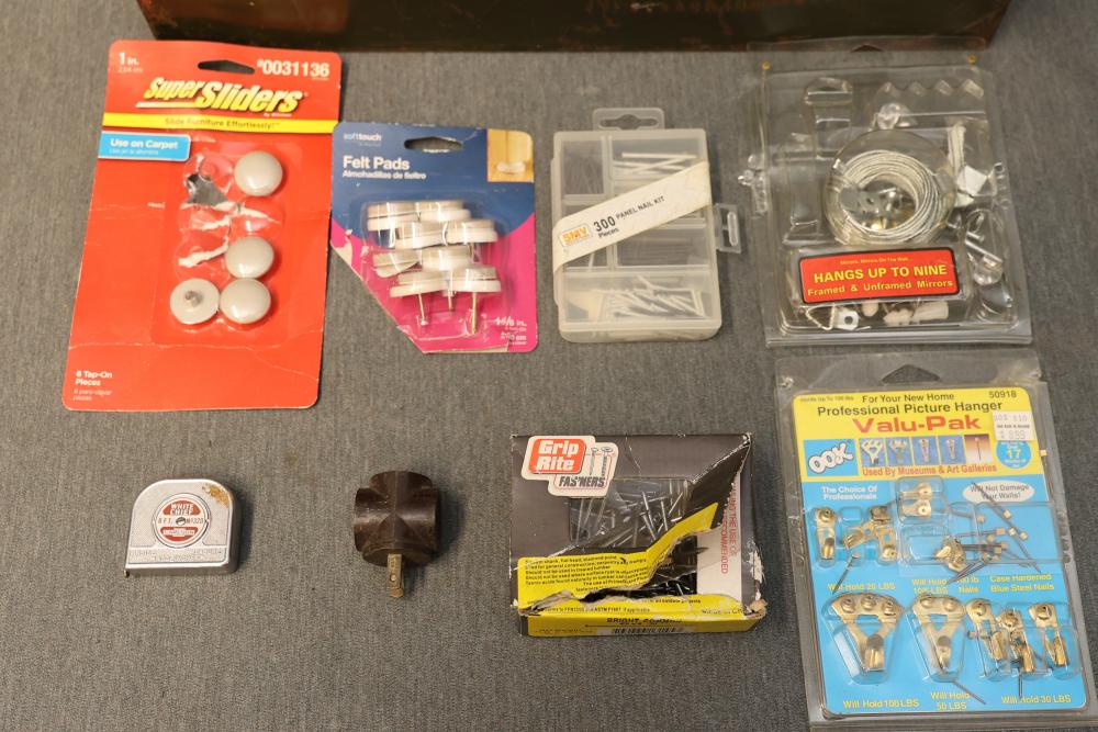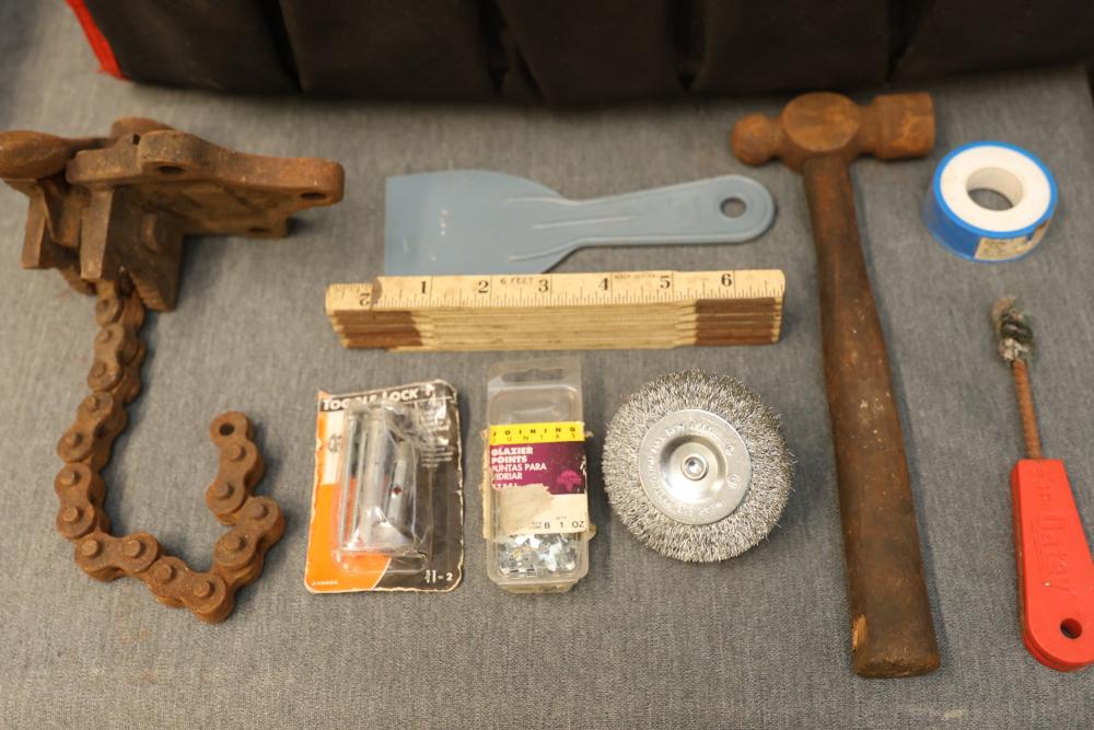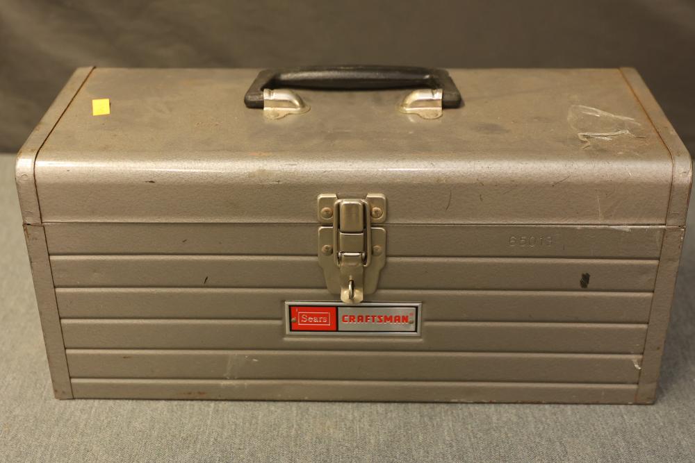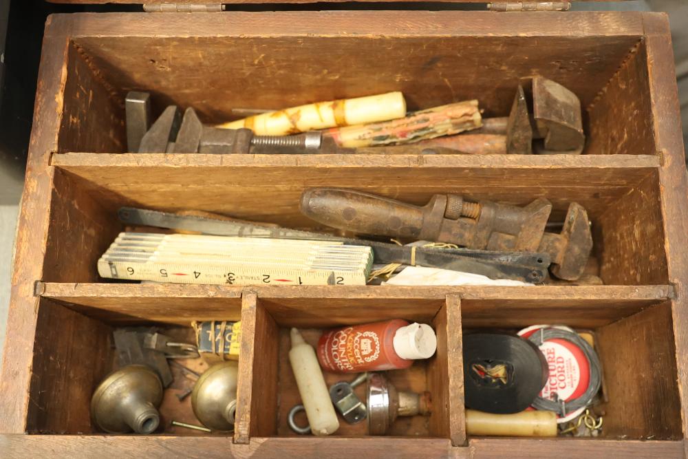 Toolboxes, Tools, Doorknob Sets, and Accessories. Includes five toolboxes (various tools inside), doorknob sets with some pieces missing, a Master Lock with key, Harris-Dracon TS21 Telephone Test Set, Black and Decker 71960 screwdriver bit organization case (some bits included), tool holsters, a lightbulb changer, and a moving dolly. Pickup only.