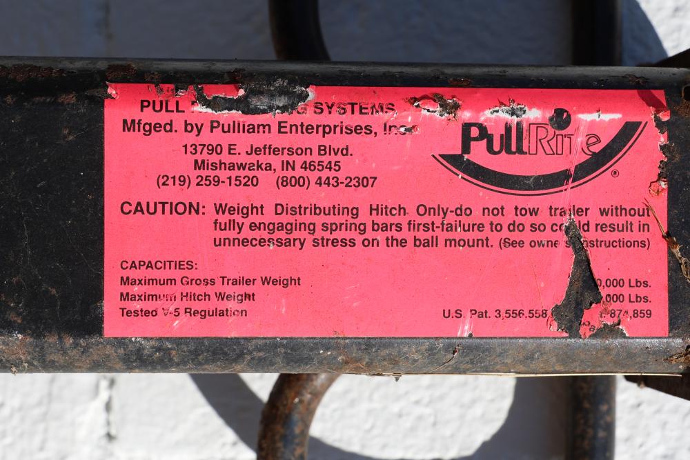 PullRite Weight Distributing Hitch with 2 Inch Receiver Opening and 56 Inch Length. Manufactured by Pulliam Enterprises, Inc., this hitch includes a 2 inch square receiver opening and measures 56 inches in length. The label specifies a maximum gross trailer weight of 10,000 lbs and a maximum hitch weight of 1,000 lbs. Pickup only.