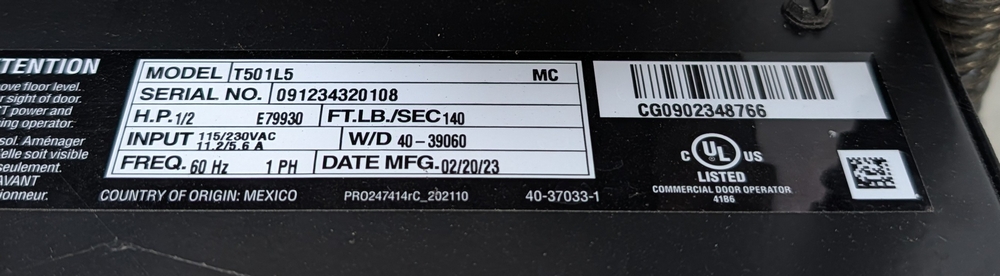 2023 Lift Master Model T501L5 Garage Door Opener; Operated as intended when removed. Removed from 14ft overhead doors. Qty 1. Photos shown for reference.