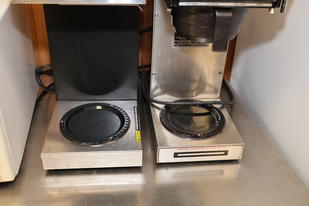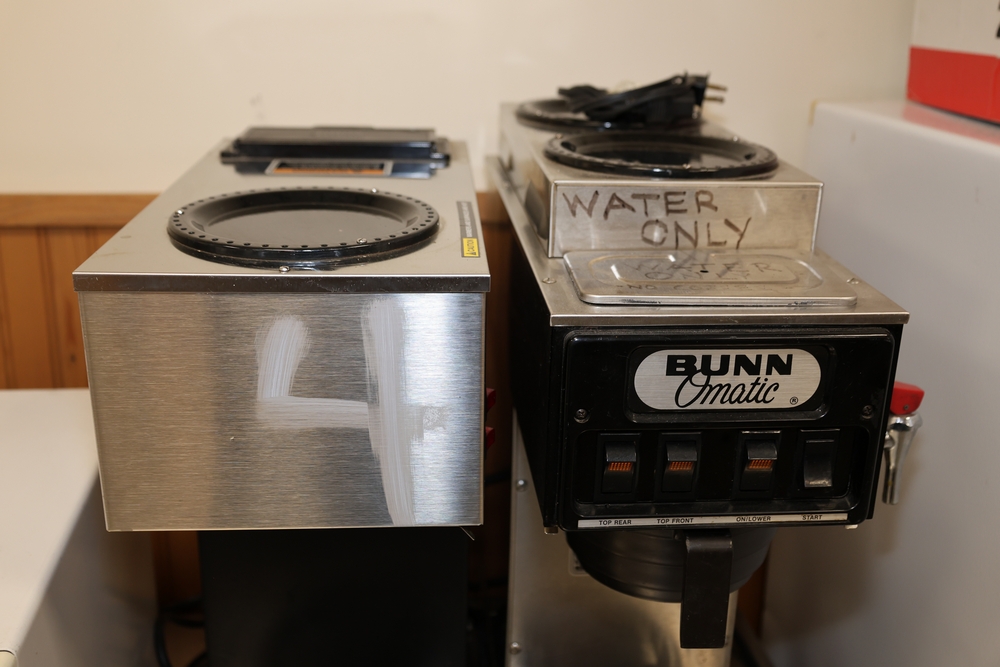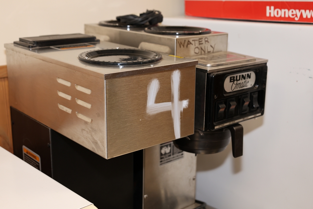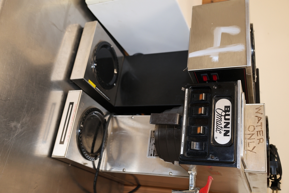 Items include Kyocera standup copy machine; Bunn coffee machines; Mastercraft commercial floor cleaner/buffer; vintage Globe commercial slicing machine; vintage Kodak projector; vintage poker tables; rubber kitchen interlocking floor mat; assorted steak knives; coffee cups/saucers; dinner plates; Minolta scanner; GE microwave; vintage fire extinguisher; vintage Indian pack; metal roll-up shutter & more. Items are located in Hopewell Junction, NY.