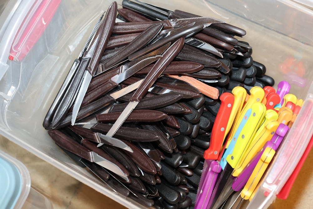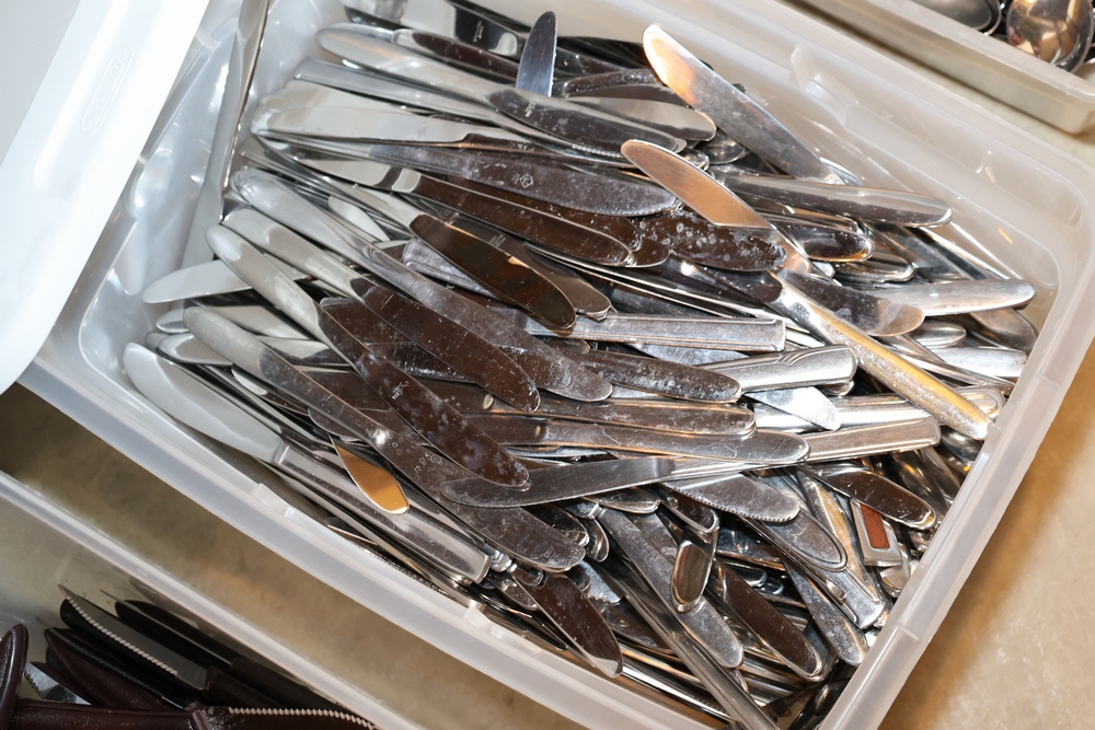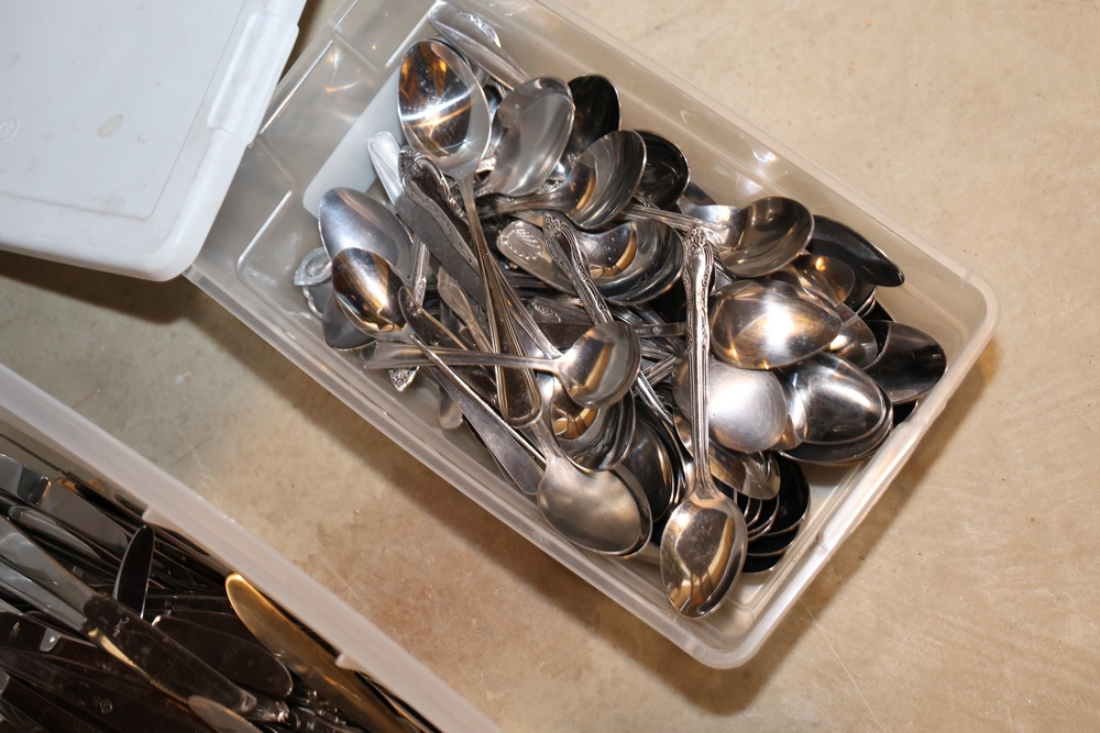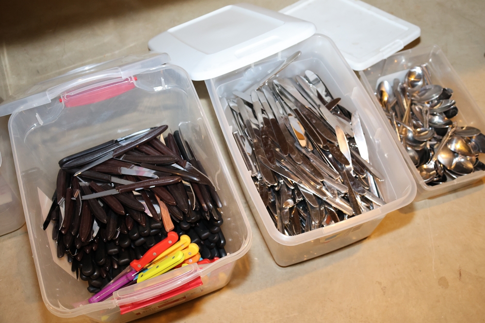 Steak Knives/Assorted Forks/Knives/Spoons, 300 assorted steak knives, 600 assorted dinner knives, 78 assorted spoons.