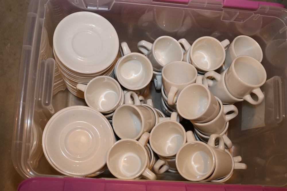 Items include Kyocera standup copy machine; Bunn coffee machines; Mastercraft commercial floor cleaner/buffer; vintage Globe commercial slicing machine; vintage Kodak projector; vintage poker tables; rubber kitchen interlocking floor mat; assorted steak knives; coffee cups/saucers; dinner plates; Minolta scanner; GE microwave; vintage fire extinguisher; vintage Indian pack; metal roll-up shutter & more. Items are located in Hopewell Junction, NY.